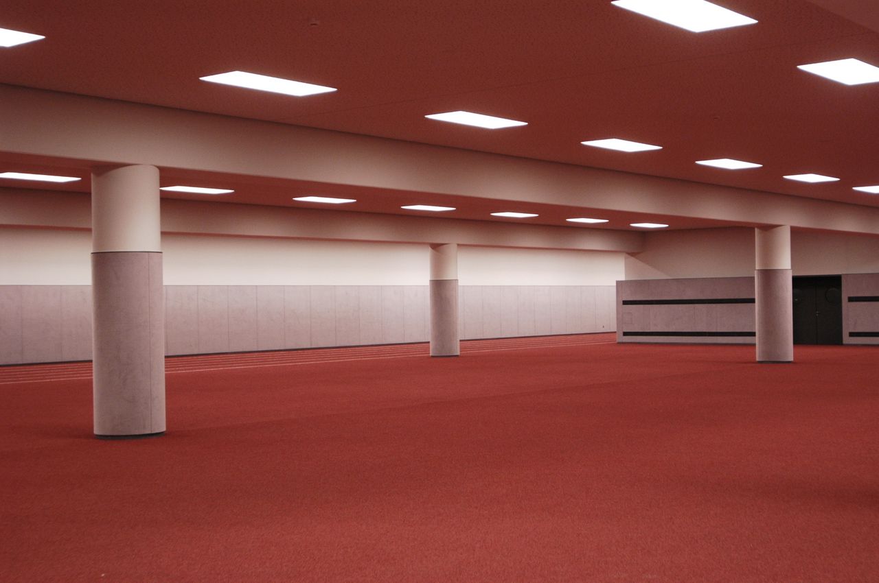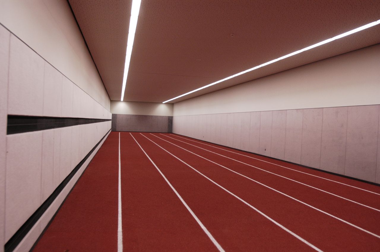 Unter dem großen Olympiastadion liegt die Aufwärmhalle, eine schlichte, minimalistische Sporthalle, in der sich die Athleten vorbereiten können, bevor sie ins Rampenlicht treten. Mit ihren makellosen Laufbahnen, klaren Linien und der industriellen Beleuchtung strahlt dieser unterirdische Raum eine raue, leistungsstarke Energie aus - perfekt für dynamische Film-, Foto- und Eventproduktionen.