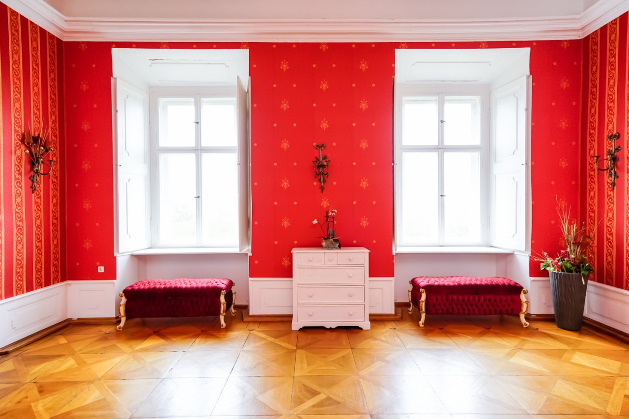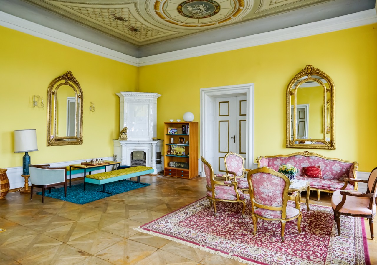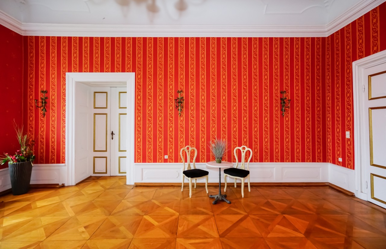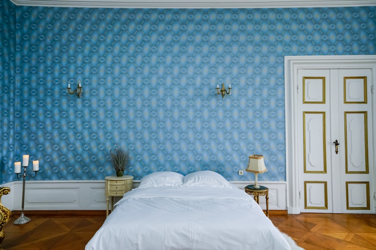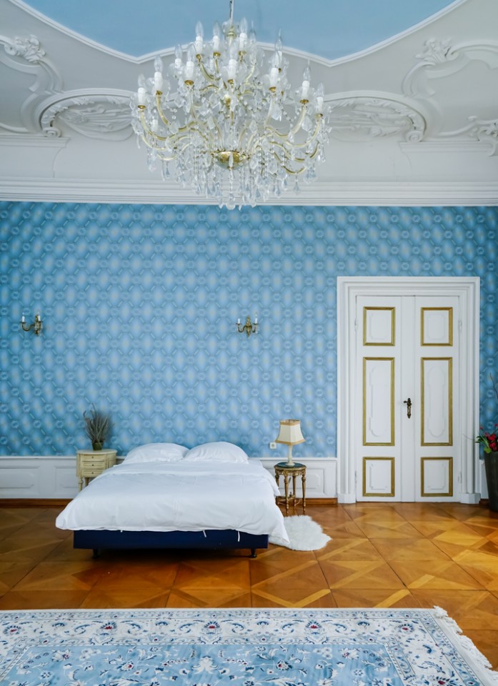 Viele der Zimmer haben blau-weiße, pastellfarbene Wände oder leidenschaftliche Rot- und Goldtöne, und an den Altbaudecken sind noch viele Gemälde und Stuckarbeiten erhalten.