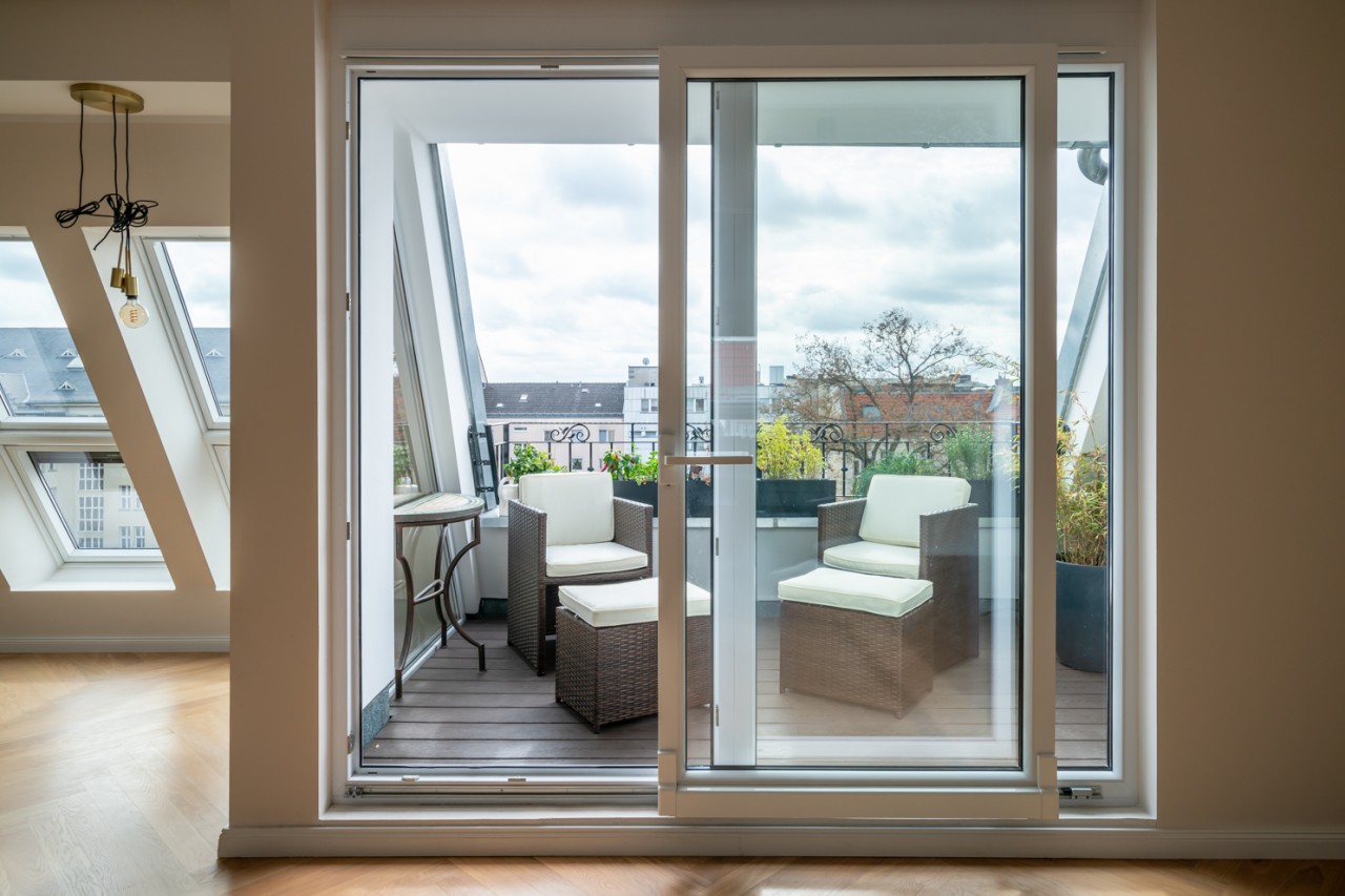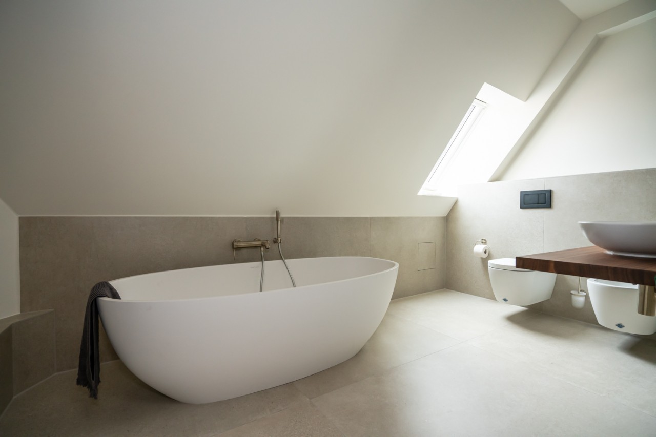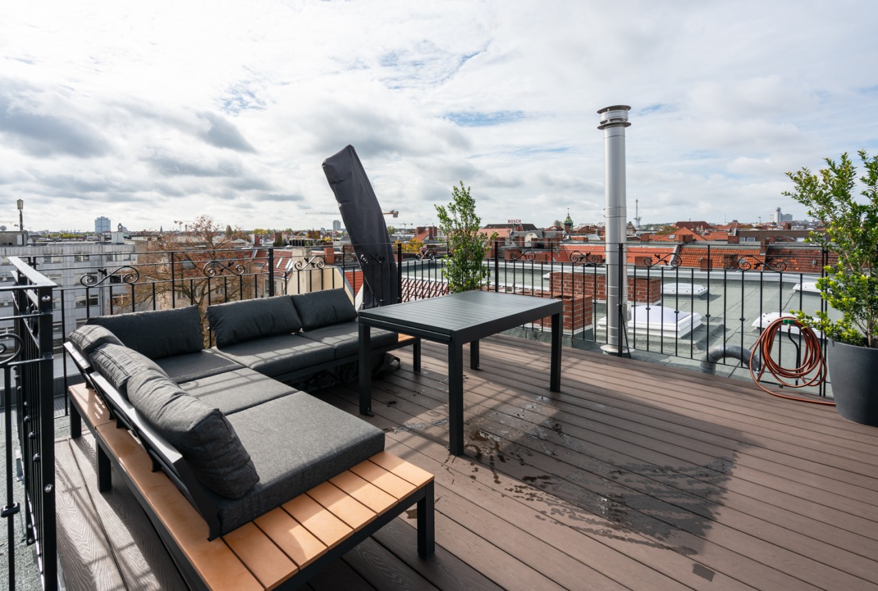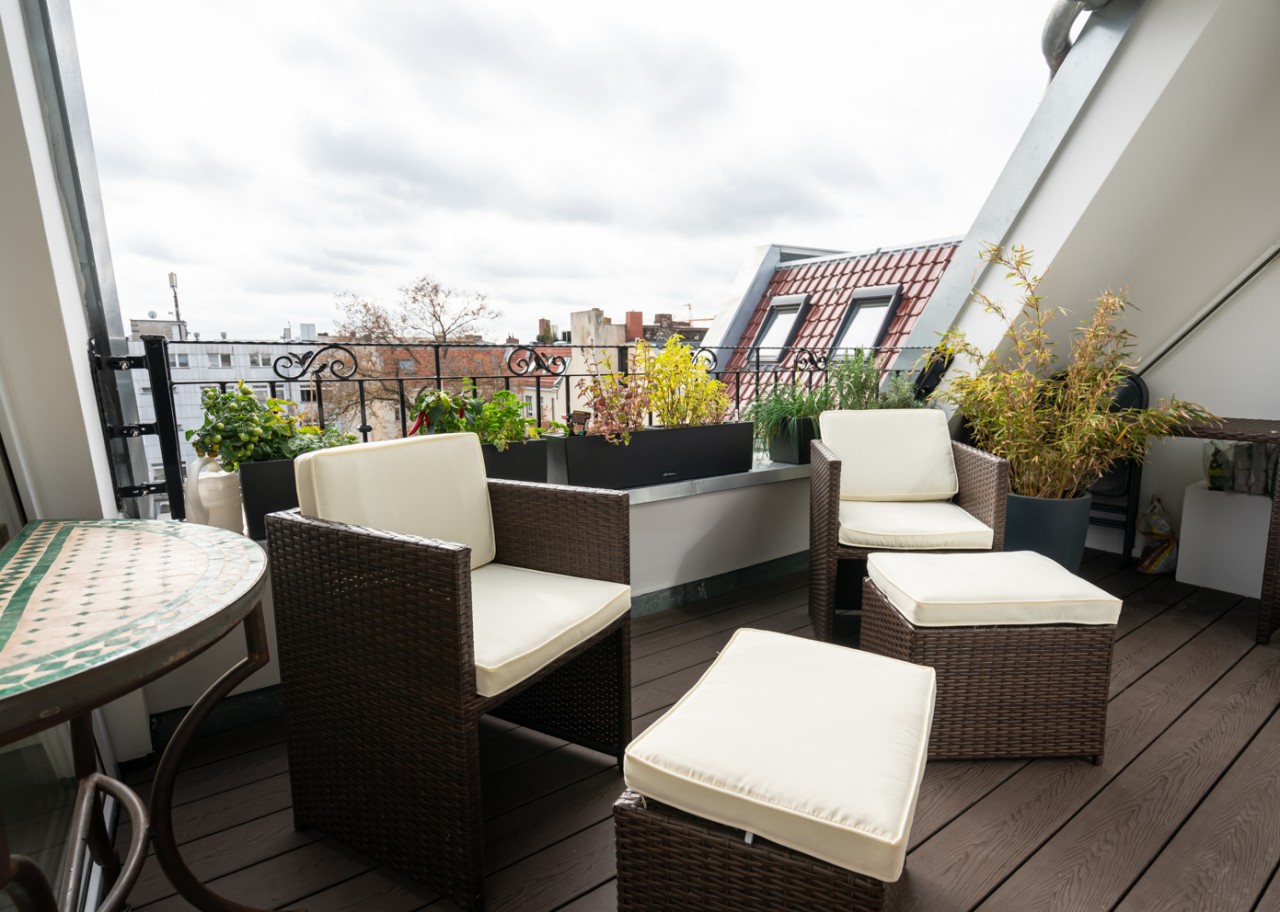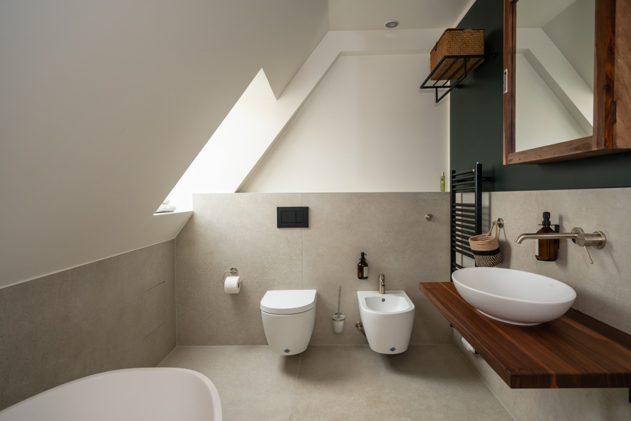 Es verfügt über traditionelle Backsteinmauern aus dem 19. Jahrhundert, eine 360-Grad-Dachterrasse und einen nach Süden ausgerichteten Balkon. Der riesige Wohn-/Essbereich verfügt über eine Designerküche mit integriertem Weinkühler, Herdanlage und einem modernen Holzkamin von Focus. Die beiden Bäder sind mit freistehenden Victoria & Albert-Badewannen und Villeroy & Boche-Aufsatzwaschbecken ausgestattet, das Gäste-WC mit einem Forzalaqua-Waschbecken. Außerdem gibt es zwei Schlafzimmer, eines mit einem Doppelbett und eines mit einem Schlafsofa und einem Fernseher, beide mit charakteristischen Backsteinwänden aus dem 19.