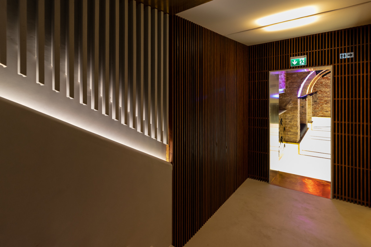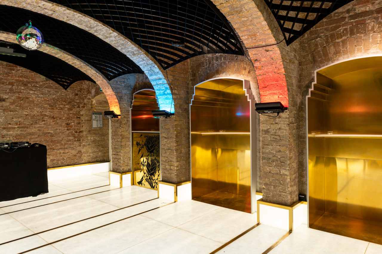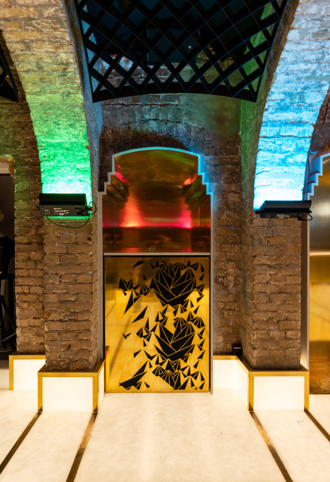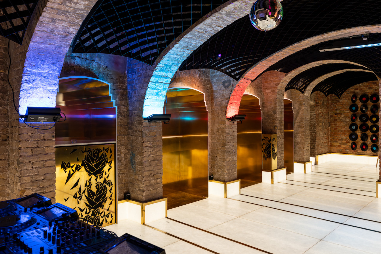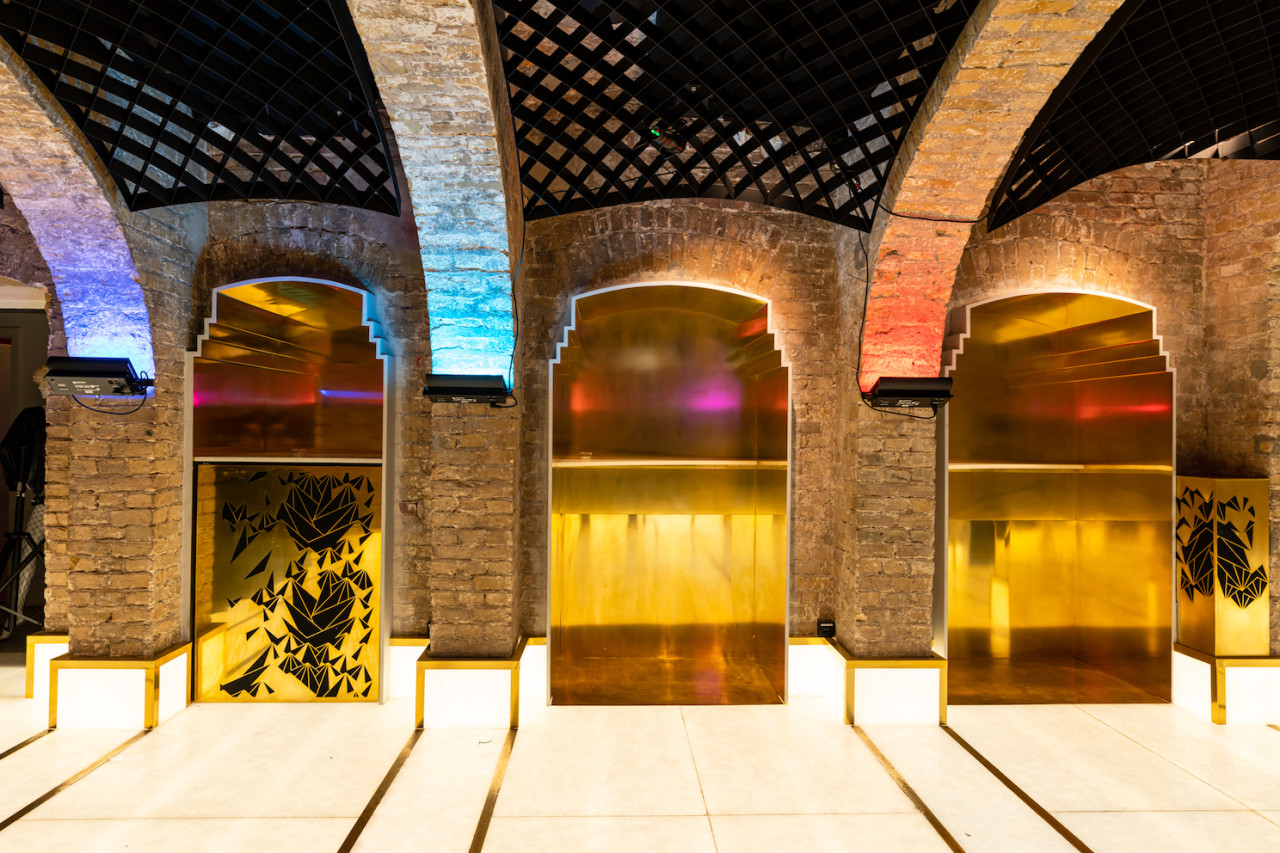 Descending into this immersive subterranean venue, guests are enveloped in a dramatic choreography of color, texture, and light. Vaulted brick arches intersect with sleek metallic corridors; ambient LEDs and geometric gold doors punctuate the historic bones with contemporary energy. Each detail, from the matte and polished surfaces to the interplay of rough stone and glossy wood, captures an alluring duality—mystery tempered by refinement, vibrancy balanced by calm. The space is articulated by ascending and descending staircases, inviting discovery at every turn, while illuminated signage and sculptural lighting lend an avant-garde, almost cinematic quality to every transitional moment.