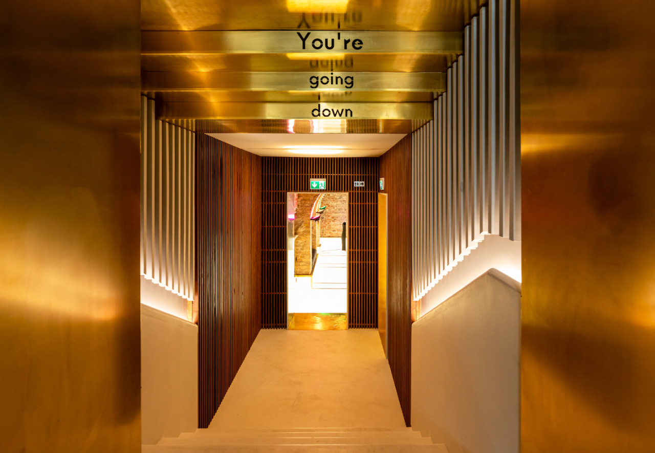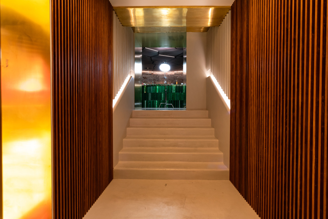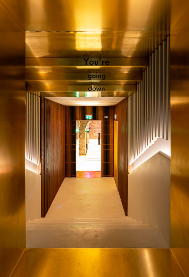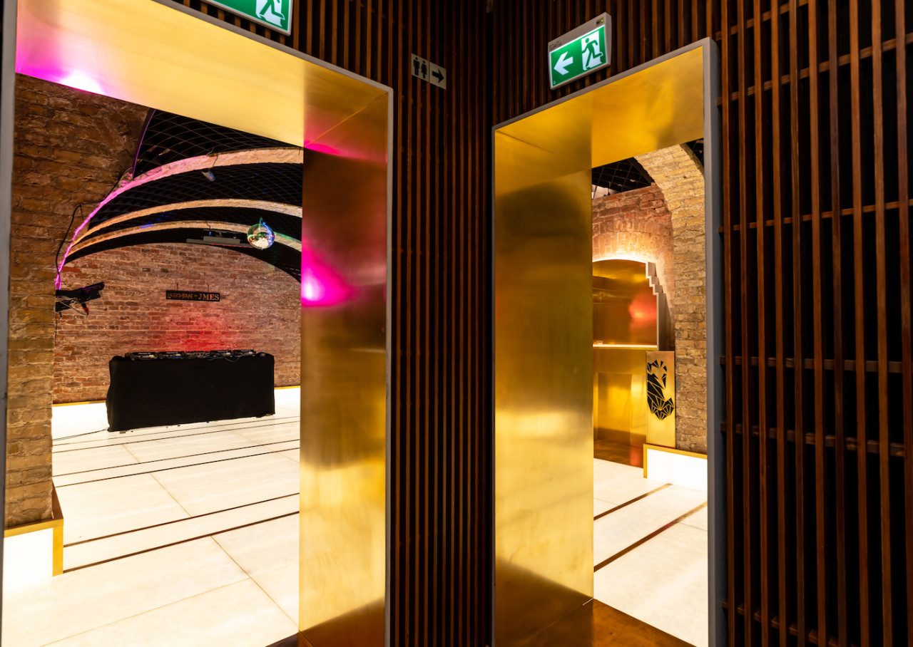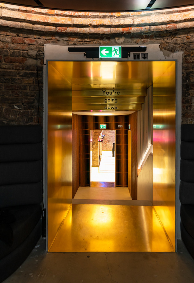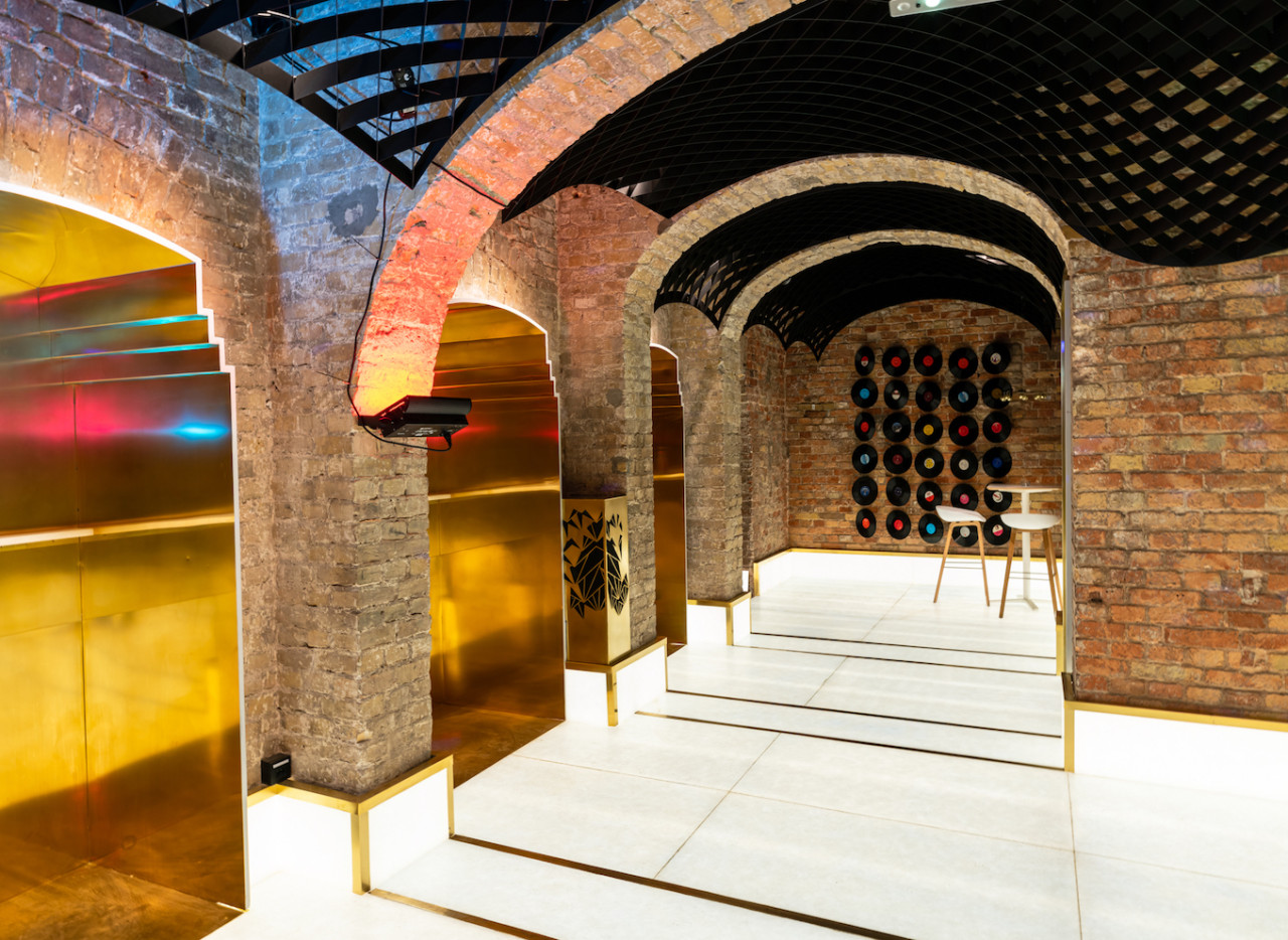 Descending into this immersive subterranean venue, guests are enveloped in a dramatic choreography of color, texture, and light. Vaulted brick arches intersect with sleek metallic corridors; ambient LEDs and geometric gold doors punctuate the historic bones with contemporary energy. Each detail, from the matte and polished surfaces to the interplay of rough stone and glossy wood, captures an alluring duality—mystery tempered by refinement, vibrancy balanced by calm. The space is articulated by ascending and descending staircases, inviting discovery at every turn, while illuminated signage and sculptural lighting lend an avant-garde, almost cinematic quality to every transitional moment.