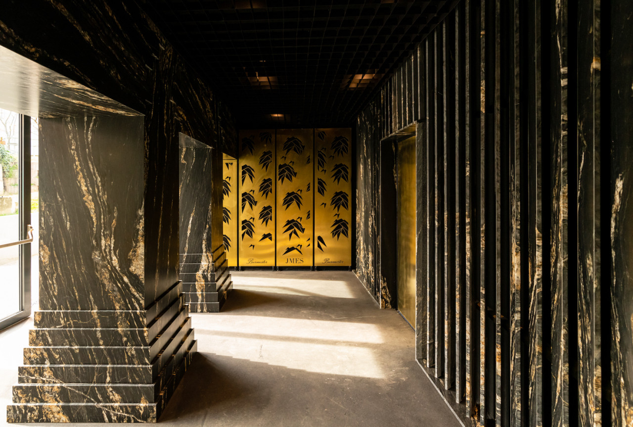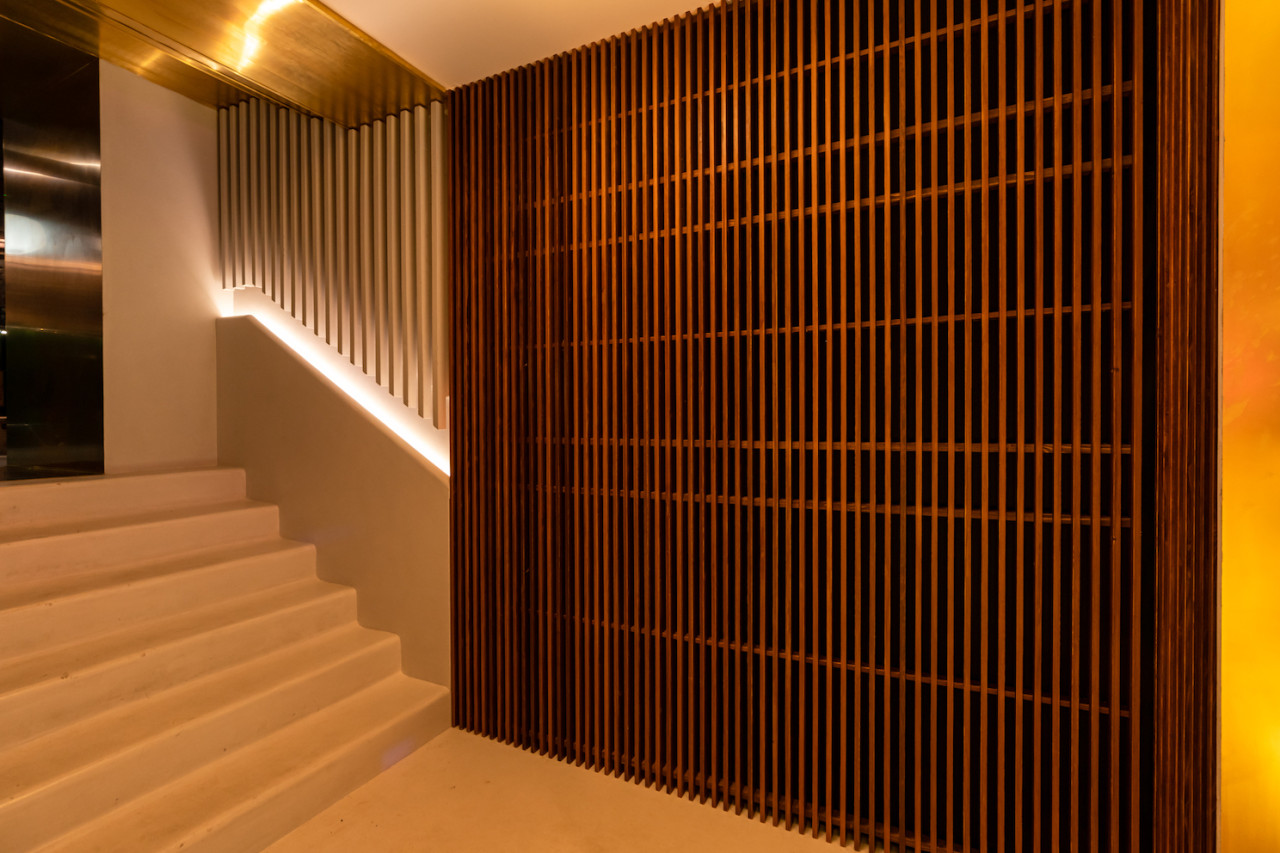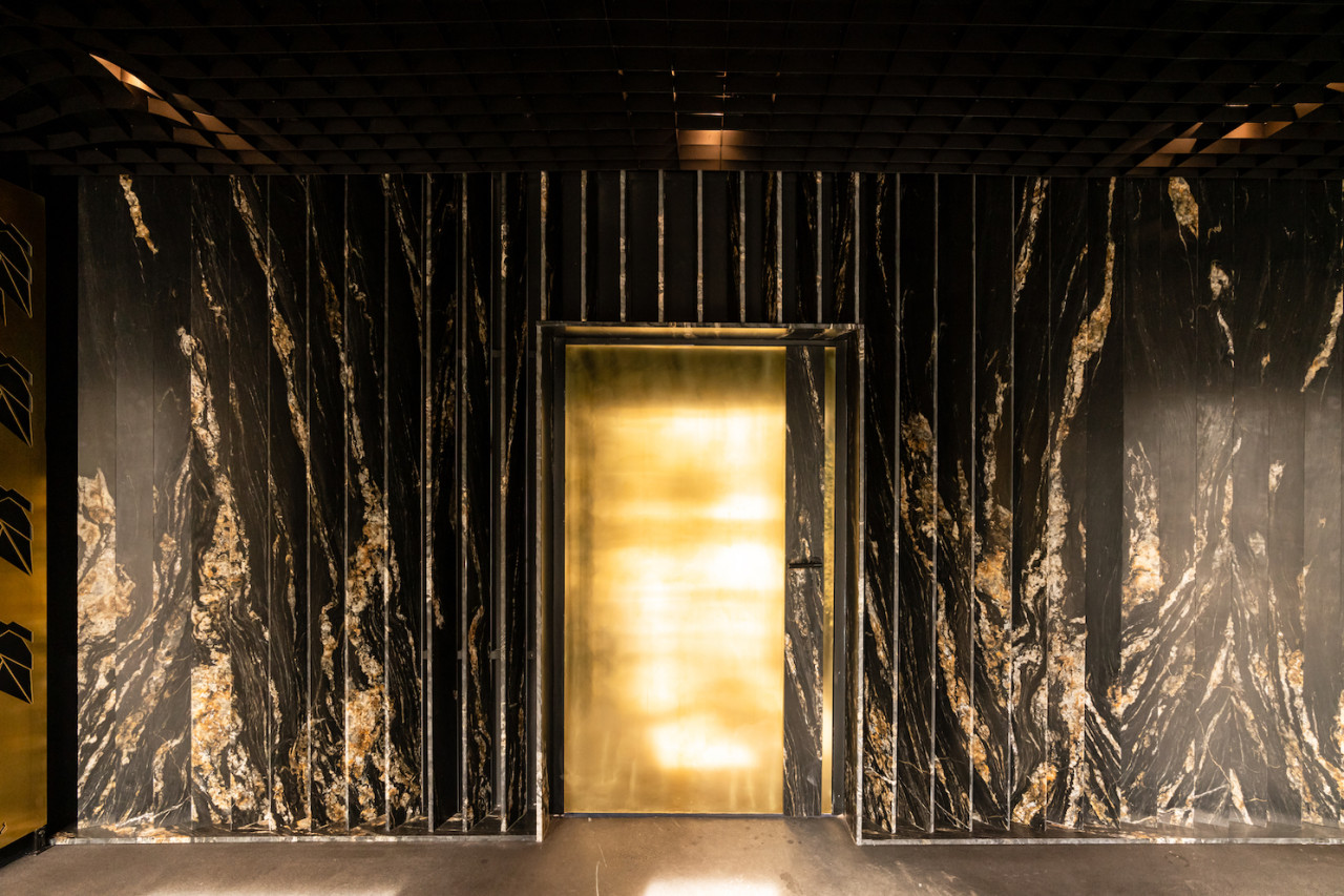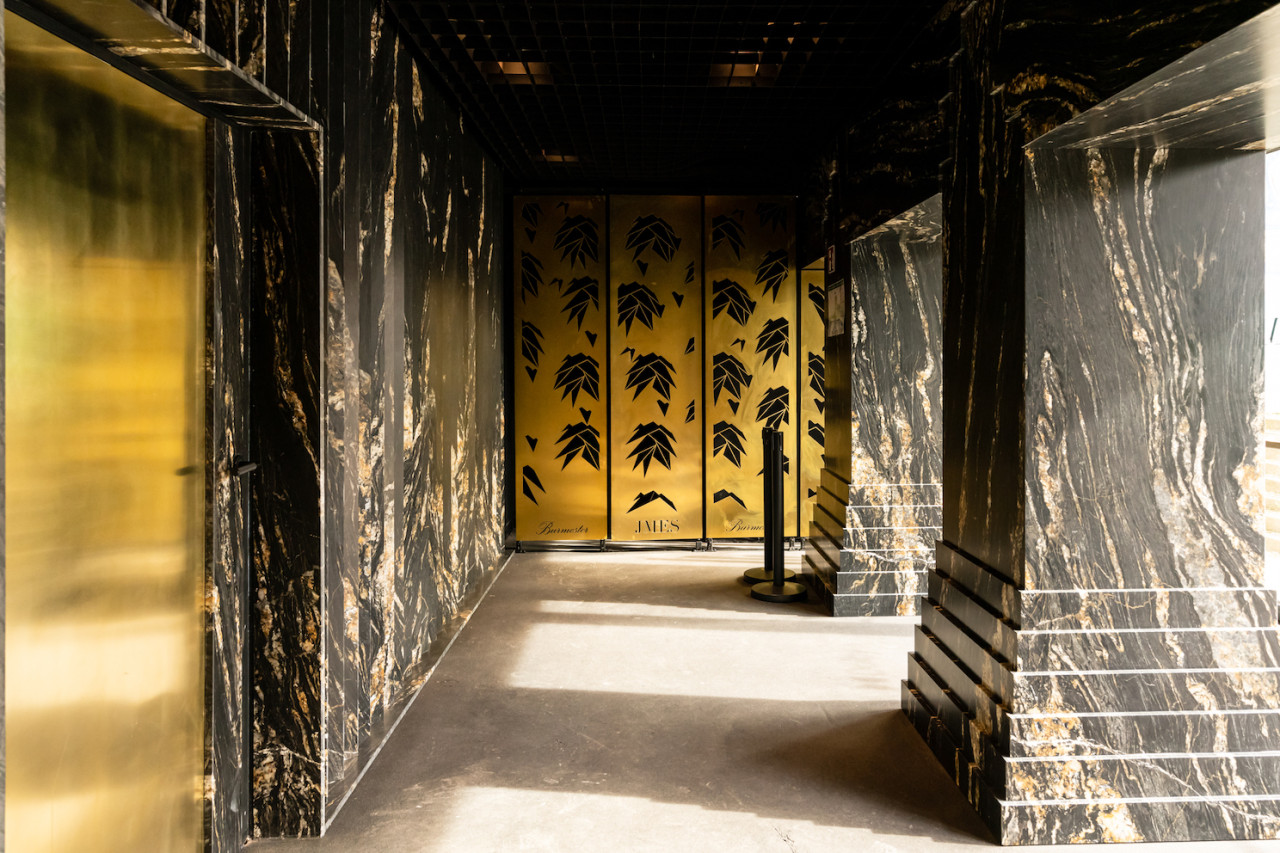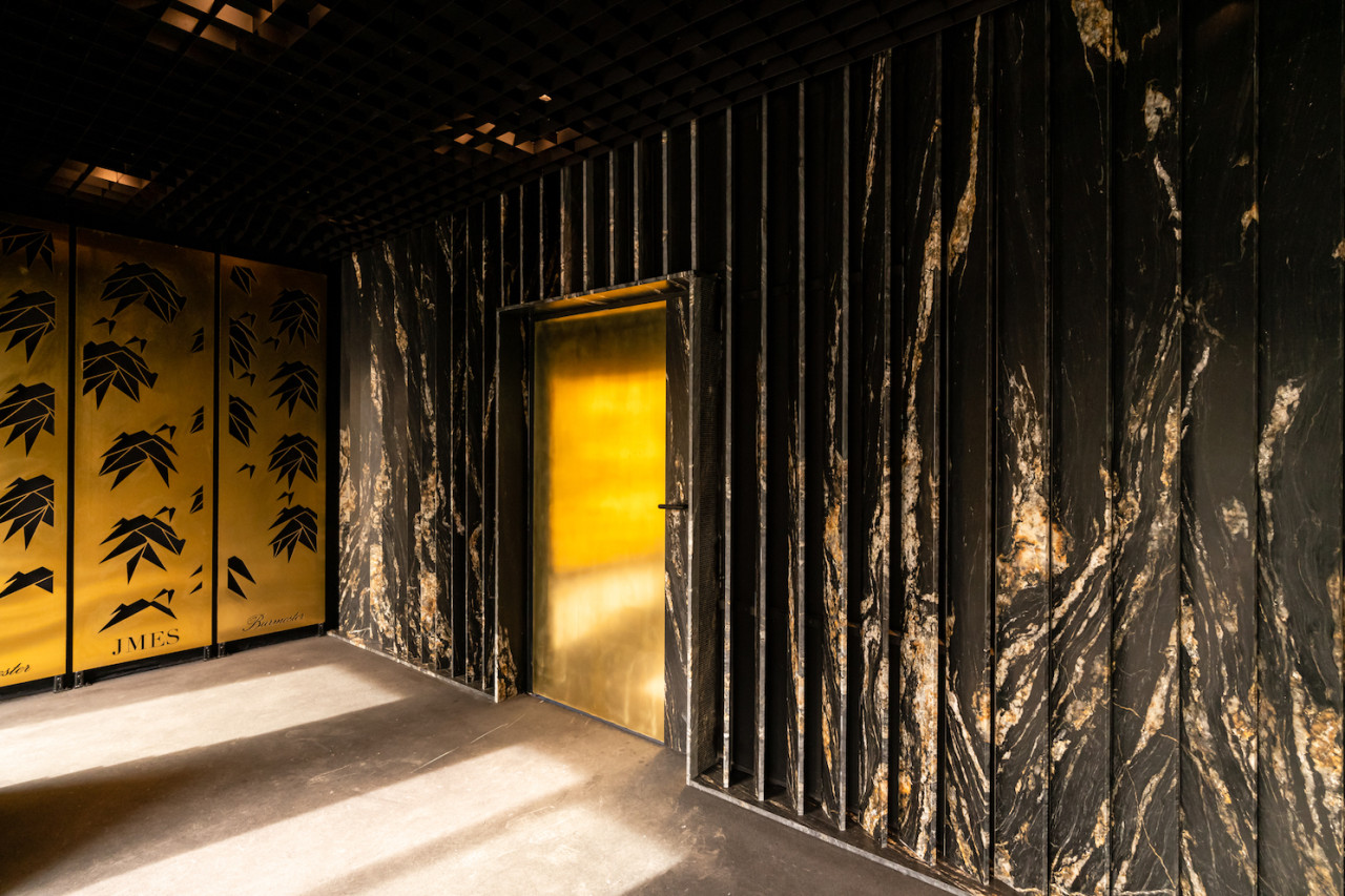 Descending into this immersive subterranean venue, guests are enveloped in a dramatic choreography of color, texture, and light. Vaulted brick arches intersect with sleek metallic corridors; ambient LEDs and geometric gold doors punctuate the historic bones with contemporary energy. Each detail, from the matte and polished surfaces to the interplay of rough stone and glossy wood, captures an alluring duality—mystery tempered by refinement, vibrancy balanced by calm. The space is articulated by ascending and descending staircases, inviting discovery at every turn, while illuminated signage and sculptural lighting lend an avant-garde, almost cinematic quality to every transitional moment.