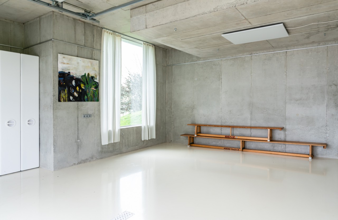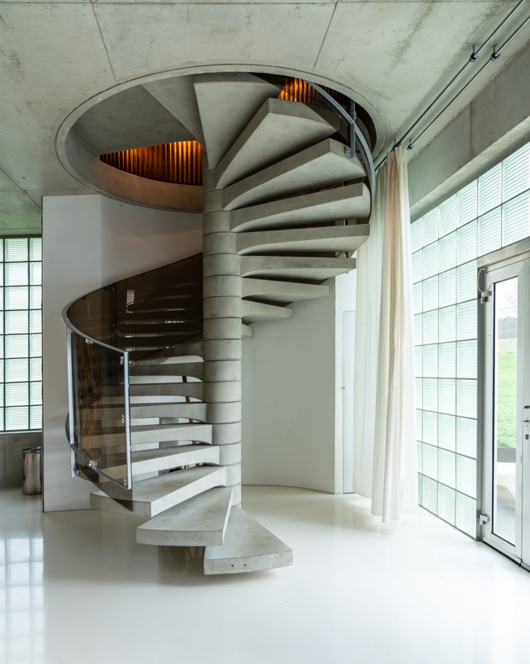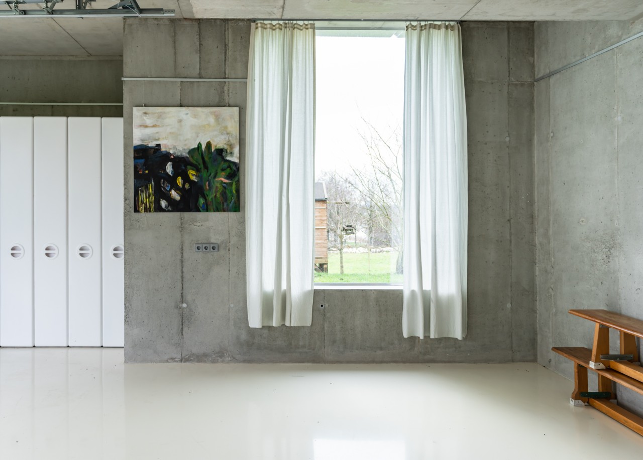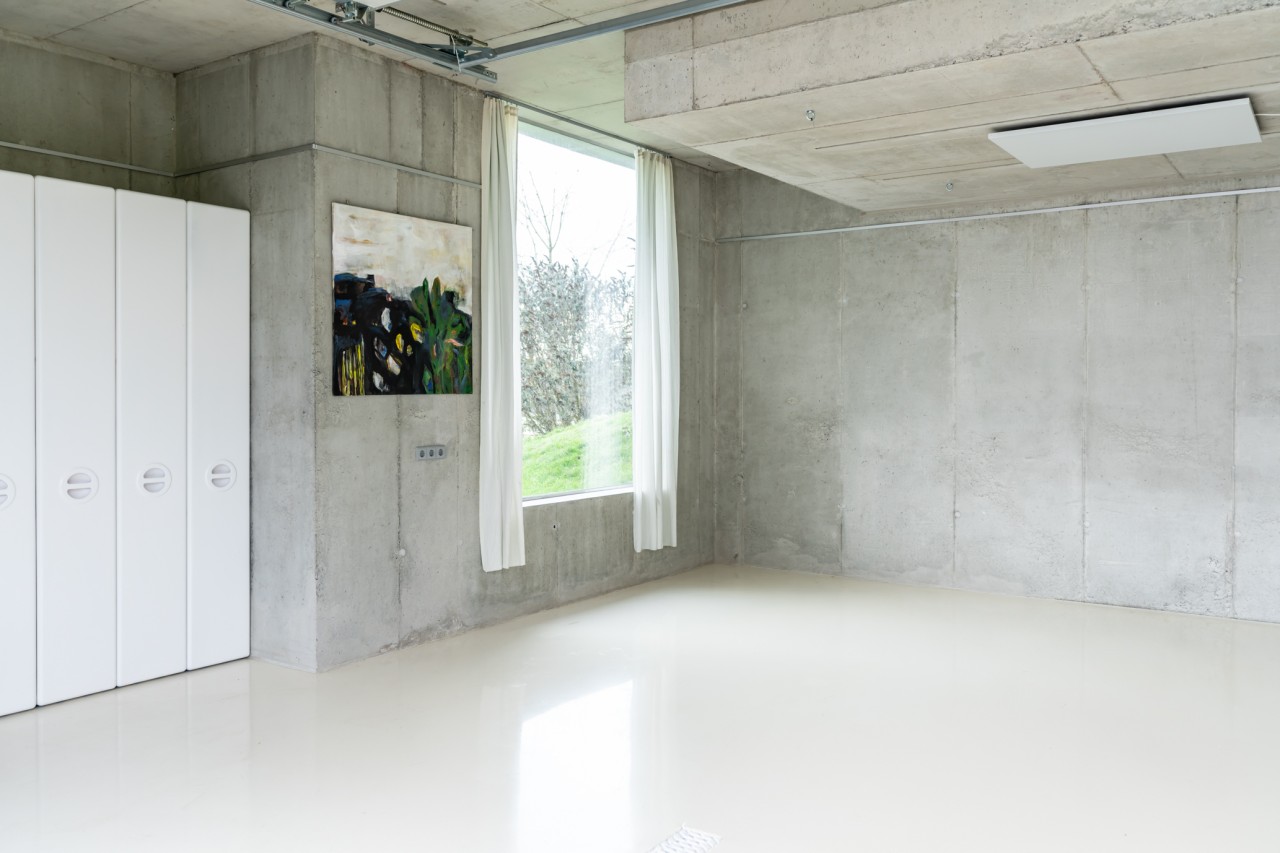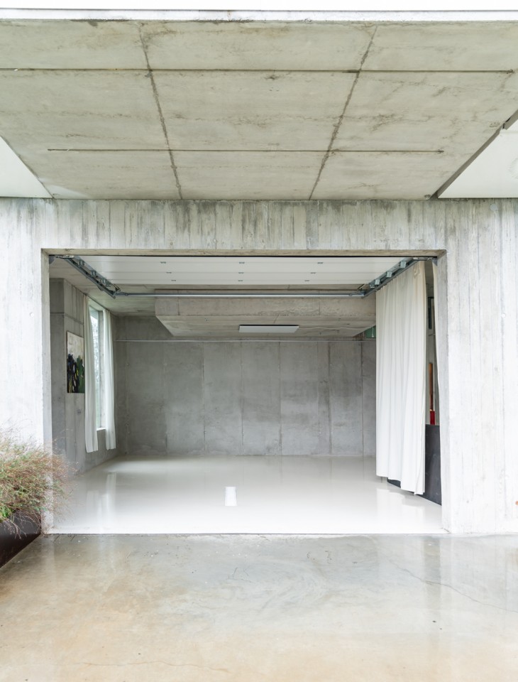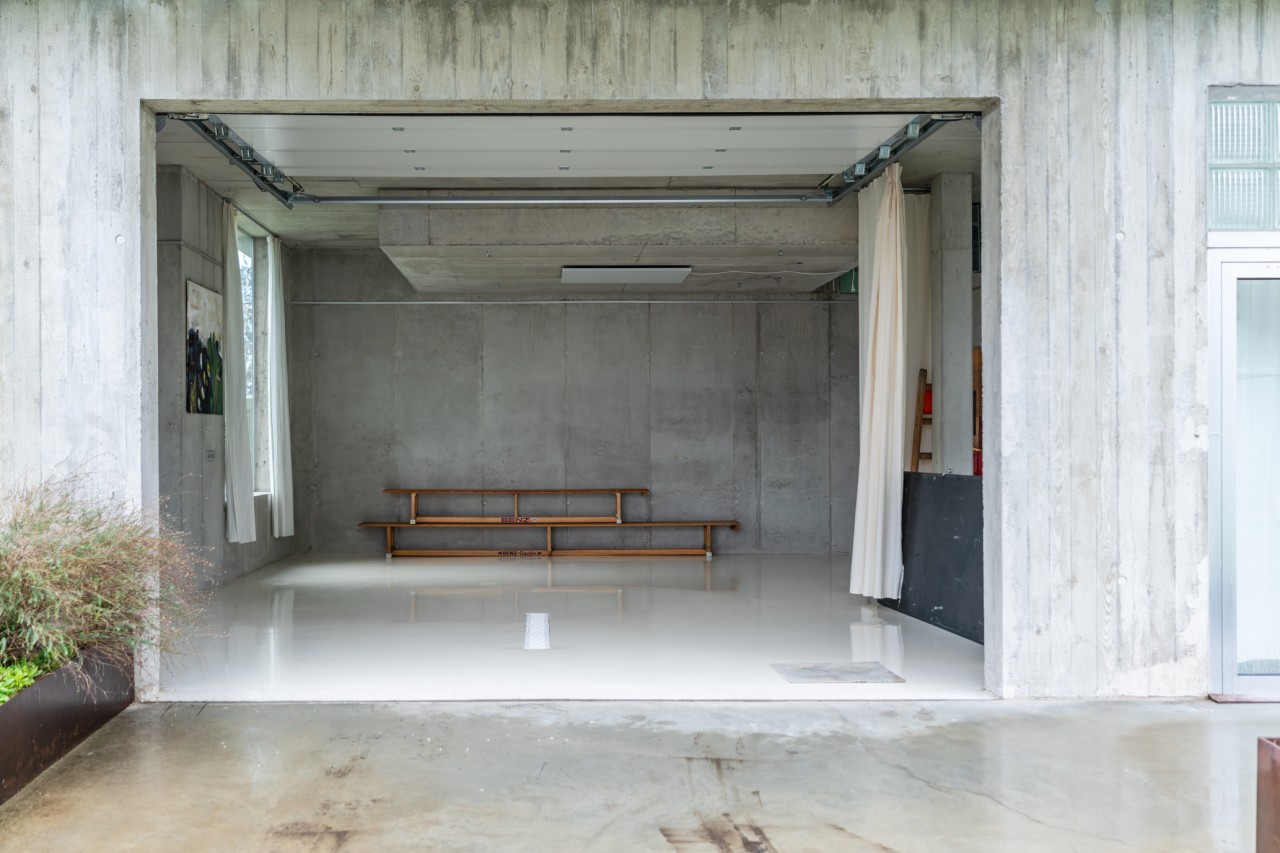 Als Teil des 70's Bungalow, einem originalen 70er-Jahre-Haus mit futuristischem Touch, kommt diese einzigartige Garage. Gebaut aus rohem Beton, weißem monolithischem Epoxidboden und großen hohen Fenstern, die den 70 m2 großen Raum mit Licht durchfluten. Die puristische freitragende Betontreppe hat ein braunes Plexiglasgeländer, das abnehmbar ist.