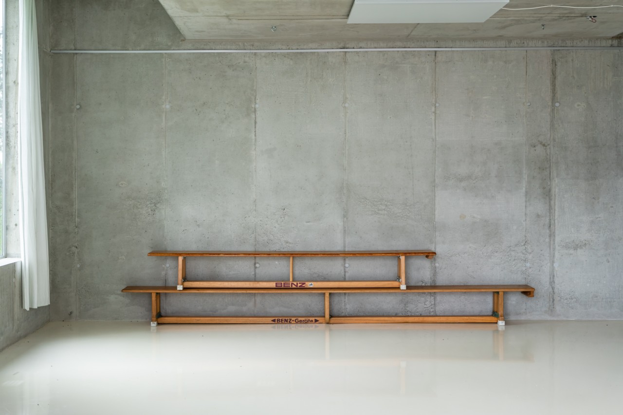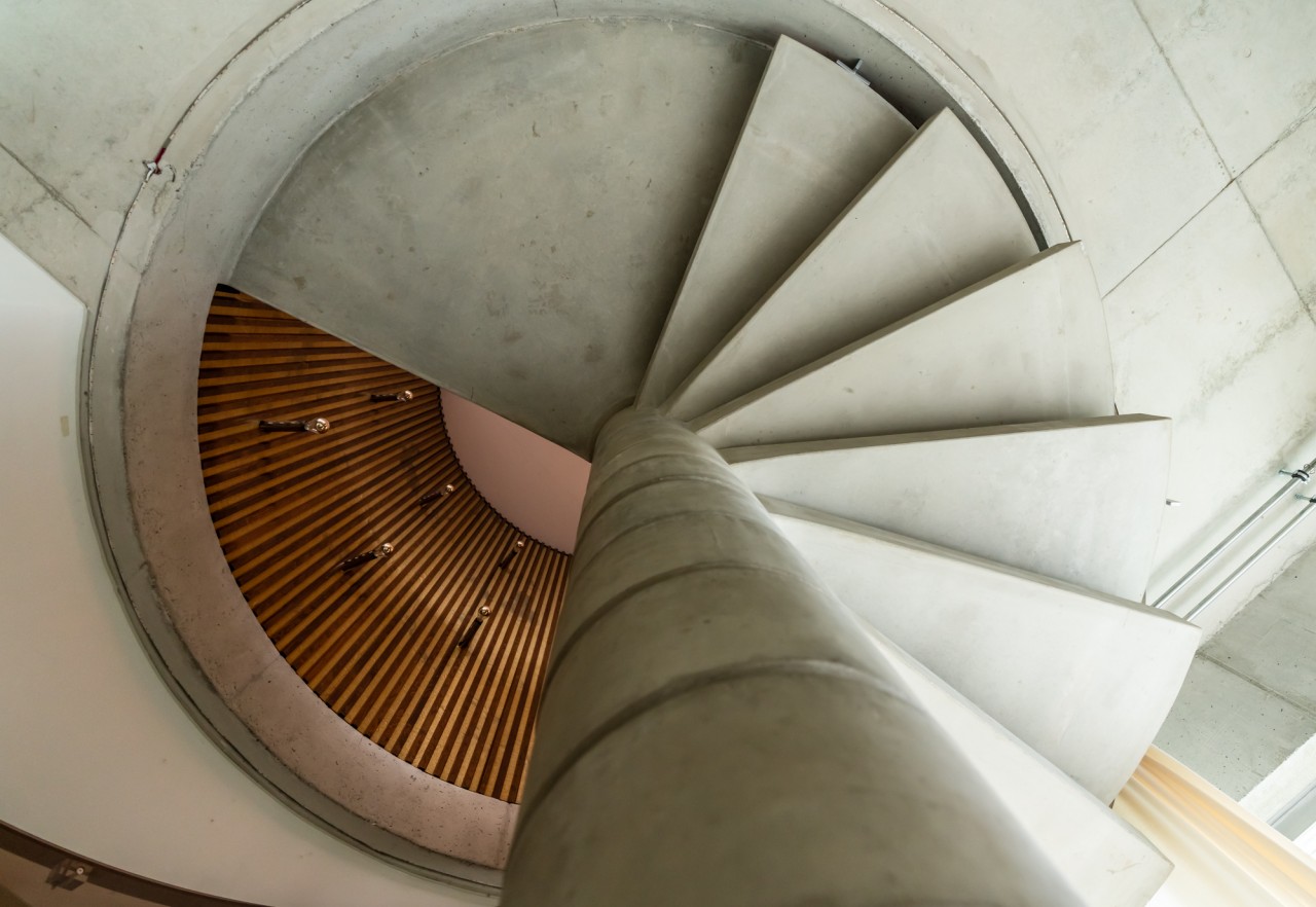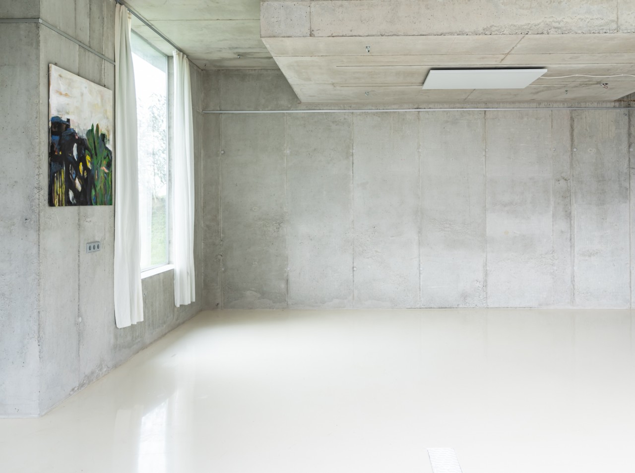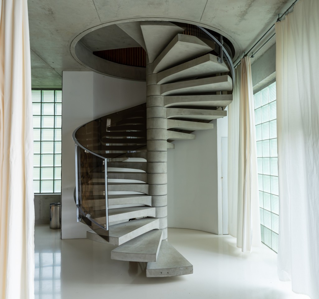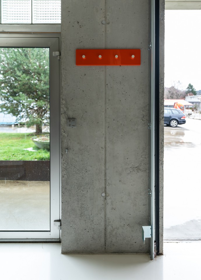 Als Teil des 70's Bungalow, einem originalen 70er-Jahre-Haus mit futuristischem Touch, kommt diese einzigartige Garage. Gebaut aus rohem Beton, weißem monolithischem Epoxidboden und großen hohen Fenstern, die den 70 m2 großen Raum mit Licht durchfluten. Die puristische freitragende Betontreppe hat ein braunes Plexiglasgeländer, das abnehmbar ist.