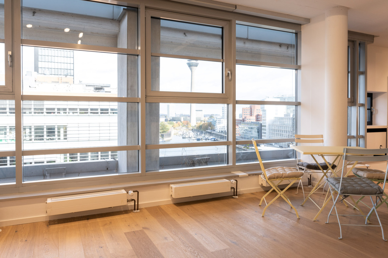 Dürfen wir vorstellen: Unser absolutes Hafenhighlight! Wir sind uns sicher, dass dieses denkmalgeschützte Speichergebäude seit seiner Erbauung im Jahr 1938 schon viel "erlebt" hat. Heute blicken wir aus dem 8. Stock auf den Düsseldorfer Rheinturm, die weltberühmten Gerry-Bauten und das beschauliche Hafenbecken. Atemberaubend beschreibt es wohl am besten!