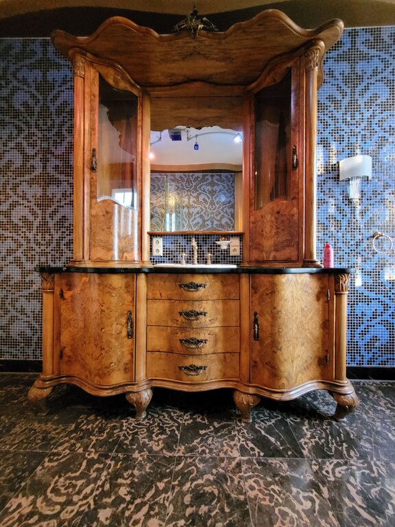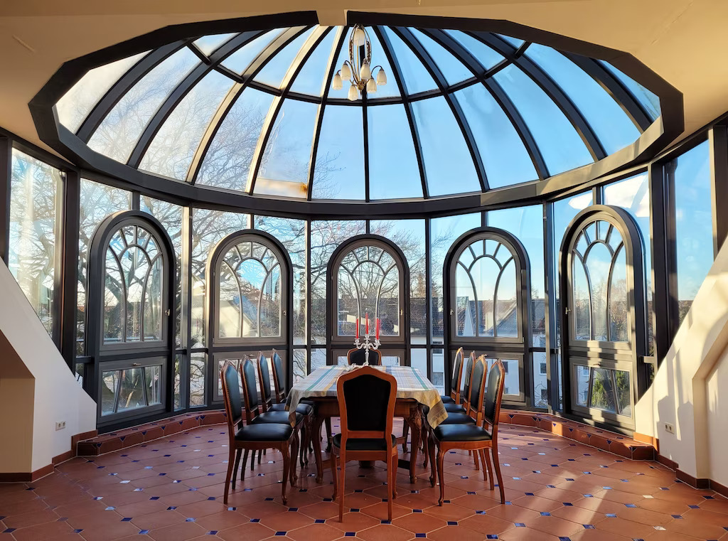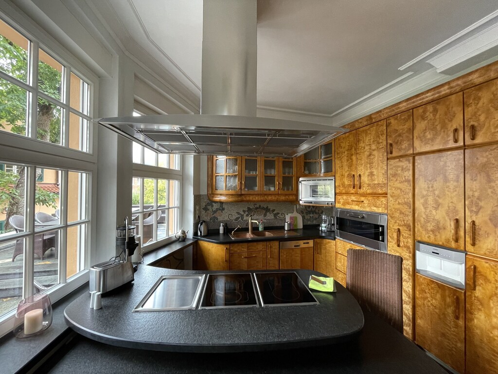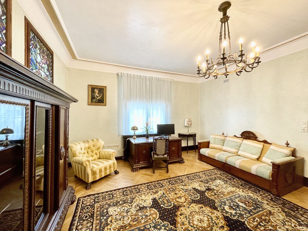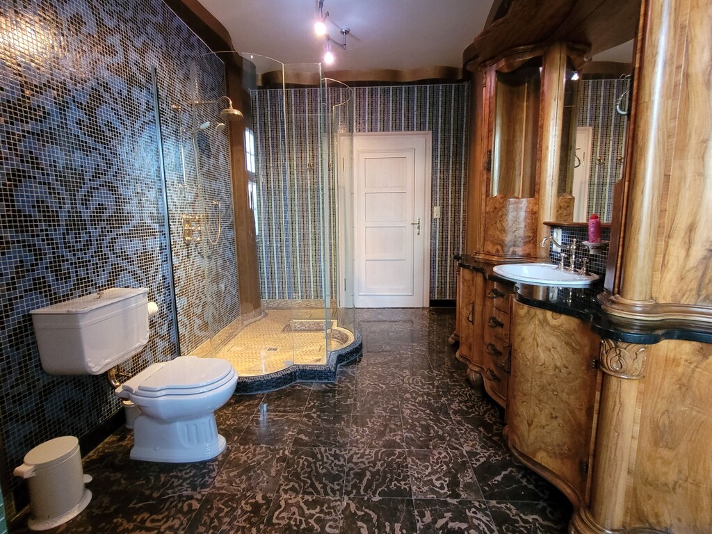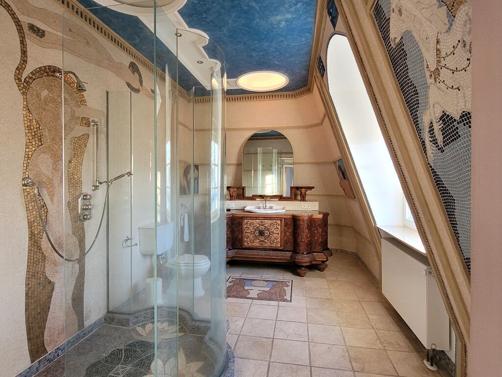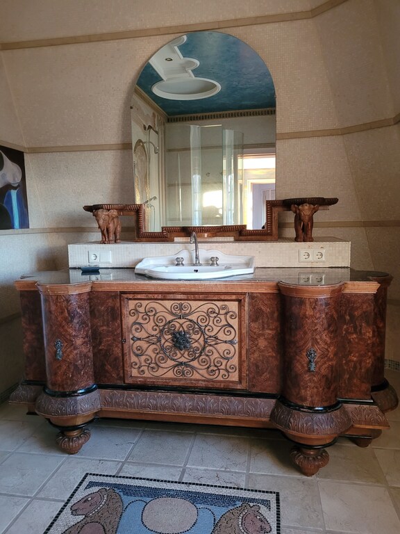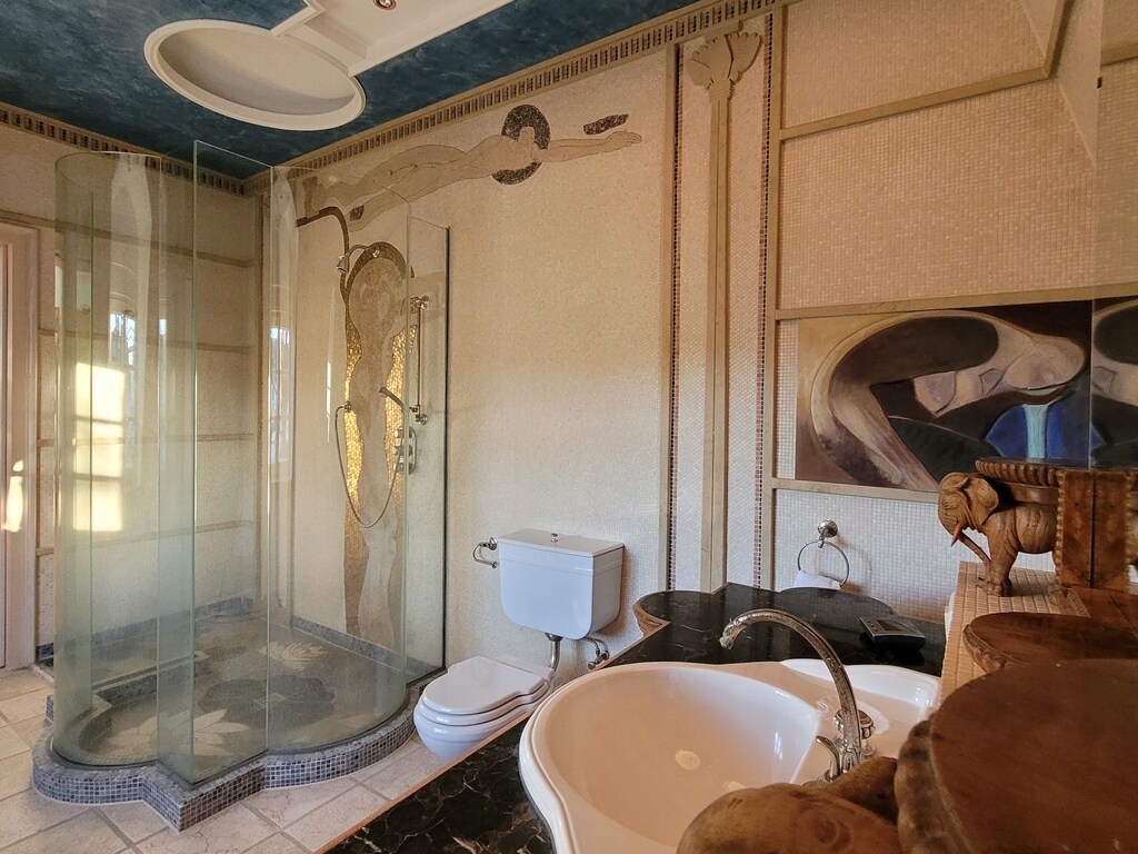 Diese Villa verfügt über einen erstaunlichen Raum mit einer einzigartigen Glaskuppel, Gemälden und Mosaiken an den Wänden, historischen handgefertigten Möbeln und einigen klassischen Designerstücken wie Bretz, Lignet Roset, Edra.