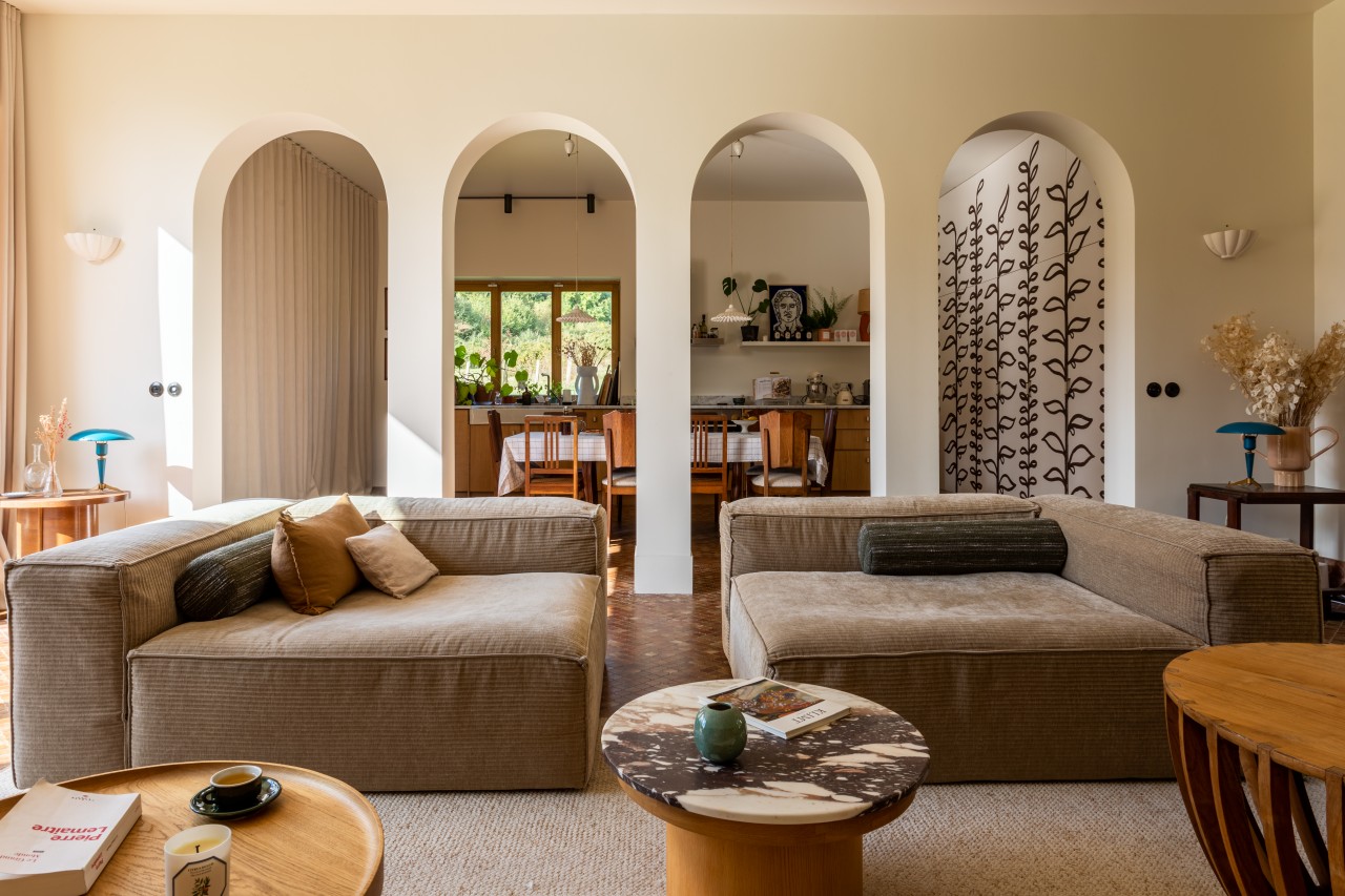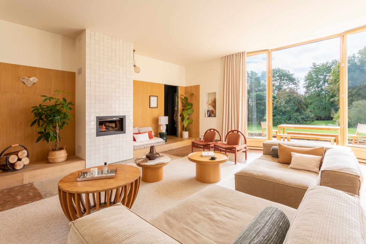 Das Haupthaus verfügt über ein angenehmes Wohnzimmer von 80m2 mit einer voll ausgestatteten Küche, die zu einem schönen Esszimmer und einem Wohnzimmer mit Kamin offen ist.