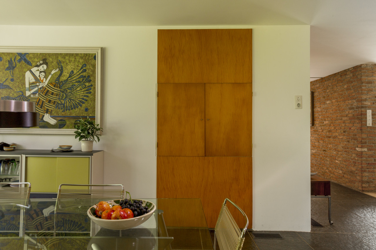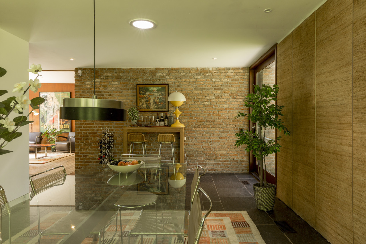Im Inneren ist der Raum eine Zeitkapsel von Vintage-Eleganz. Original holzgetäfelte Wände, Retro-Möbel und farbenfrohes Dekor schaffen eine einzigartige, charaktervolle Kulisse. Mehrere Sitzbereiche sind mit Möbeln aus der Mitte des Jahrhunderts, stimmungsvoller Beleuchtung und strukturierten Teppichen ausgestattet - ideal für Editorial-, Mode- oder Lifestyle-Shootings. Der Speisesaal mit seinen kühnen roten Stühlen und kunstvollen Akzenten verleiht dem Raum Dramatik und Charme.