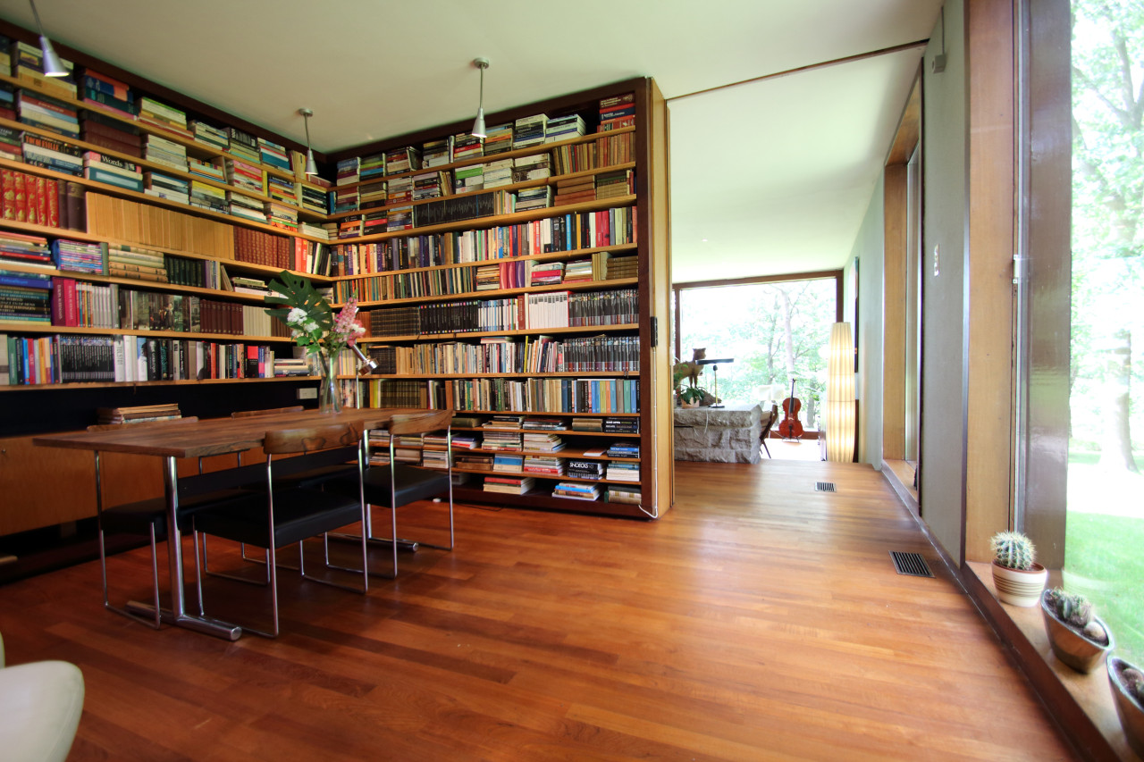 Das Äußere wird von üppigem Grün und offenen Rasenflächen umrahmt, mit großen Fenstern, die natürliches Licht und Waldblicke in jeden Raum einladen. Die niedrigen, horizontalen Linien des Hauses und die Verwendung von warmem Holz, Ziegeln und Stein erinnern an das klassische Design der Mitte des Jahrhunderts.