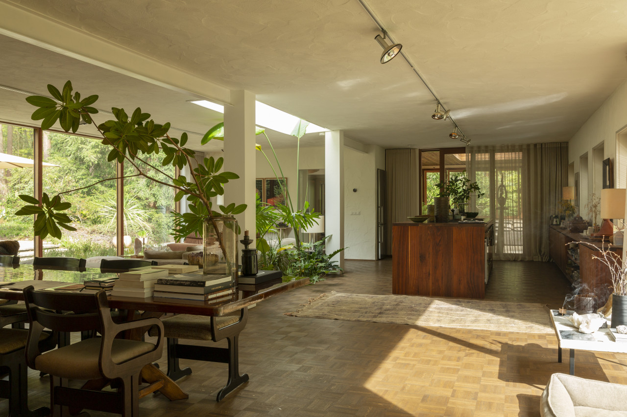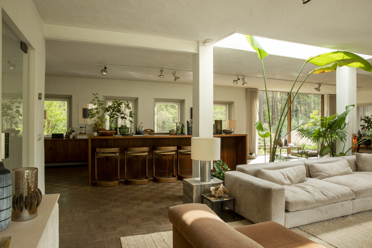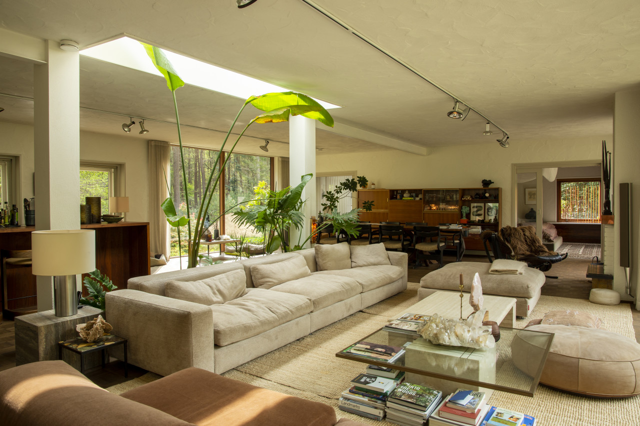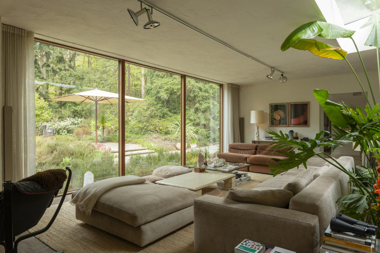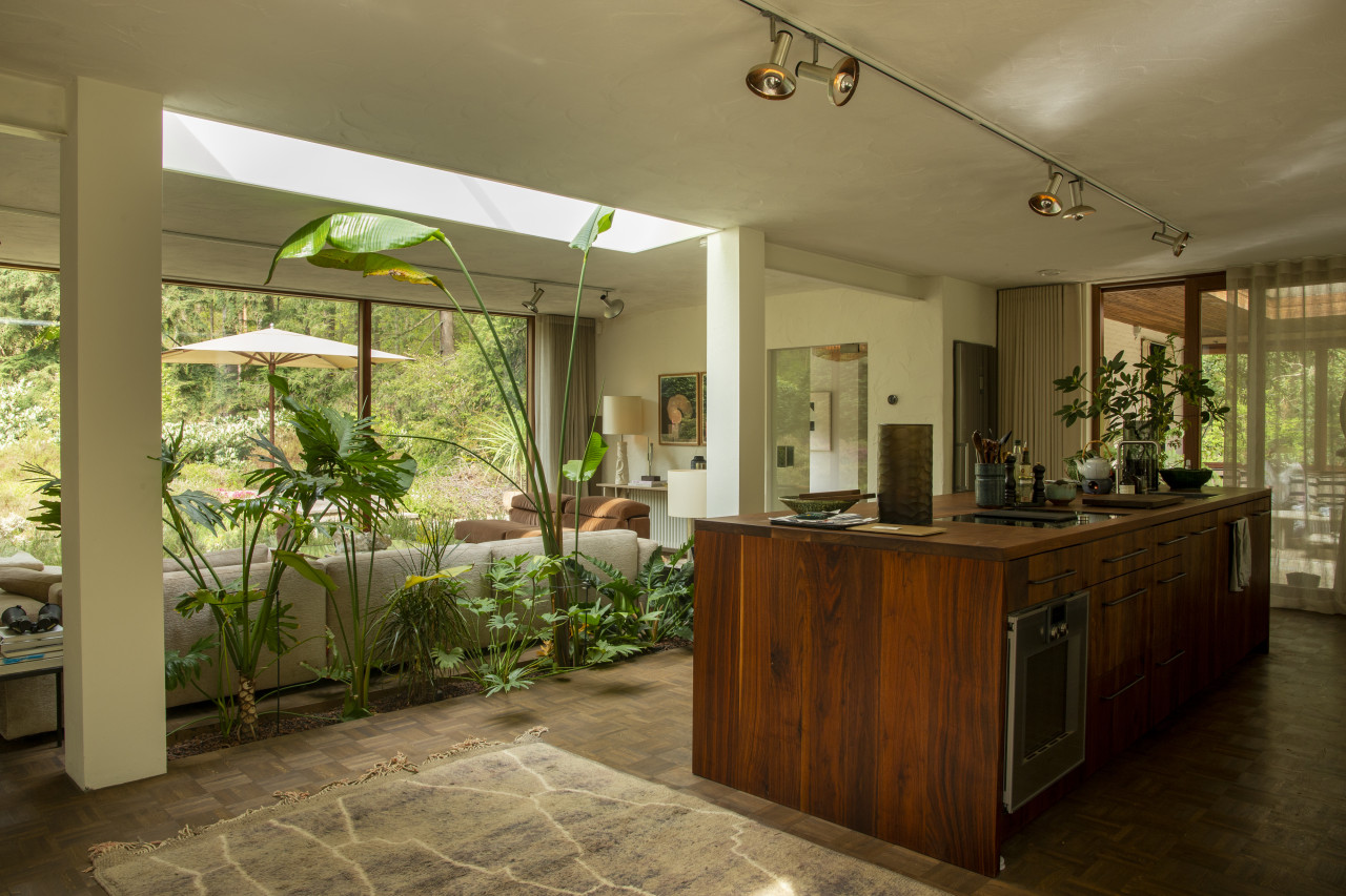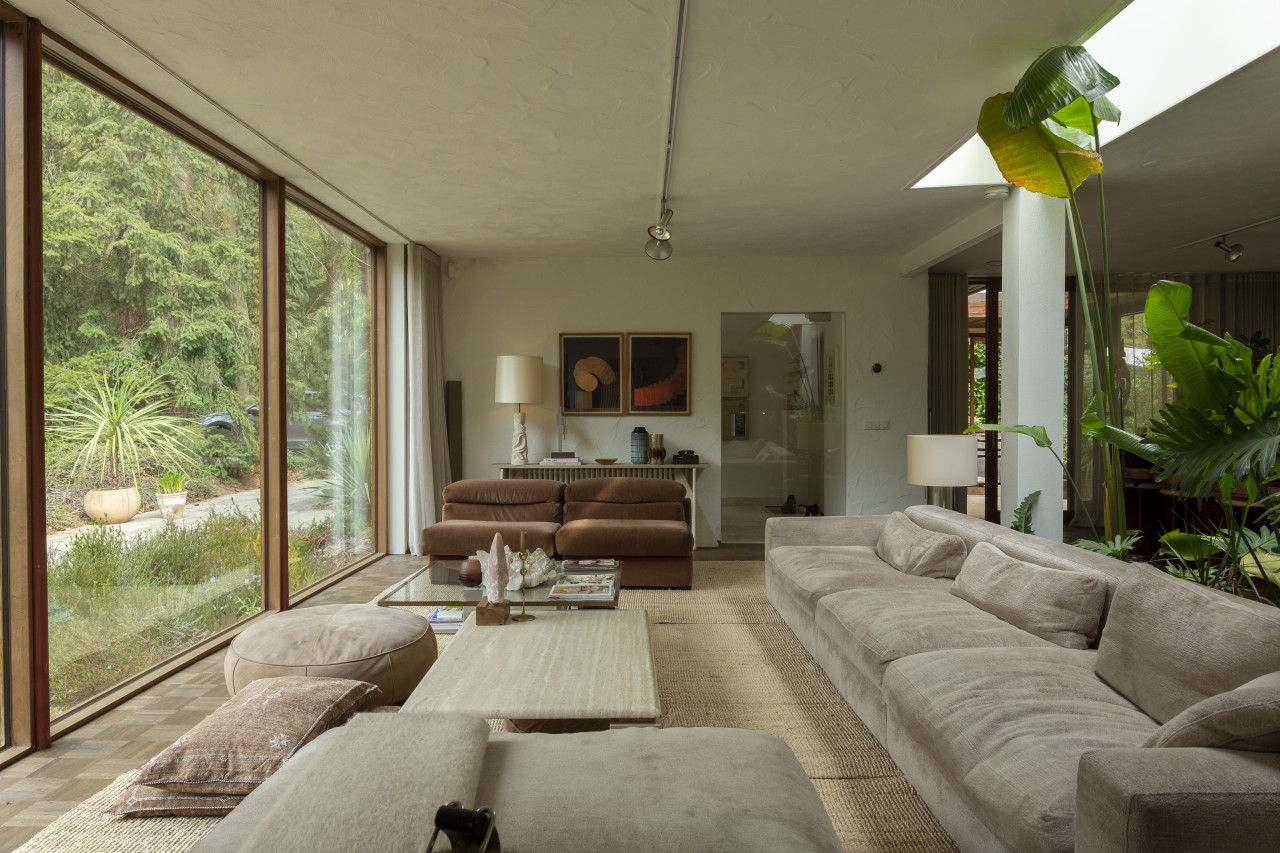 Entdecken Sie einen einzigartigen modernen Bungalow aus der Mitte des Jahrhunderts, umgeben von üppigem Grün, wo elegantes Design auf die beruhigende Präsenz der Natur trifft. Dieses weitläufige, lichtdurchflutete Haus verfügt über raumhohe Fenster, nahtlose Übergänge zwischen Innen- und Außenbereich und offen gestaltete Wohnräume, die sich perfekt für luxuriöse Unterhaltung und ruhige Entspannung eignen. Warme Holztöne, Steinverkleidungen und Designermöbel schaffen eine raffinierte Atmosphäre, während jedes Zimmer einen ruhigen Blick auf den Garten oder den Wald bietet. Die Küche des Küchenchefs ist mit hochwertigen Geräten und natürlichen Oberflächen ausgestattet, und die Bäder mit Spa-Charakter bieten einen beruhigenden Rückzugsort mit eleganten, organischen Akzenten. Mehrere Lounge- und Essbereiche bieten den perfekten Rahmen für Empfänge oder zum Entspannen, alles unterstrichen durch ausgewählte Kunst und Boutique-Details, die Wärme und Raffinesse in jeden Winkel bringen. Dieser Bungalow in ruhiger, privater Hanglage mit einfachem Zugang zur Stadt ist eine seltene Mischung aus Architektur und Natur und bietet gehobenes Wohnen vom Feinsten.