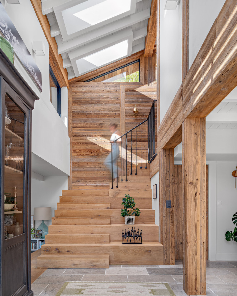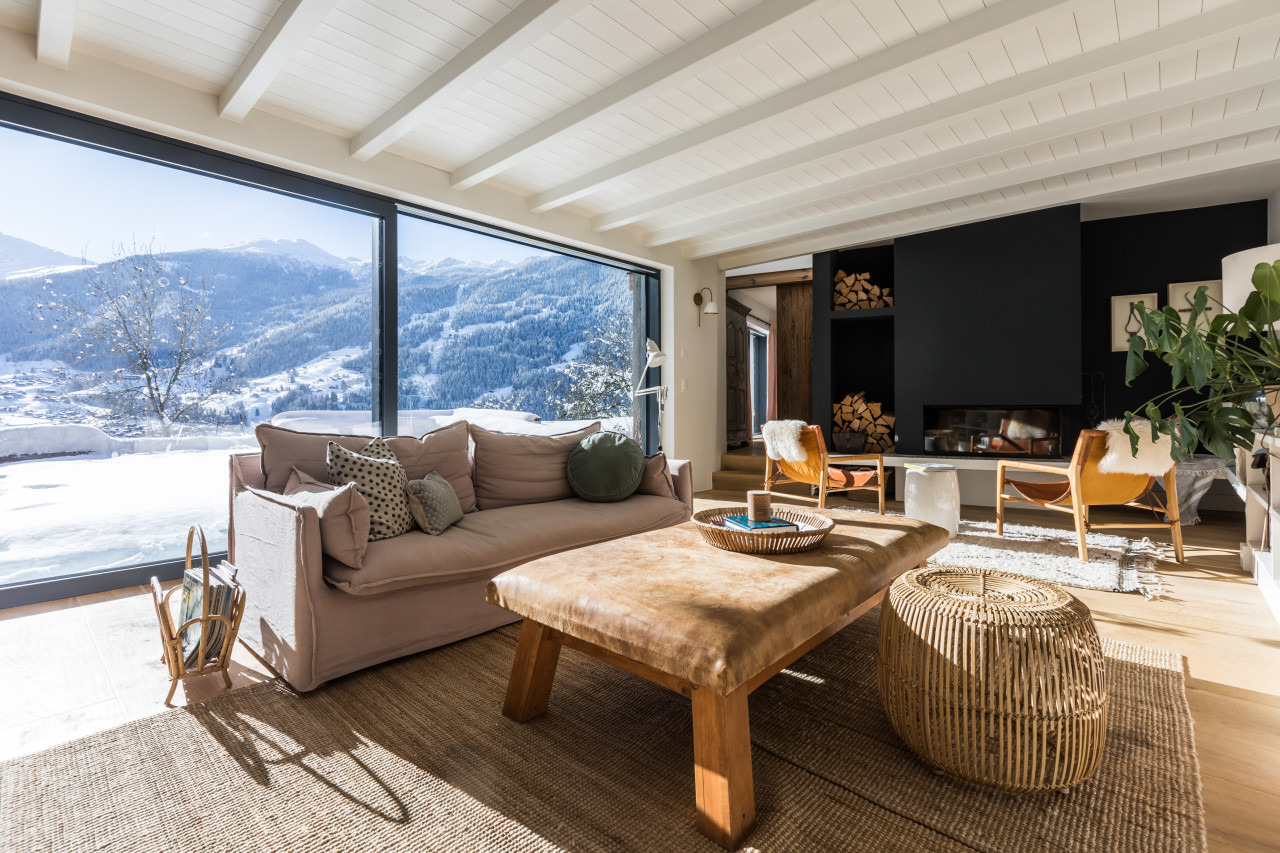 Durch die großen Fenster mit Panoramablick auf die Berge ist das Chalet den ganzen Tag über von natürlichem Licht durchflutet - ideal für hochwertige Editorial-, Mode- und Innenaufnahmen. Ein dramatisches Atrium mit freiliegenden Balken und einer handgefertigten Holztreppe sorgt für Volumen und visuelles Interesse, perfekt für filmische Kompositionen.