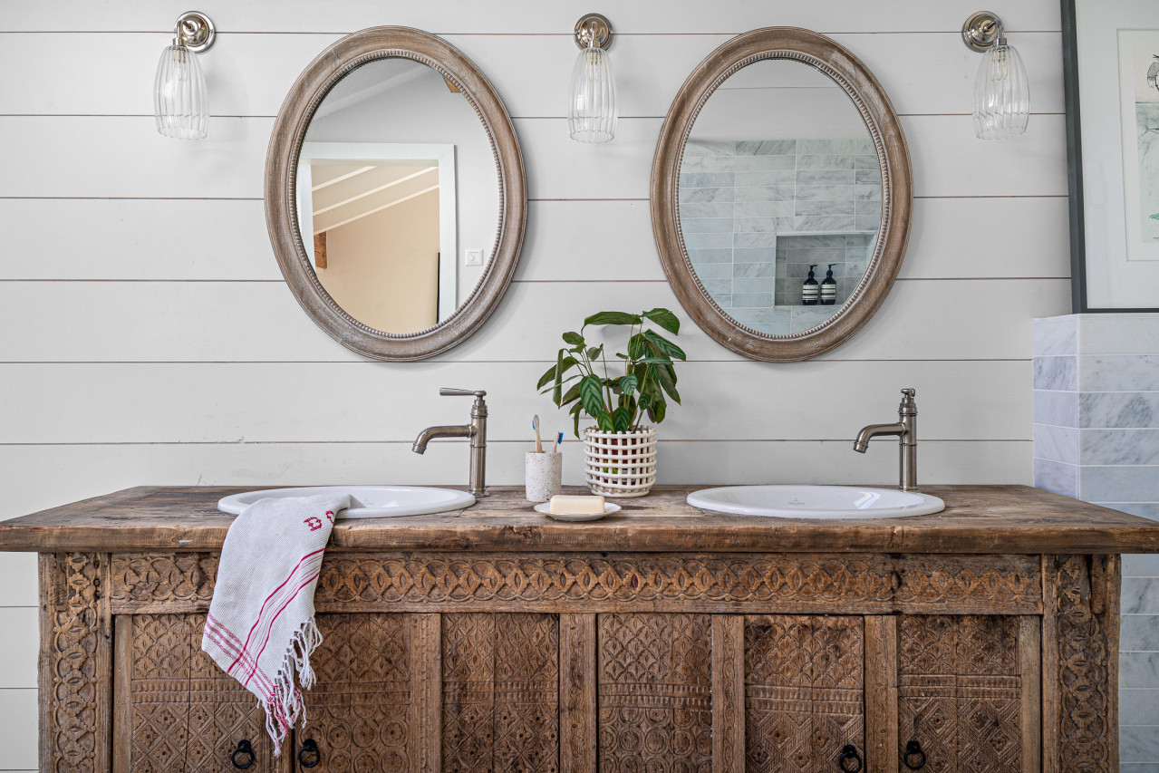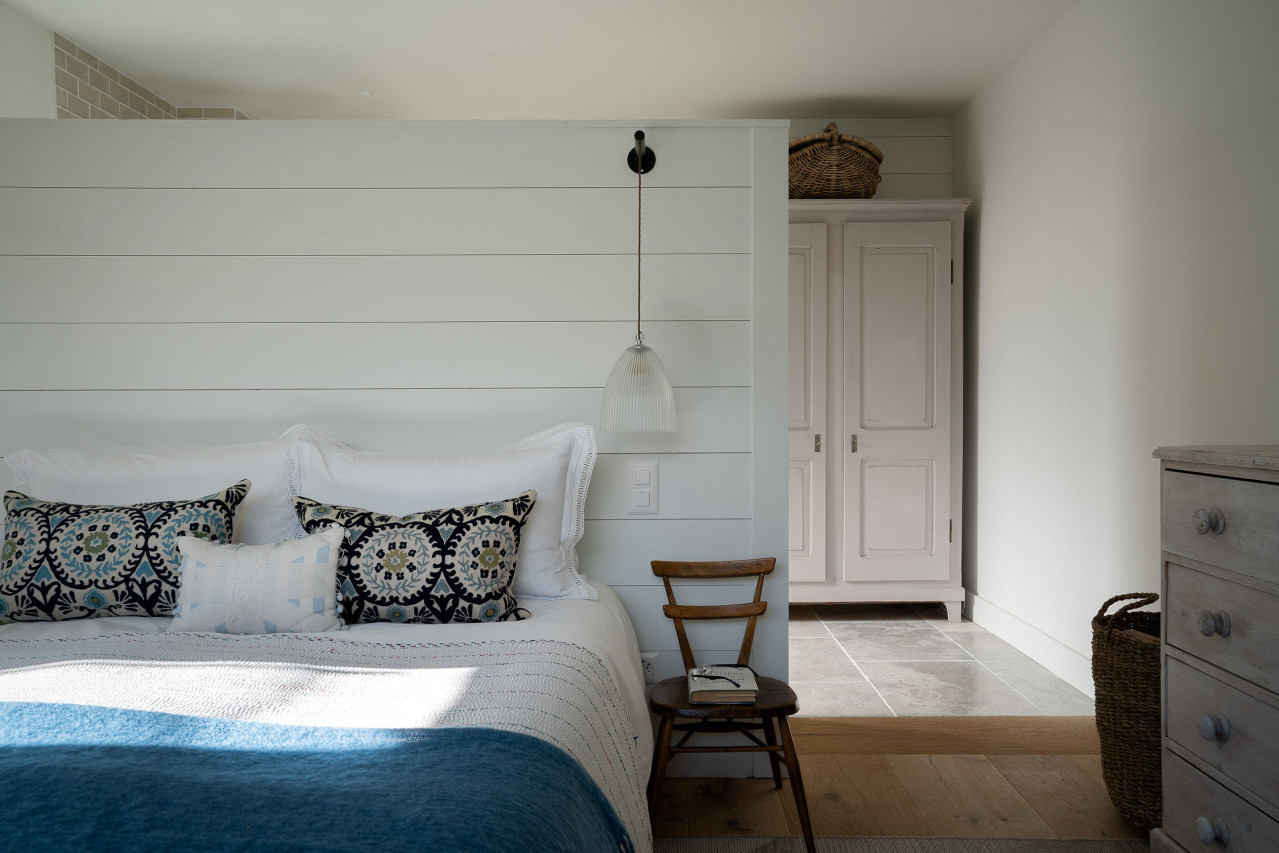 Die Innenräume sind mit einem ausgefeilten Blick gestaltet: wiederverwendetes Holz, Natursteinböden, neutral getönte Textilien und handwerkliche Details wie geschnitzte Waschtische und Leinenvorhänge. Jeder Raum verbindet klare Linien mit Wärme und Textur und schafft so vielseitige Kulissen für eine breite Palette von visuellen Erzählungen.