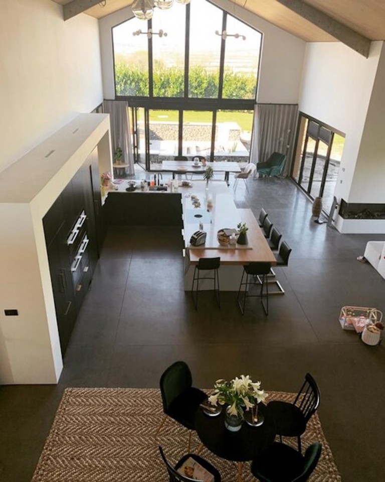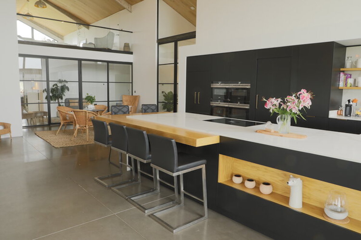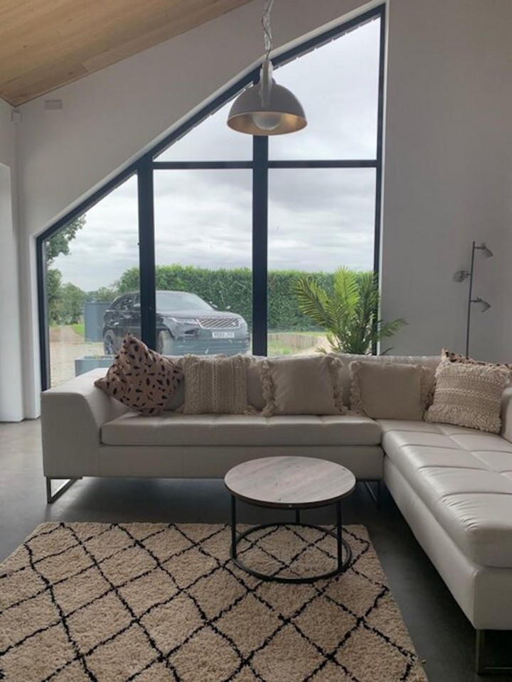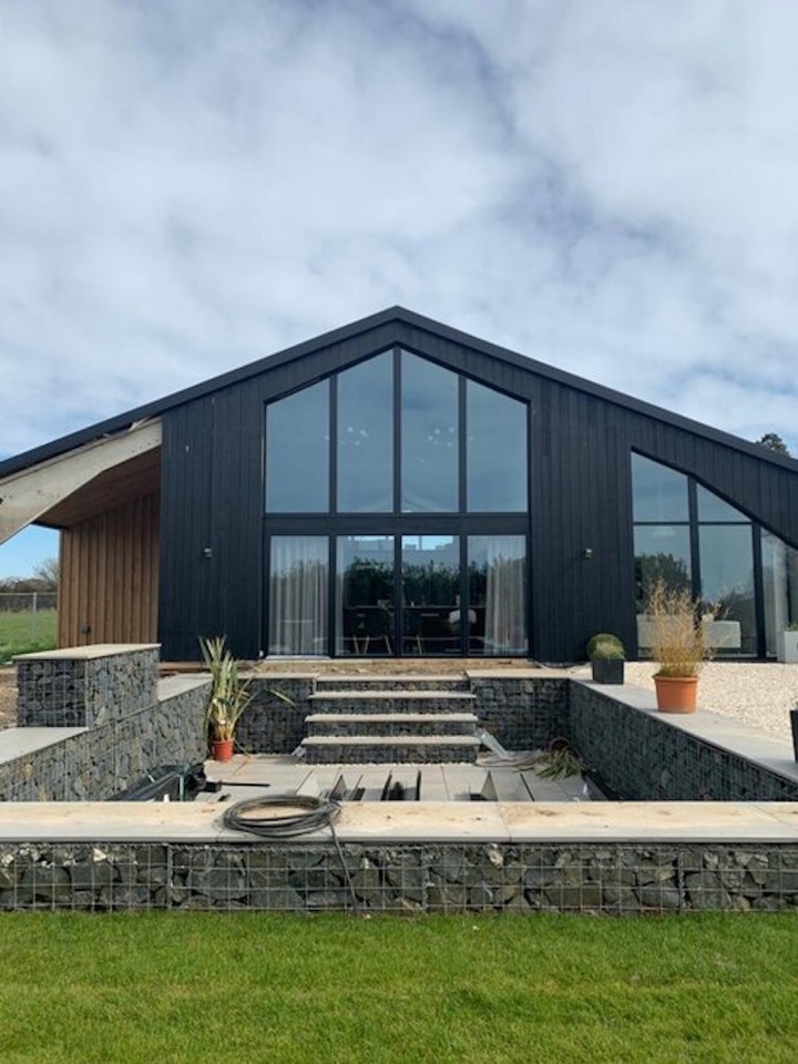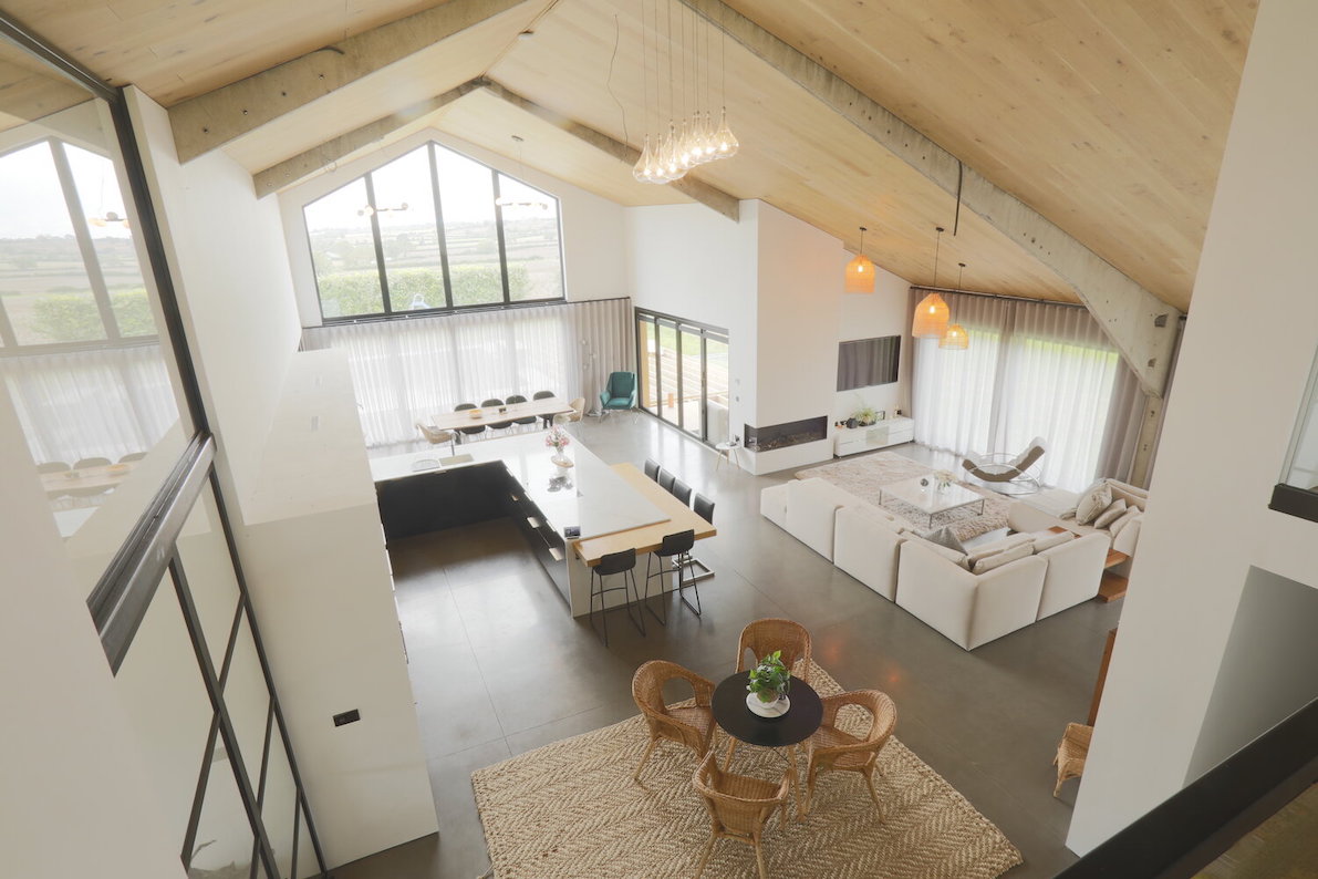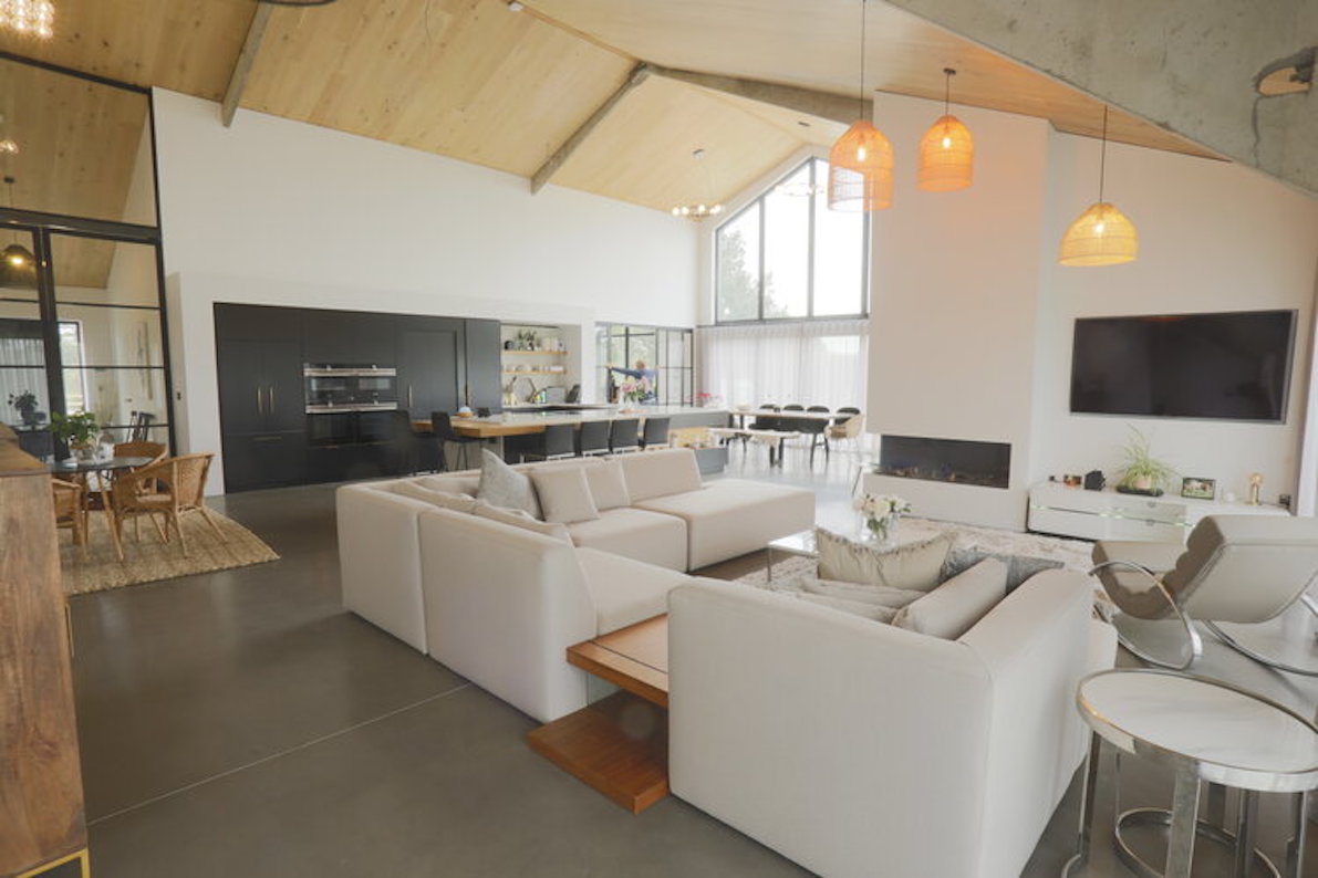 Die Scheune ist in ihrer Gestaltung zurückhaltend und lässt die Architektur durchscheinen. Die Hauptmerkmale sind die gigantische mit Eichenholz verkleidete Decke und die riesigen freiliegenden originalen Betonbinder. Die aluminiumbeschichteten Türen im Crittall-Stil trennen den Wohnbereich von den Schlafzimmern und dem Familienzimmer und verleihen der Scheune ein industrielles, modernes Ambiente.
