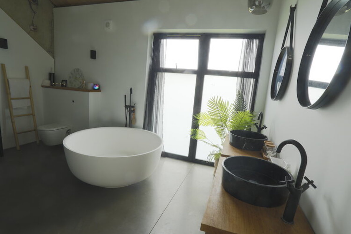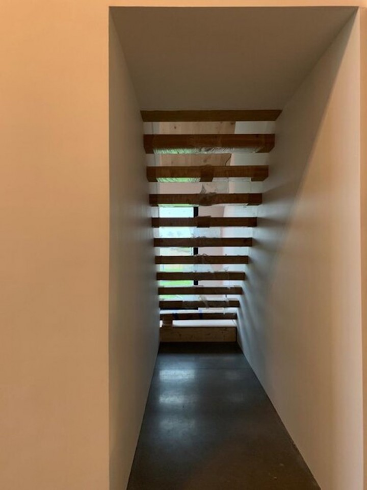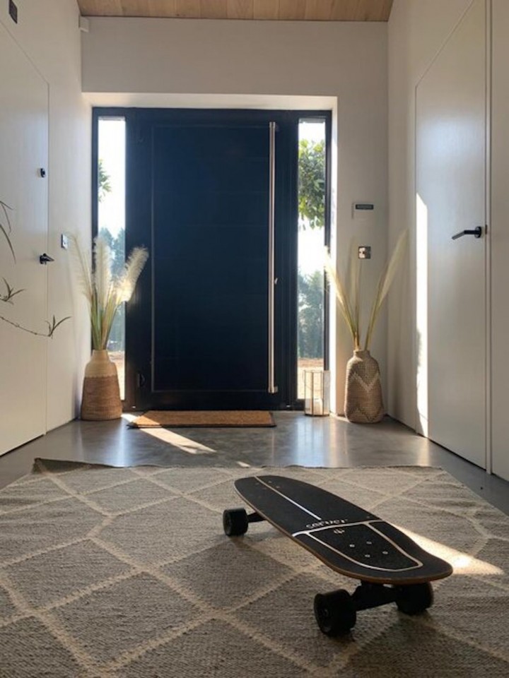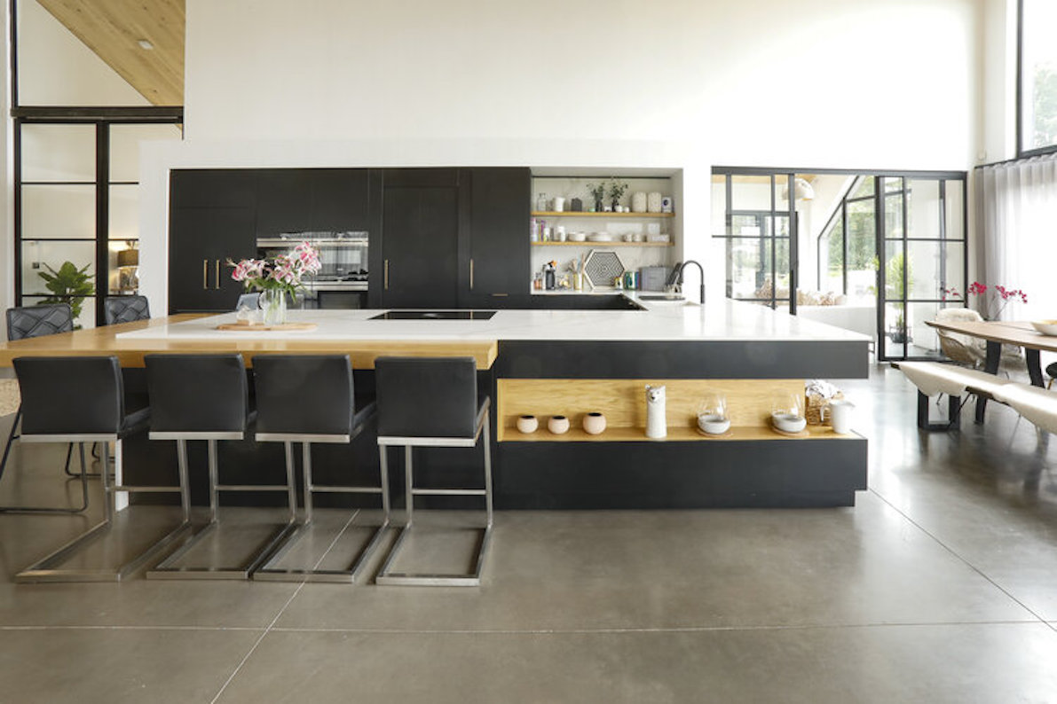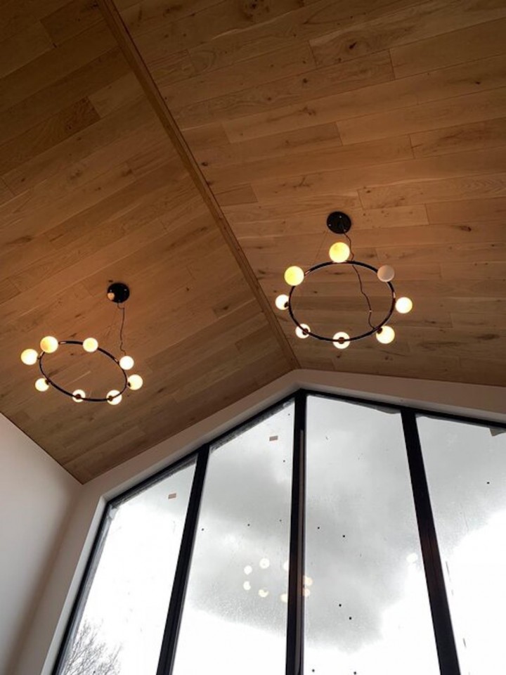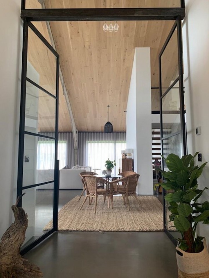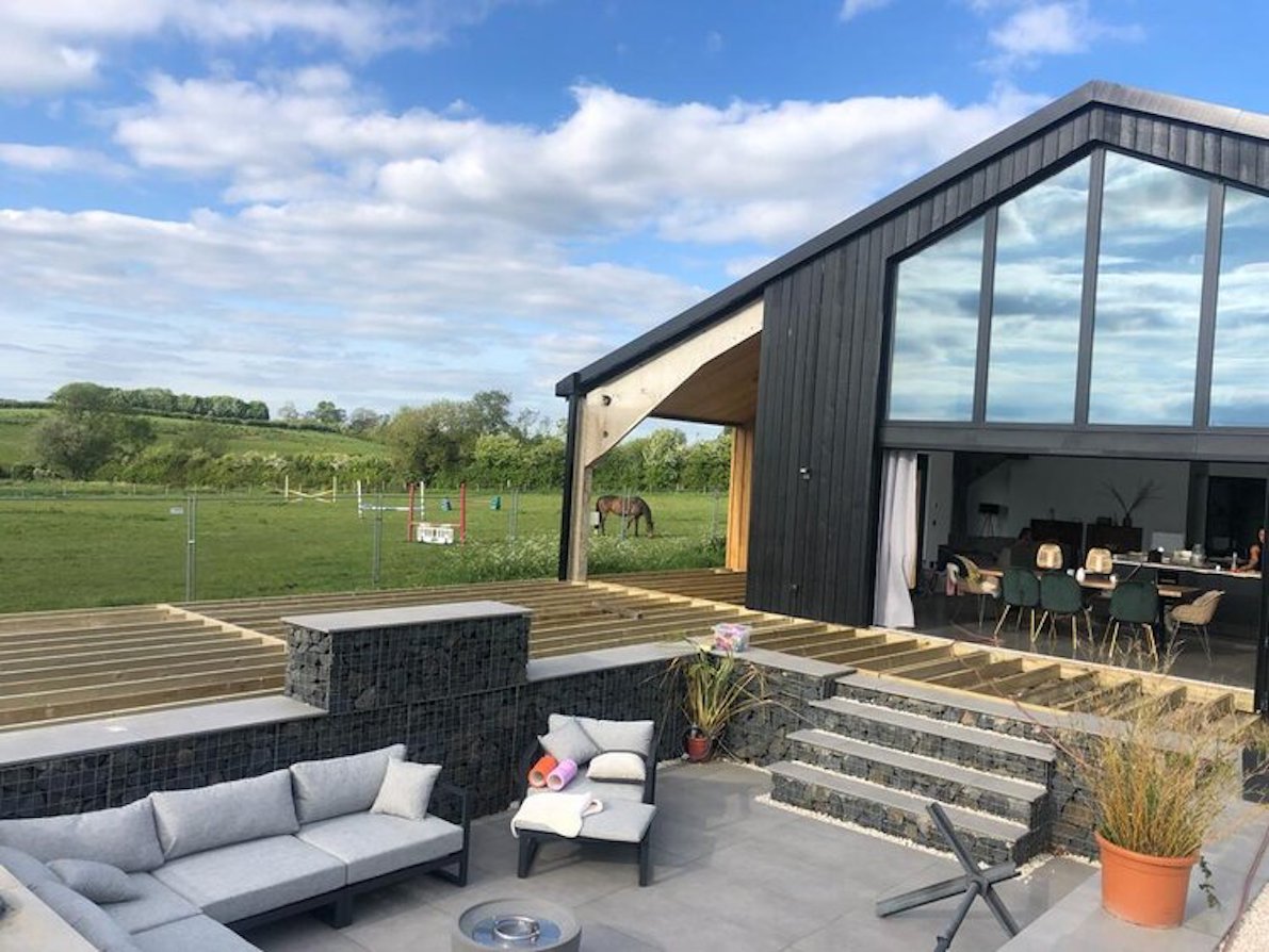 Die Scheune ist in ihrer Gestaltung zurückhaltend und lässt die Architektur durchscheinen. Die Hauptmerkmale sind die gigantische mit Eichenholz verkleidete Decke und die riesigen freiliegenden originalen Betonbinder. Die aluminiumbeschichteten Türen im Crittall-Stil trennen den Wohnbereich von den Schlafzimmern und dem Familienzimmer und verleihen der Scheune ein industrielles, modernes Ambiente.