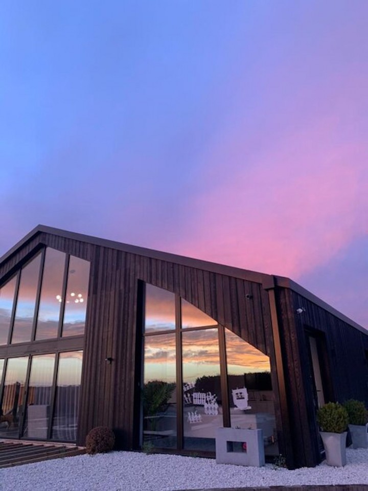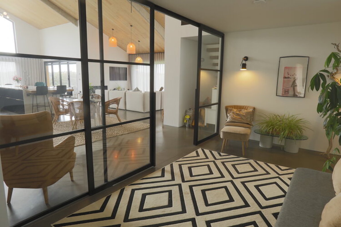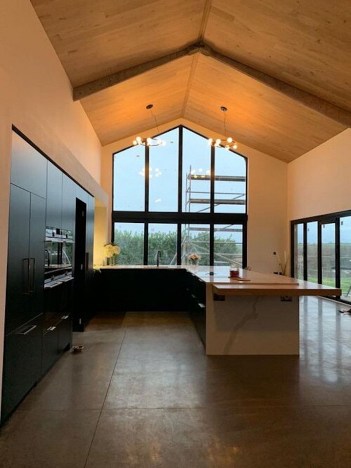 Die Lodge-Scheune hat riesige architektonische Fenster und einen großen offenen Wohnbereich.