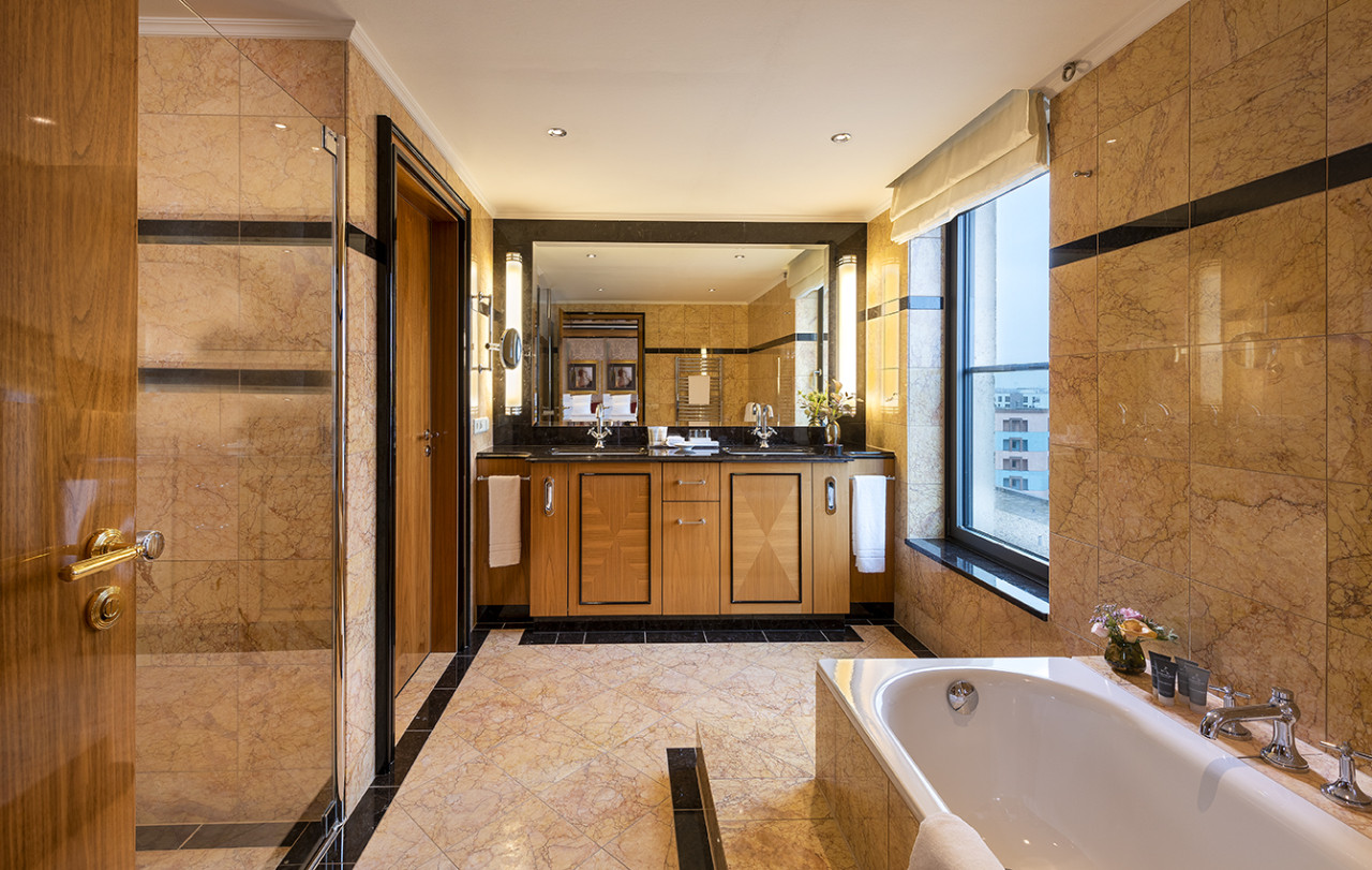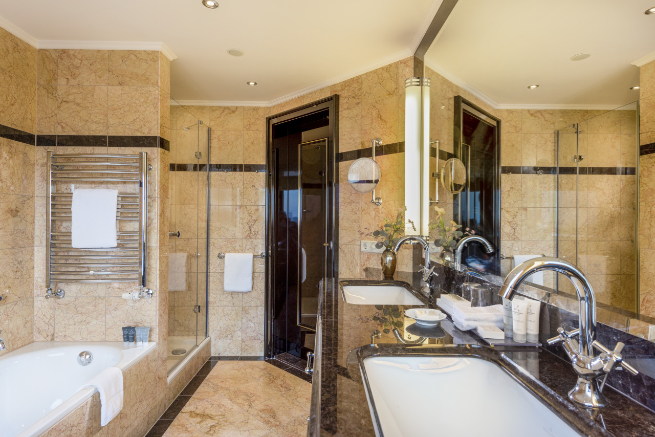 Das Innendesign von El Ghoneimi wurde von der nahe gelegenen Parklandschaft inspiriert. Tiefe Grün- und warme Brauntöne dominieren die Räume, die durch hellen Marmor ergänzt werden und ein Gefühl von Ruhe und Eleganz vermitteln. Die Kunstwerke in den öffentlichen Bereichen und den Gästezimmern spiegeln die Schönheit der Natur wider und sorgen für eine einladende und ruhige Atmosphäre.