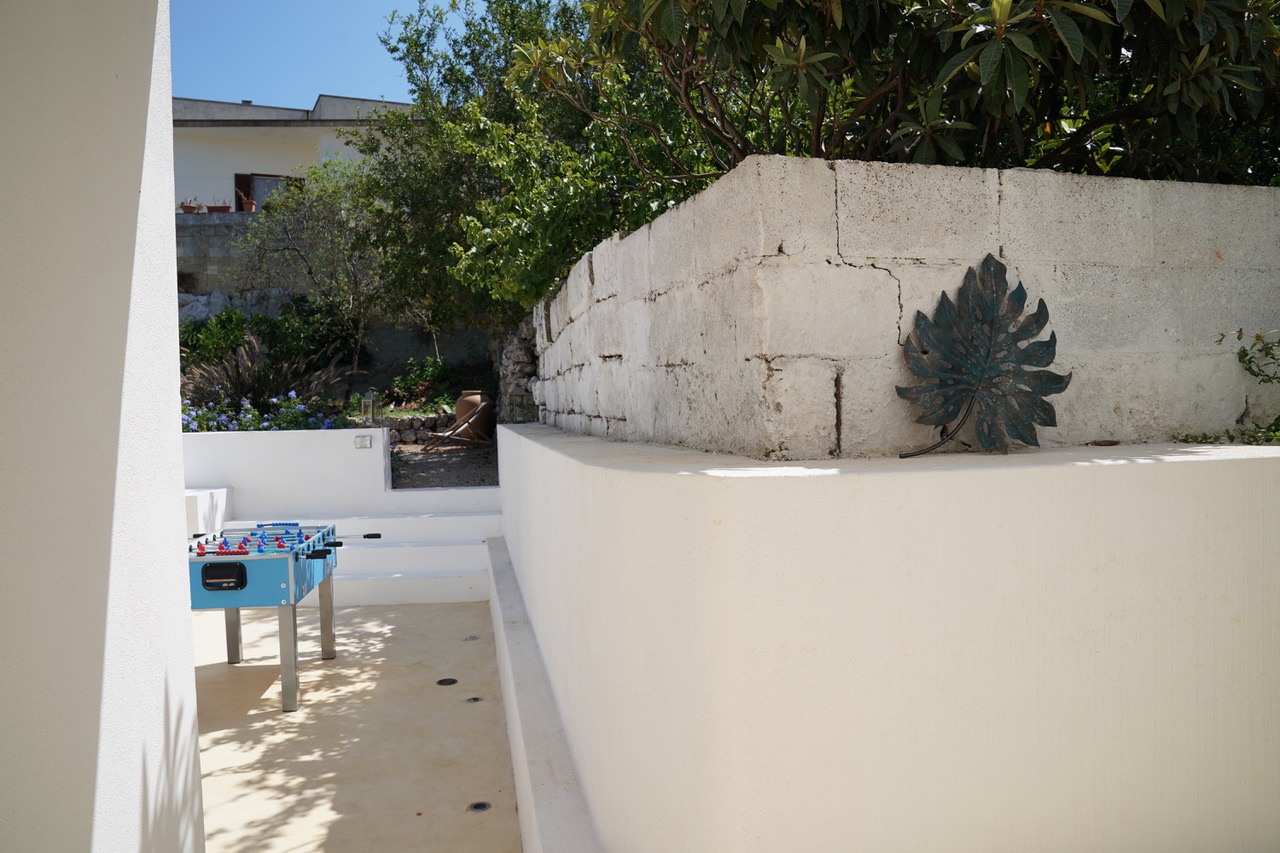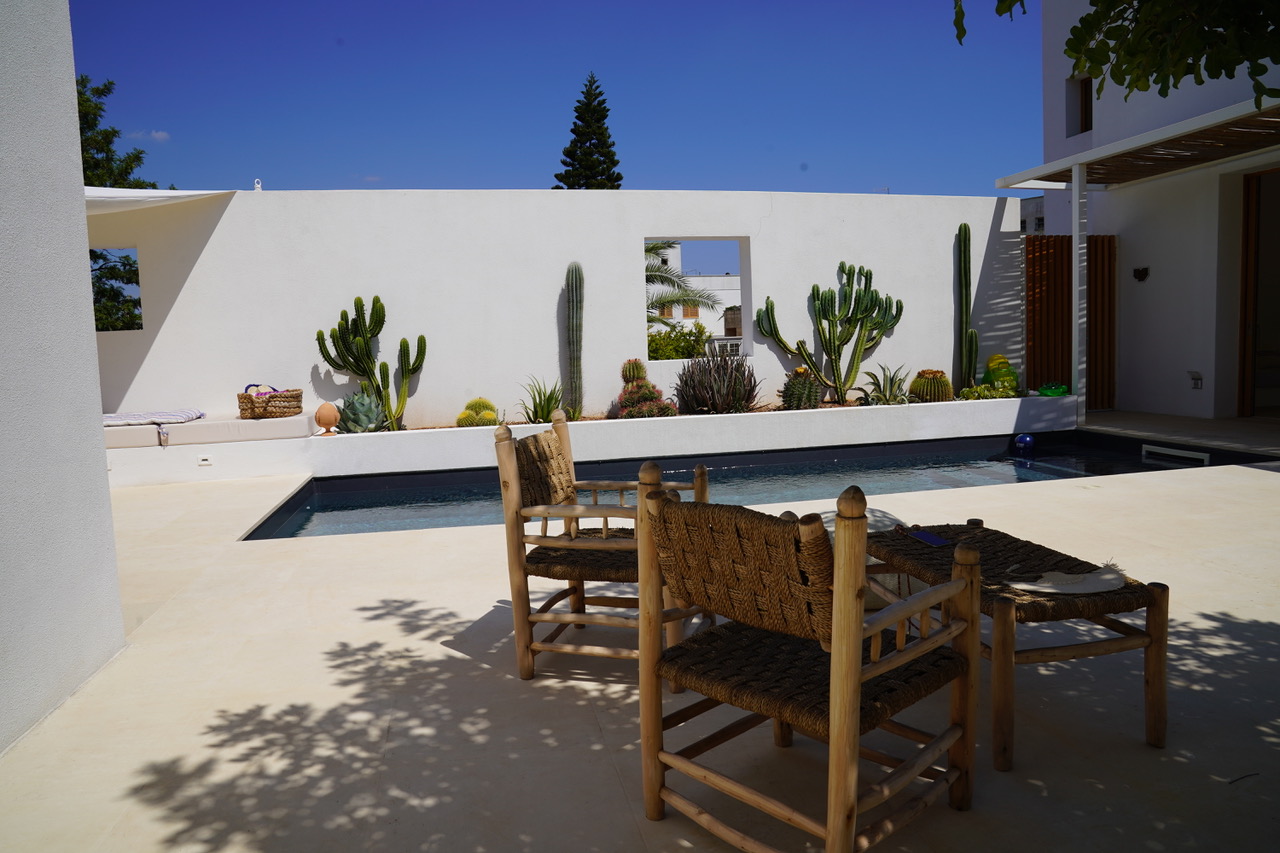 Die Villa selbst ist ein Zeugnis moderner Architektur mit ihrer klaren, weißen Fassade und den glatten Betonblöcken, die sich harmonisch in die natürliche Landschaft einfügen. Übergroße Fenster lassen viel natürliches Licht herein, das zarte Schatten wirft und das Haus in ein warmes, einladendes Licht taucht. Im Innenhof lädt eine durchdachte Anordnung von Gartenmöbeln zum Essen im Freien und zu geselligem Beisammensein ein, während die nahe gelegenen Sonnenliegen ideal zum Sonnenbaden und Entspannen sind. Dieses luxuriöse Haus bietet einen außergewöhnlichen Rahmen sowohl für lebhafte gesellschaftliche Veranstaltungen als auch für ruhige, besinnliche Momente und ist damit ein perfekter Zufluchtsort für alle, die einen von Freizeit und Eleganz geprägten Lebensstil suchen.