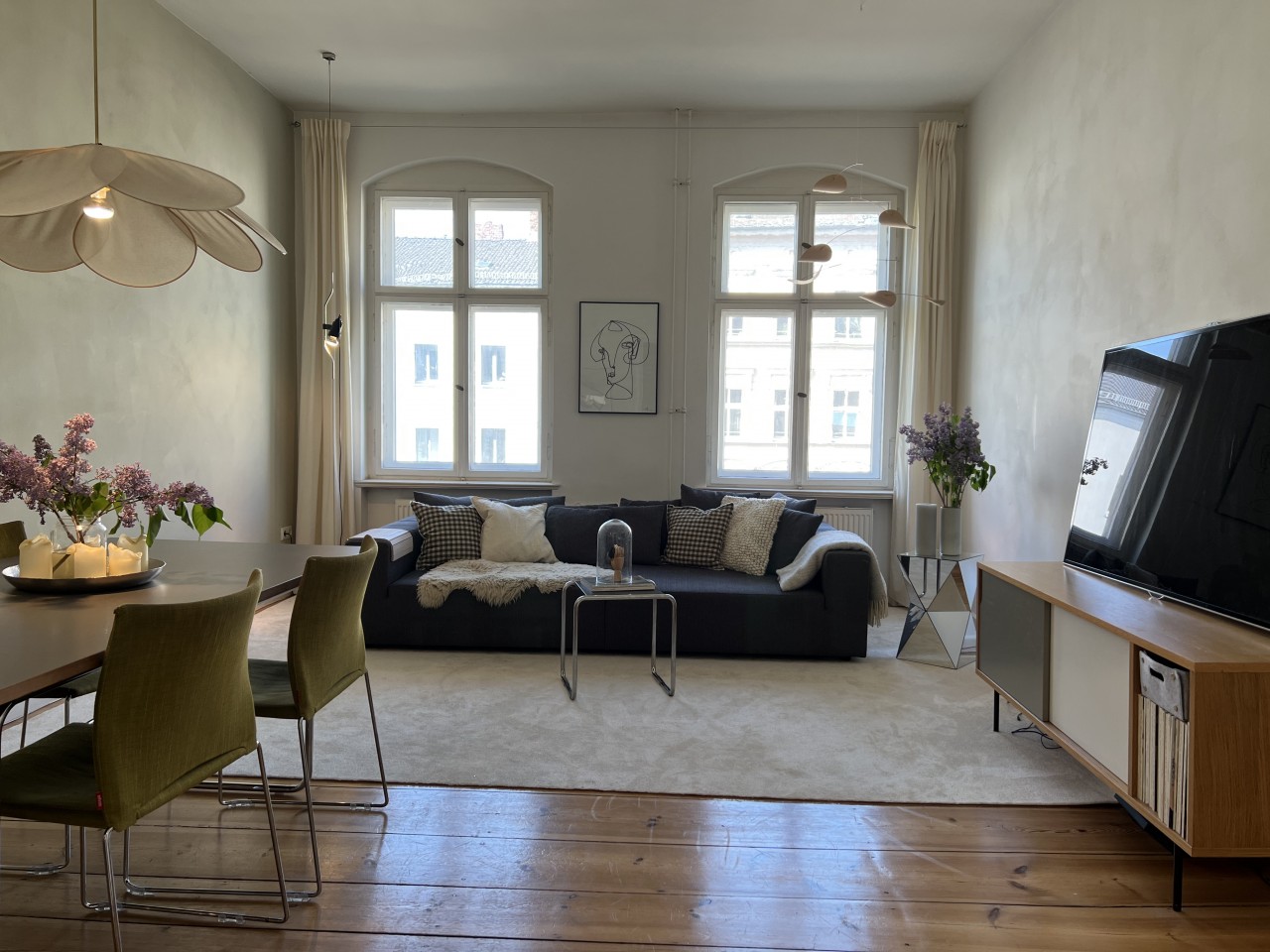 Adéntrese en un mundo de serena elegancia y estilo moderno con esta preciosa casa, diseñada haciendo hincapié en la comodidad y la estética refinada. El salón principal combina a la perfección un lujoso sofá marrón, elegantes cojines grises y velas, creando un ambiente tranquilo, realzado por la luz natural que entra por sus amplias ventanas. Acentuado con obras de arte de buen gusto, incluido un moderno comedor con sillas verde oliva y una mesa de madera adornada con flores decorativas, el salón es perfecto tanto para la vida diaria como para recibir invitados con estilo.