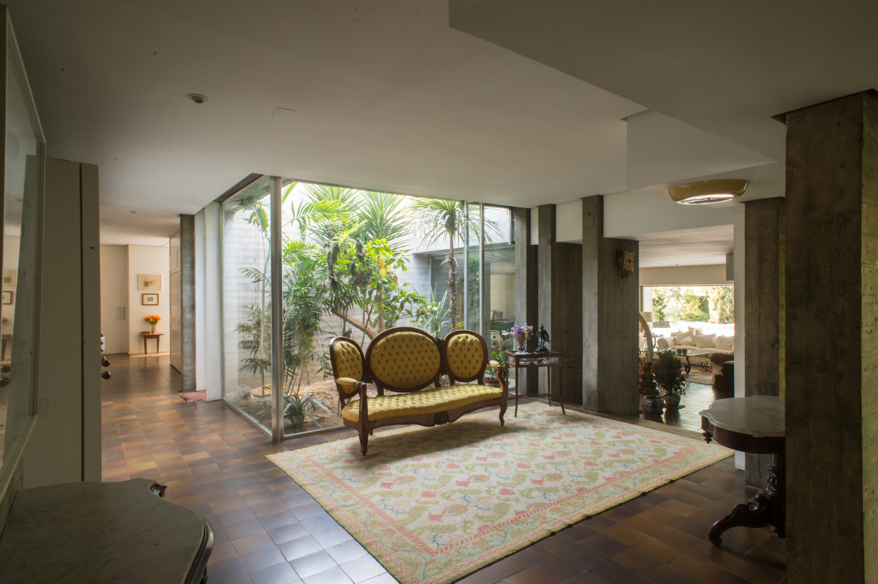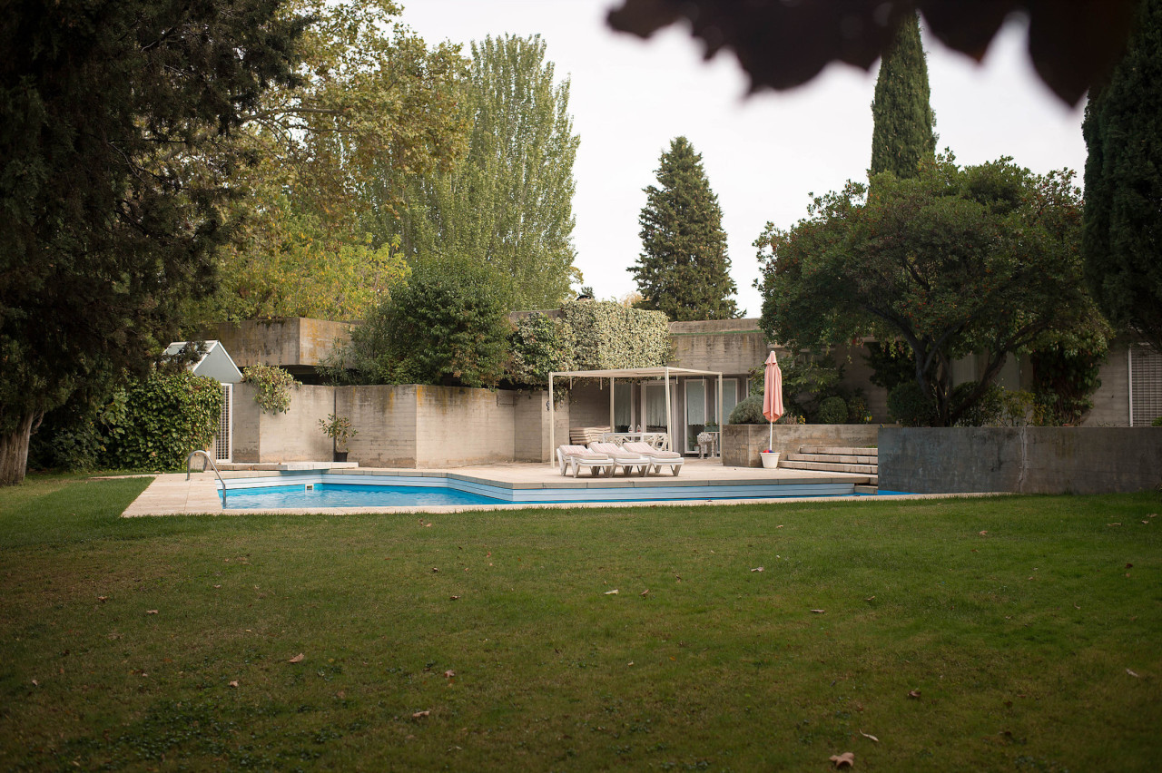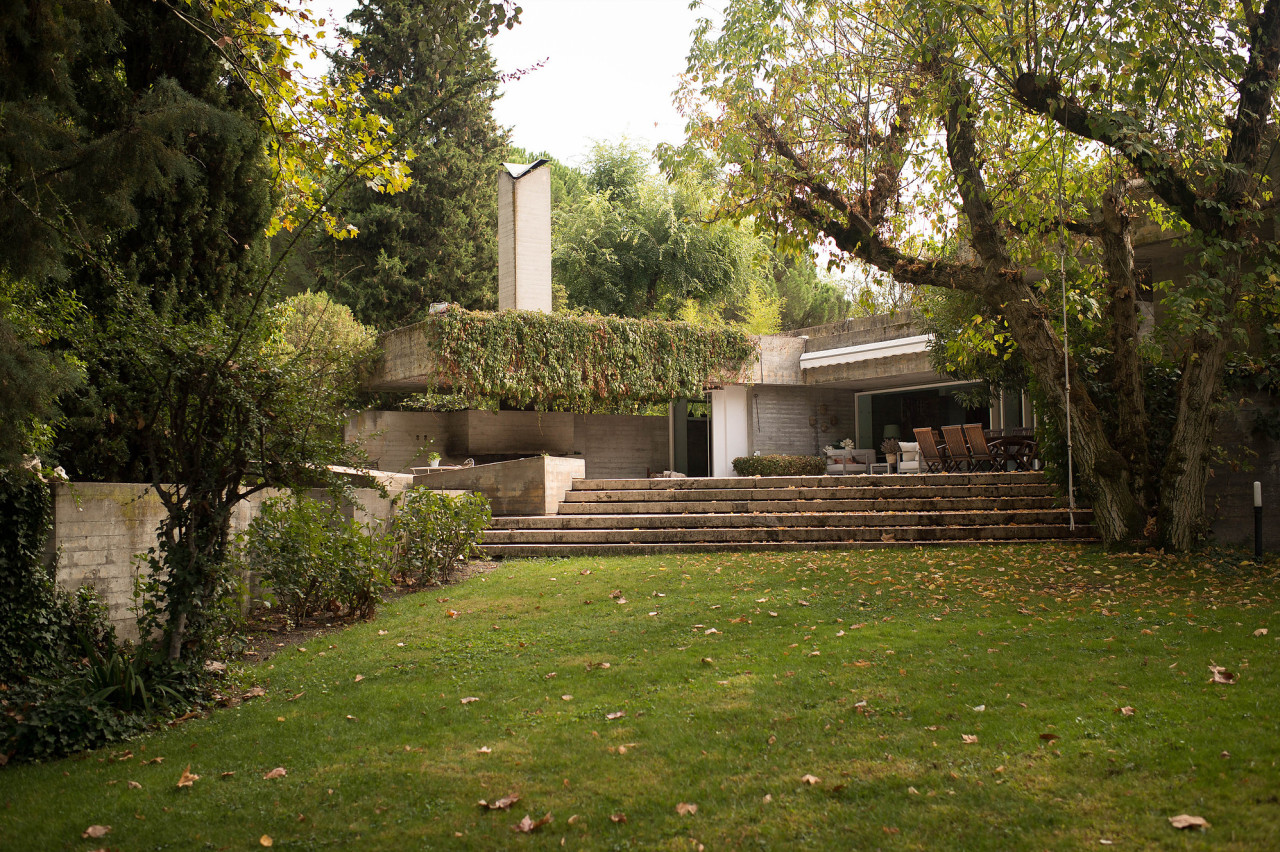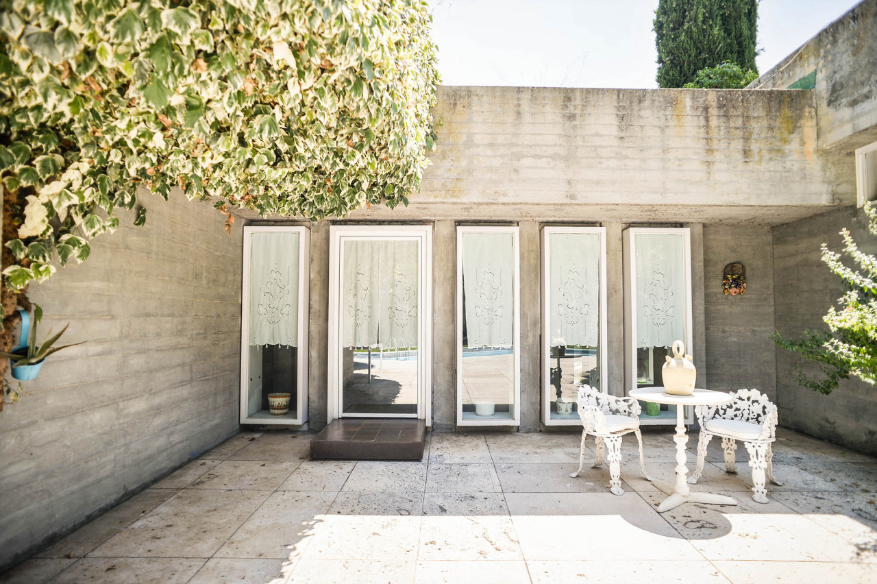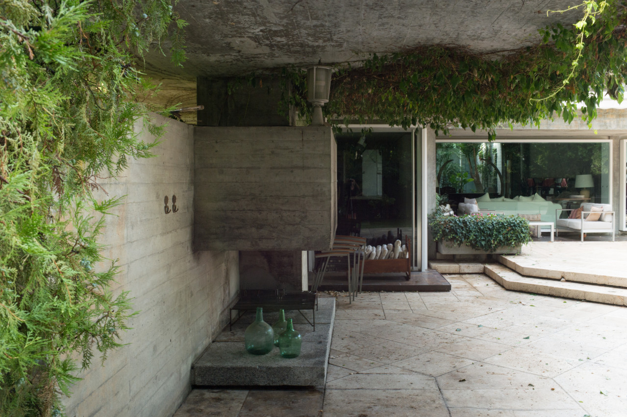 Su estilo brutalista, que parecía una escultura fuera de su tiempo, se funde con el entorno y la naturaleza; suaviza la dureza del hormigón para convertirse en el contenedor de un edén particular. Está construida en torno a dos patios interiores que hacen circular el flujo de la casa en forma de 8.