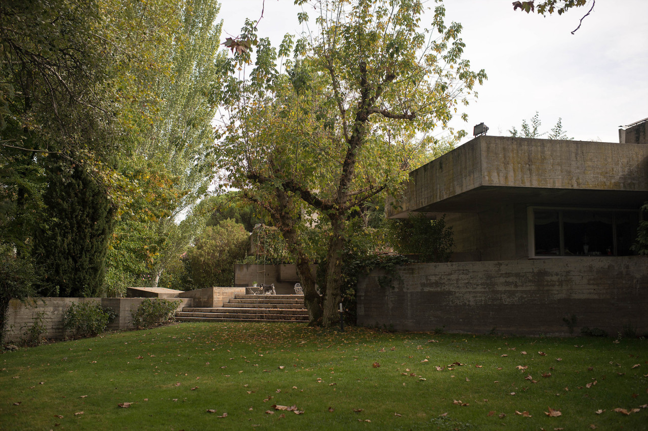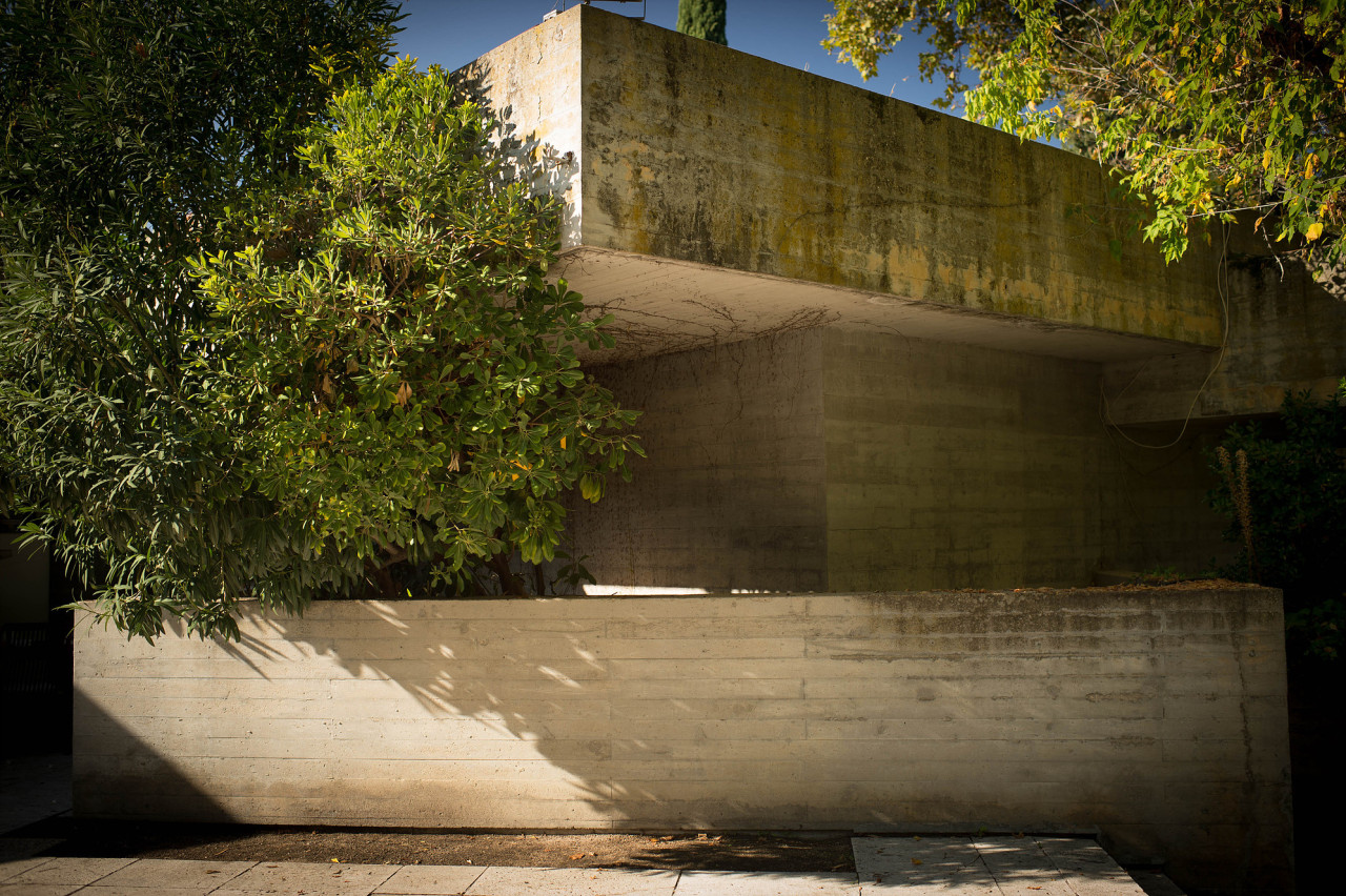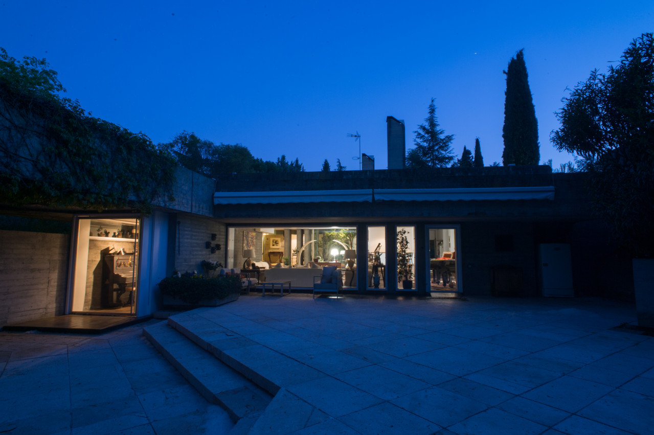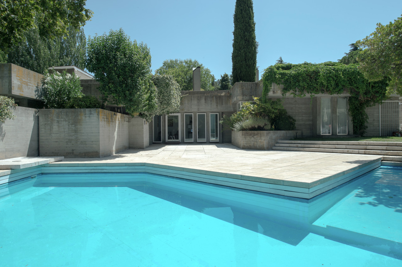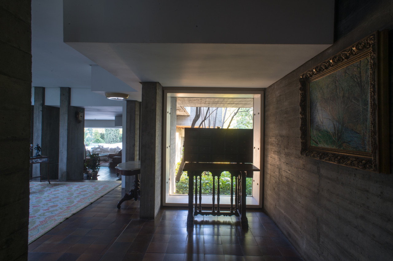 Su estilo brutalista, que parecía una escultura fuera de su tiempo, se funde con el entorno y la naturaleza; suaviza la dureza del hormigón para convertirse en el contenedor de un edén particular. Está construida en torno a dos patios interiores que hacen circular el flujo de la casa en forma de 8.