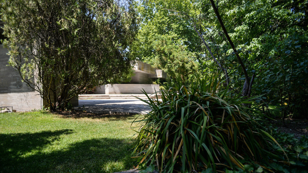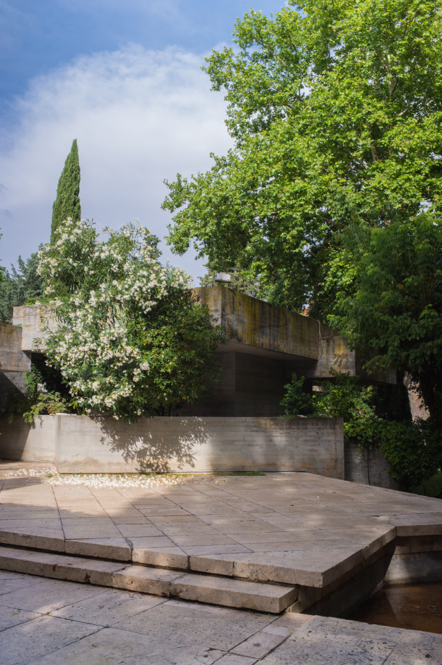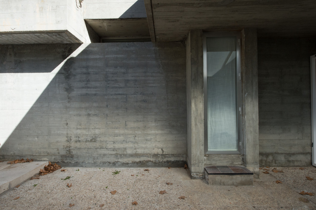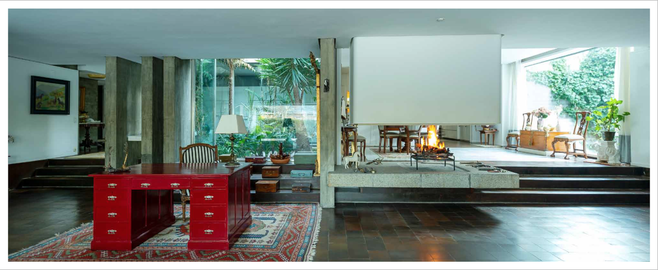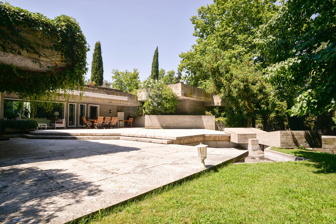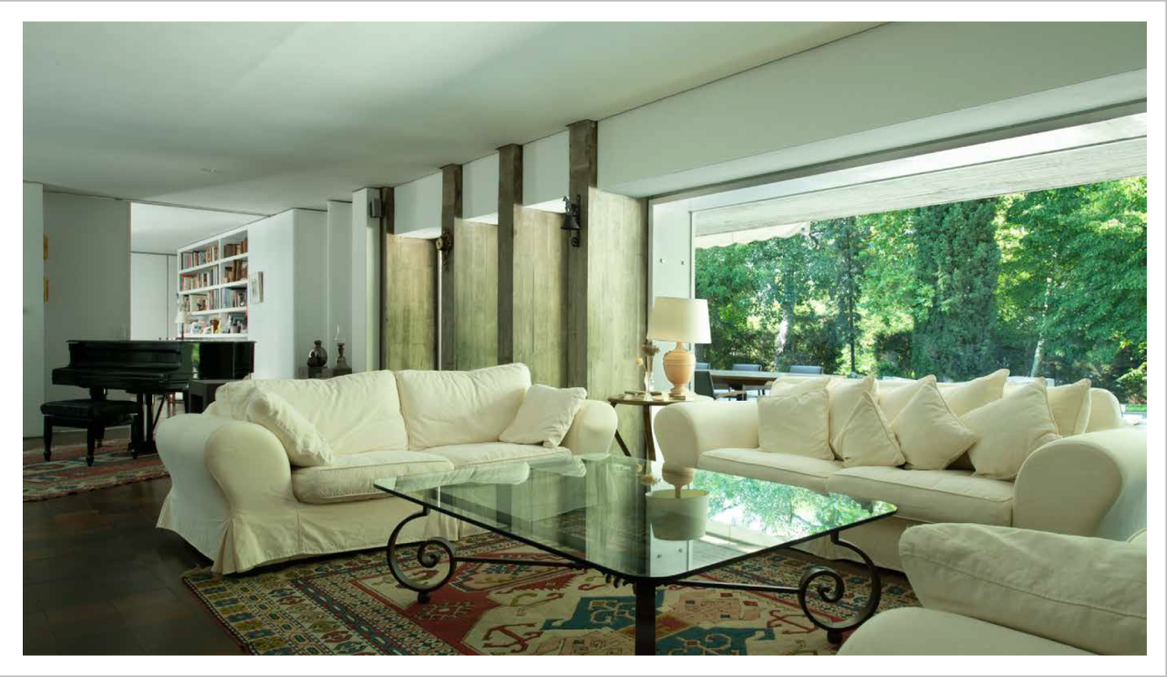 Su estilo brutalista, que parecía una escultura fuera de su tiempo, se funde con el entorno y la naturaleza; suaviza la dureza del hormigón para convertirse en el contenedor de un edén particular. Está construida en torno a dos patios interiores que hacen circular el flujo de la casa en forma de 8.