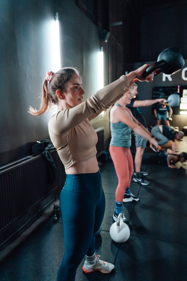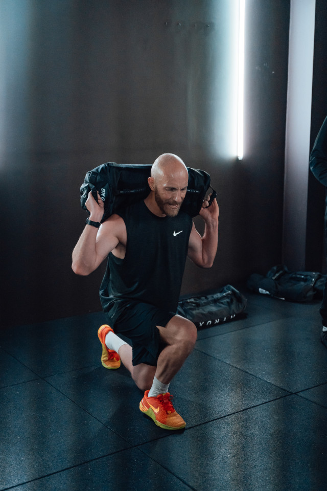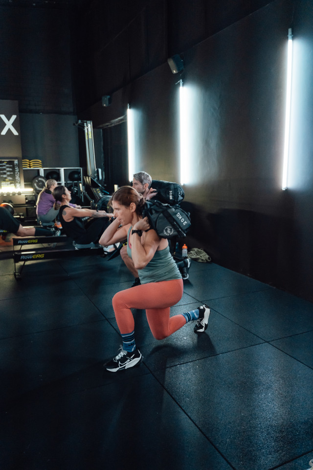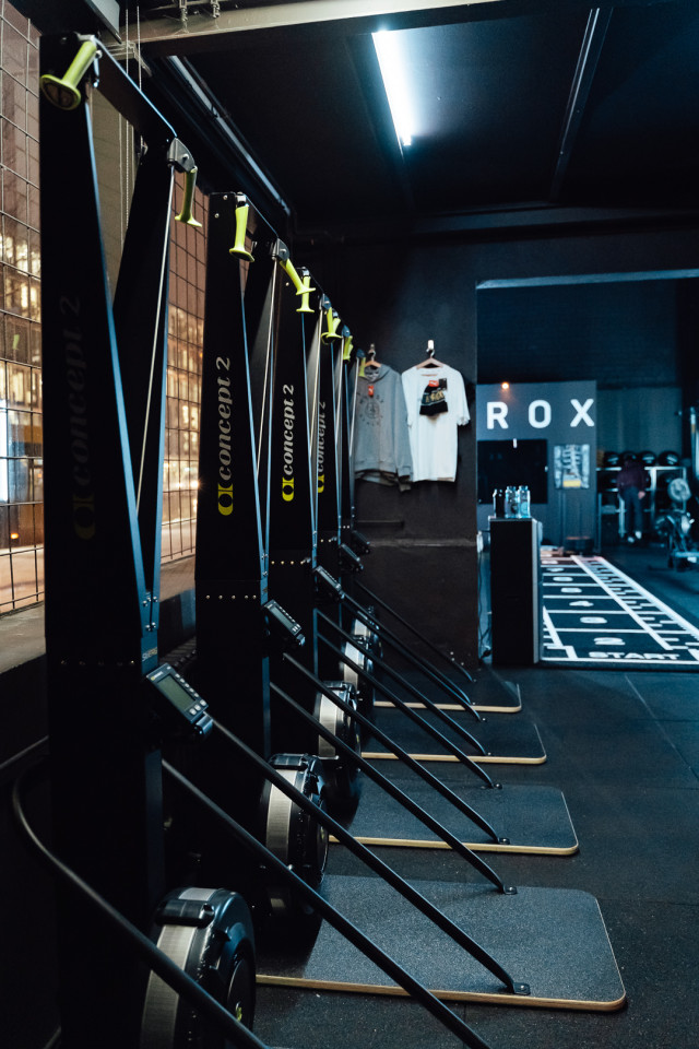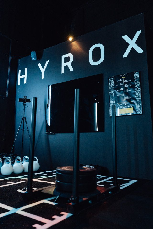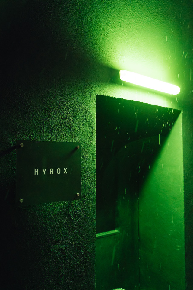 Light tubes and sculptural fixtures cast a futuristic blue glow across textured fabrics and metallic finishes, throwing athletes into high relief against the muted palette. Strategic color accents in orange and green, combined with the theatrical glow of a digital 'HYROX' sign and rain-streaked glass, create an atmosphere charged with energy and intensity. This environment offers a visually immersive stage—perfect for filmmakers, photographers, and creatives seeking authentic sports drama and dynamic, design-forward backdrops for brand activations or editorial productions.
