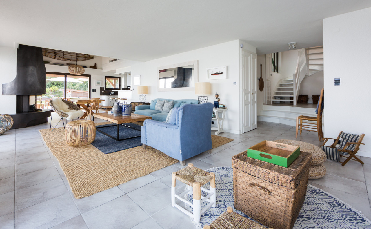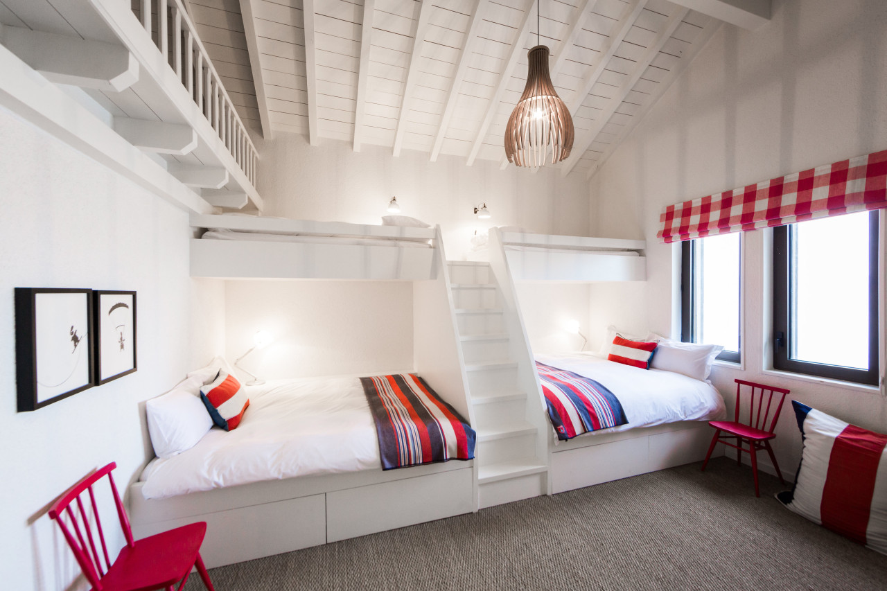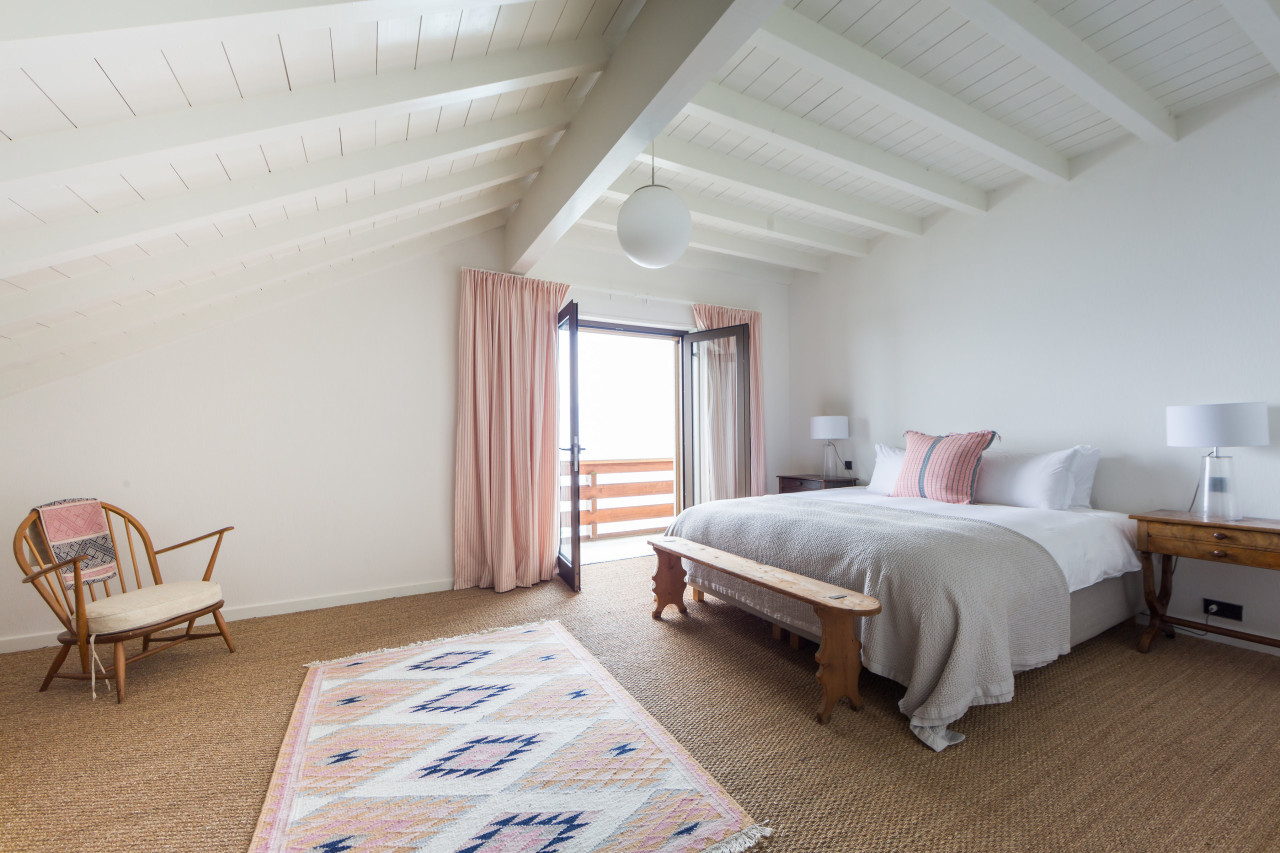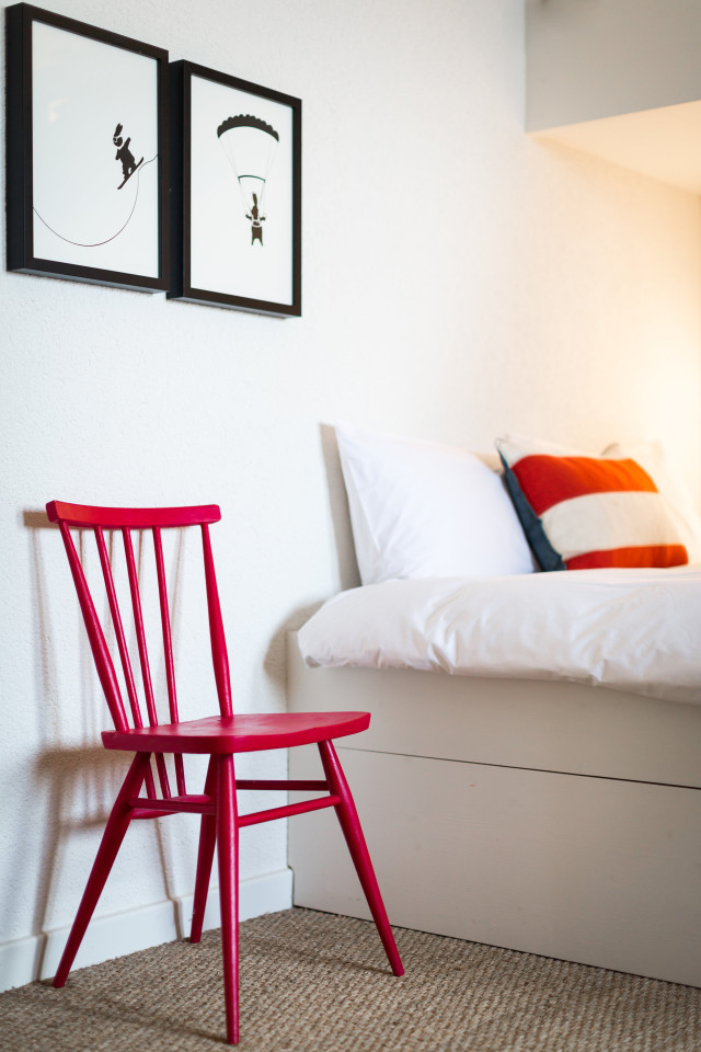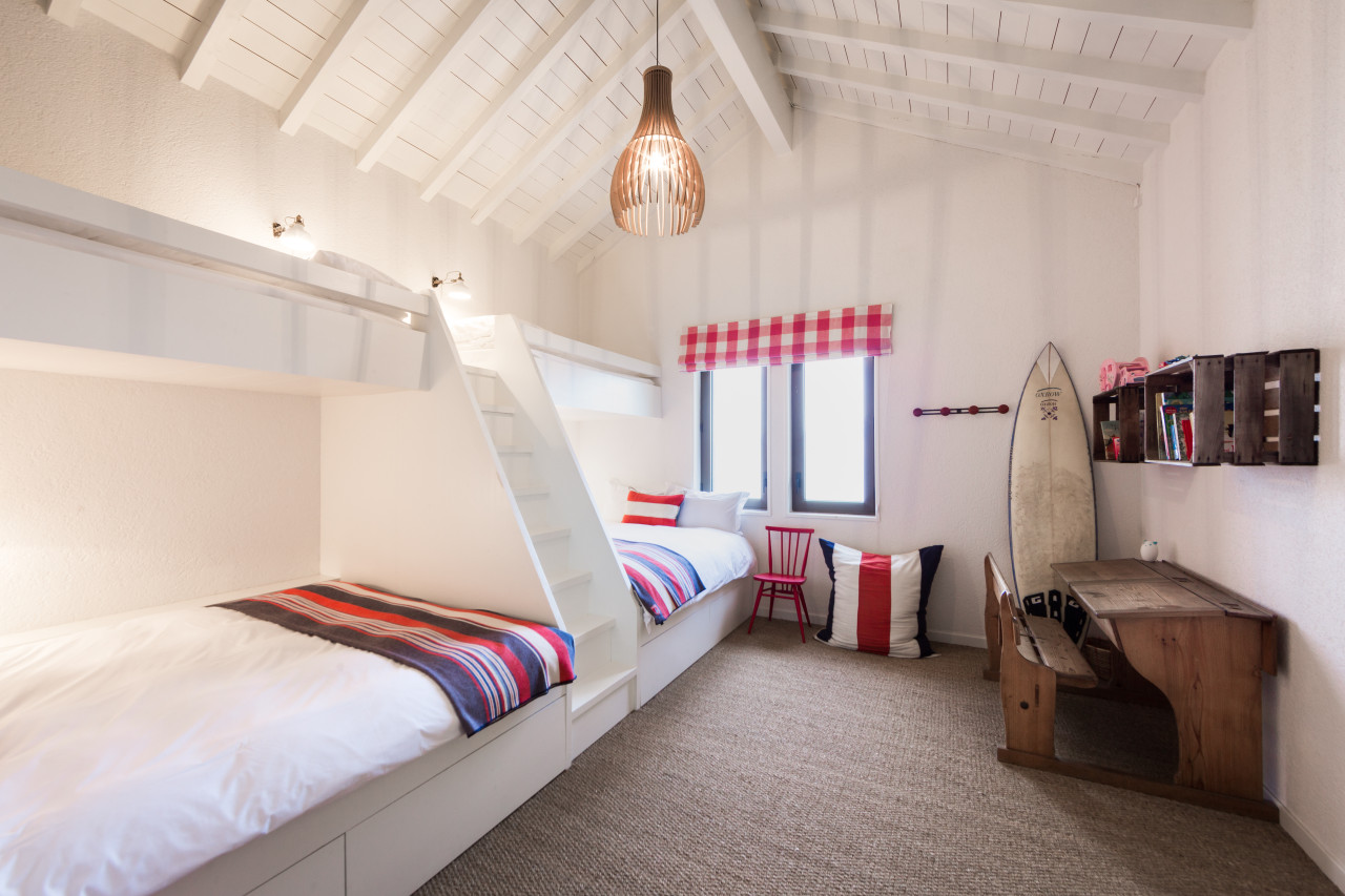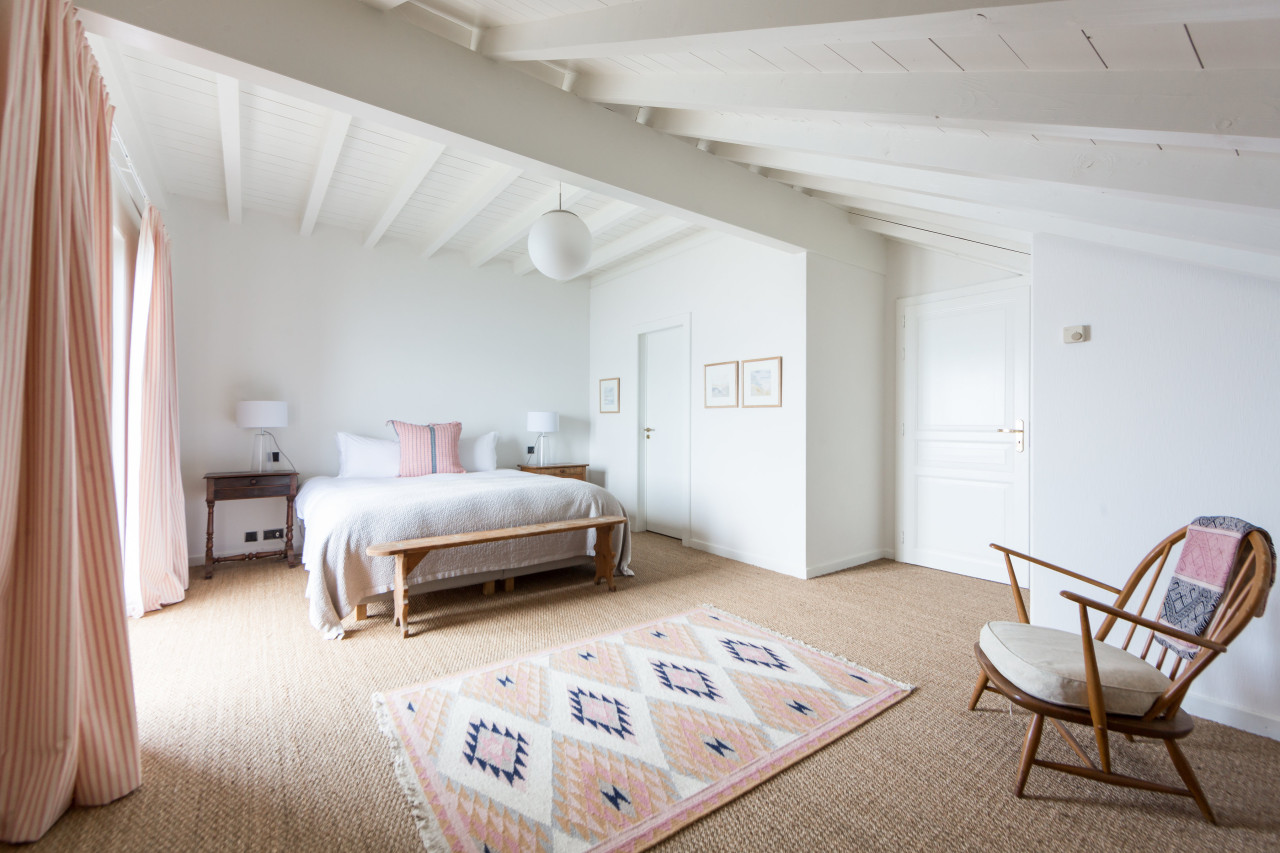 Las habitaciones, tranquilas y luminosas, incluyen una serena suite principal en tonos rubor y crema con balcón sobre el lago, y una alegre habitación infantil con literas empotradas y textiles gráficos. Los baños y la cocina mantienen una estética cálida y minimalista con madera natural, ratán, latón mate, iluminación artesanal y suaves baldosas de cerámica. Cada rincón de la casa está pensado para la calma, el confort y la narración visual, lo que la convierte en un lugar privilegiado para producciones creativas, rodajes y eventos en el lago Léman.