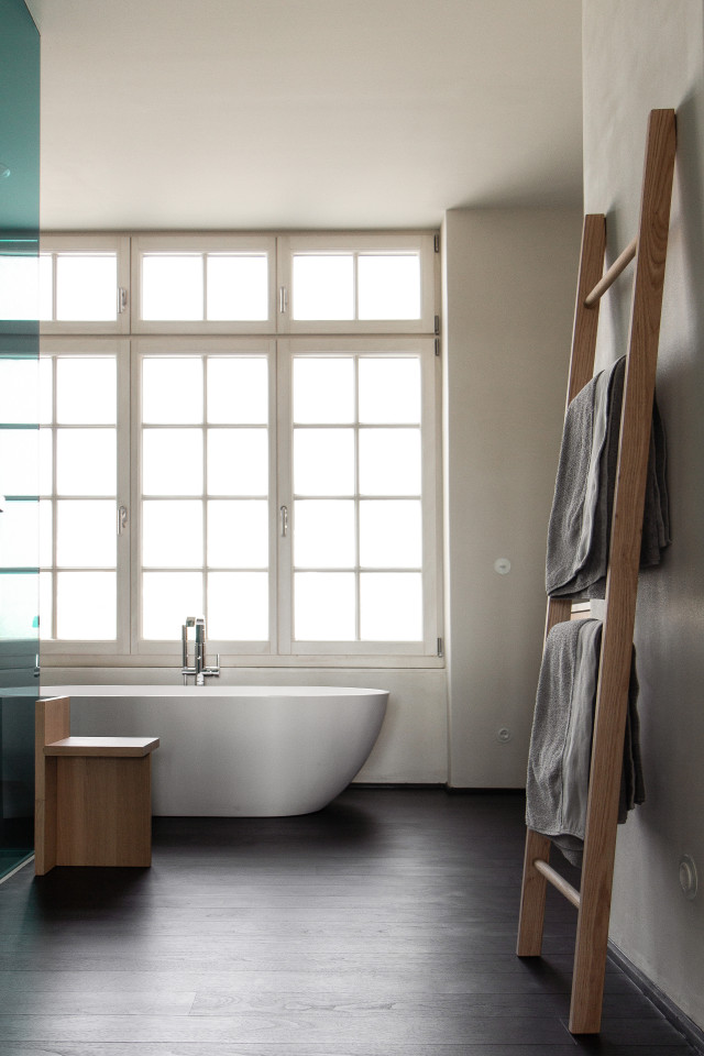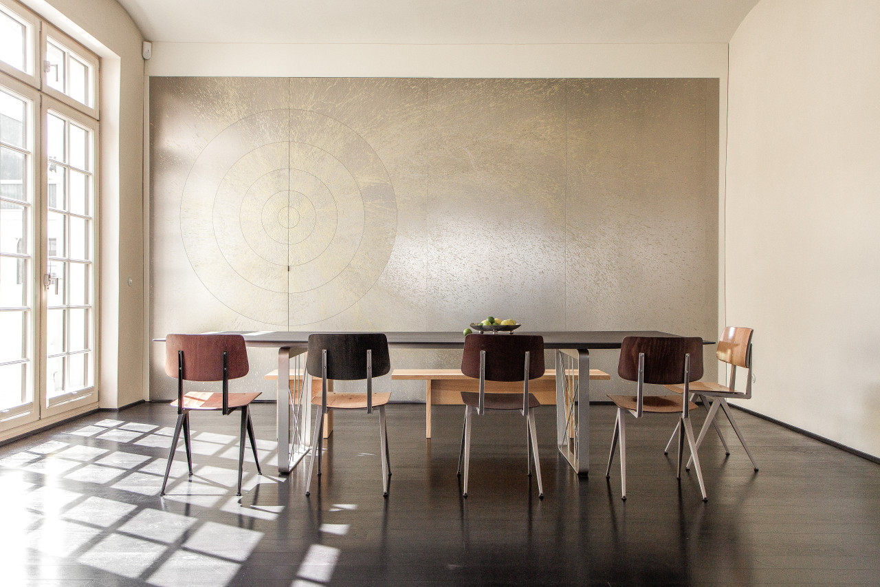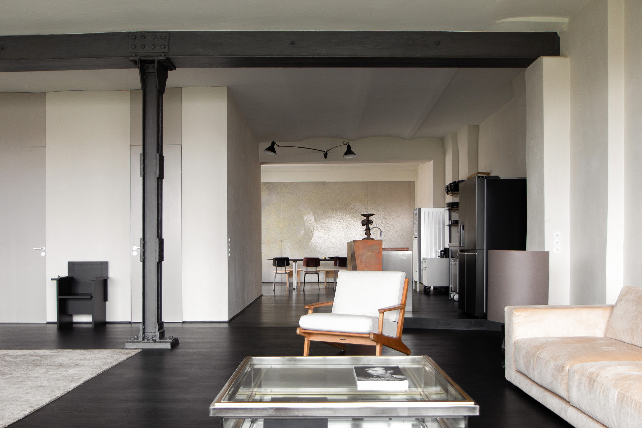 El interior combina toques minimalistas con elementos industriales, como altos techos abovedados y vigas de acero a la vista, que reflejan la historia del edificio. Se introduce un toque contemporáneo a través de líneas limpias y una mezcla equilibrada de muebles modernos y de época, incluidas sillas de Ludwig Mies van der Rohe, un escritorio y mesillas de noche Bauhaus de los años 30 y una mesa de centro de Maison Jansen. La paleta de colores neutros realza las características arquitectónicas, mientras que la escultural barra de la cocina sirve de punto focal único. Un llamativo tabique diseñado por el artista Markus Keibel funciona como separador de ambientes, ocultando ingeniosamente una puerta oculta al segundo dormitorio. Todas las zonas, desde el salón hasta los dormitorios, están cuidadosamente diseñadas pensando en la funcionalidad y el confort.
