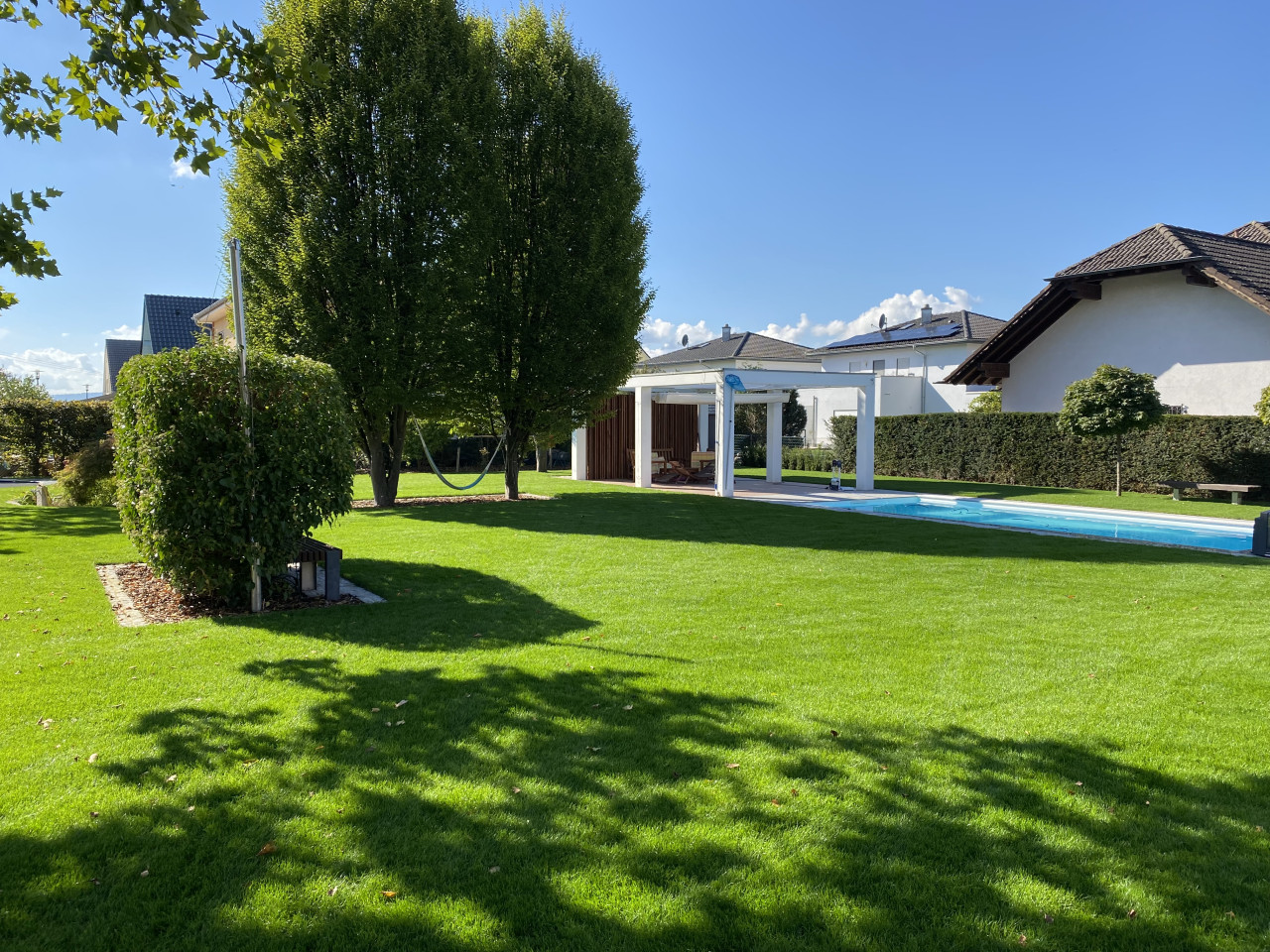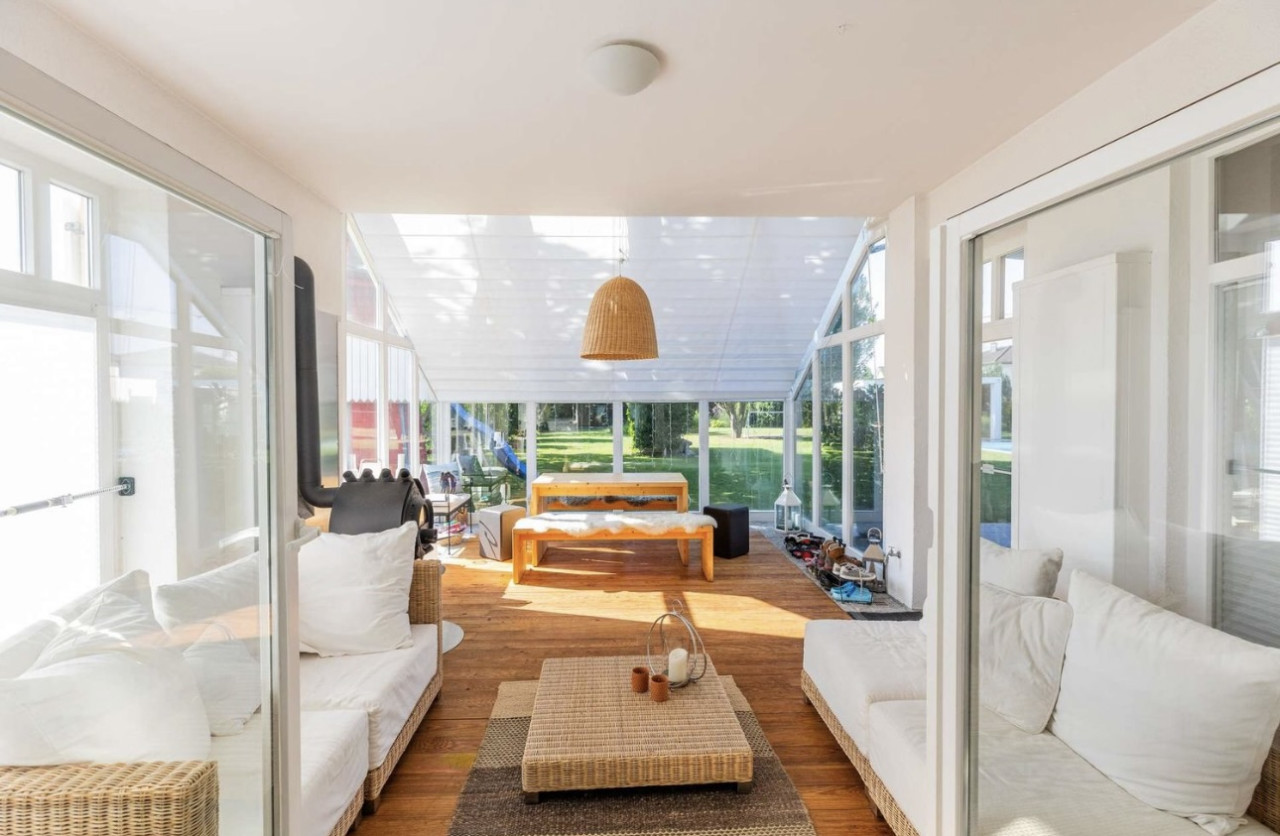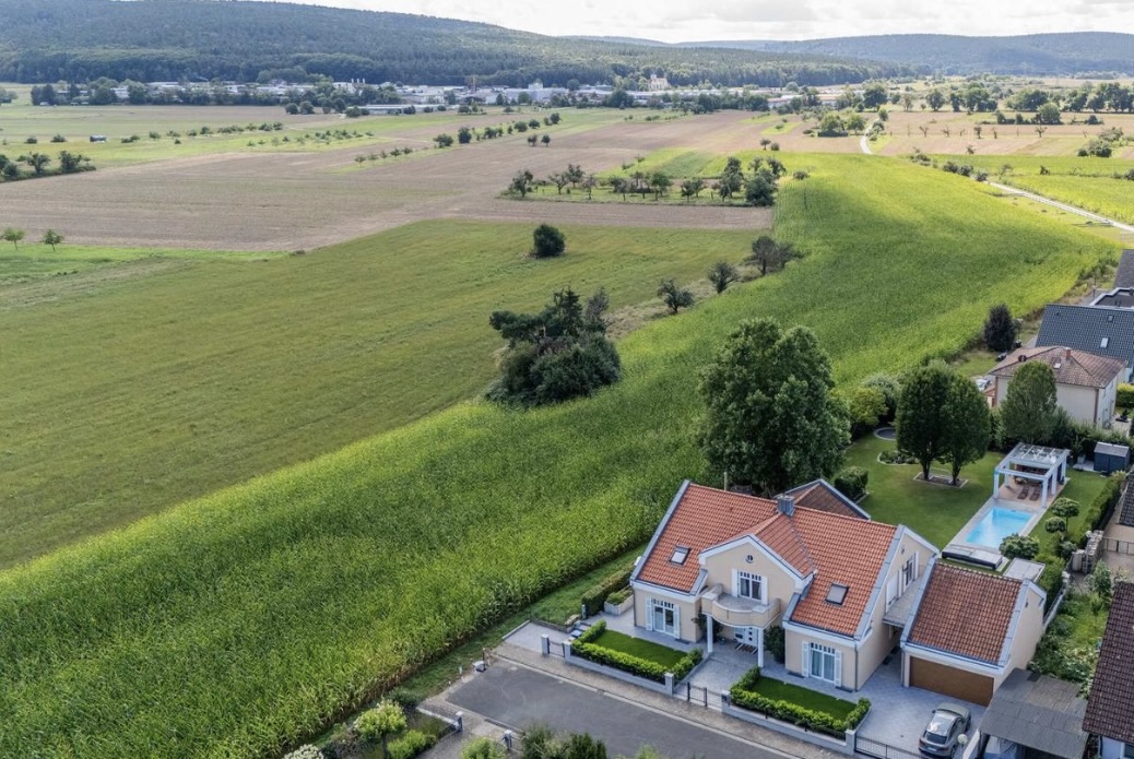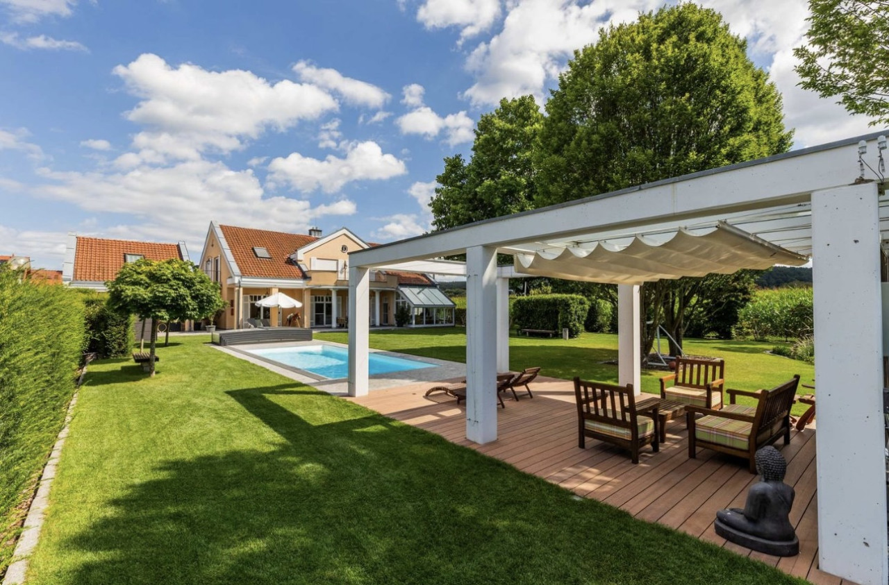 En el exterior, la propiedad incluye un gran jardín paisajista con amplias zonas de césped, árboles maduros y una terraza cubierta adecuada para el estilo de vida y las escenas veraniegas. El entorno es tranquilo, con vistas a los campos y al campo abierto, lo que garantiza una interferencia mínima de ruido para la grabación de audio.