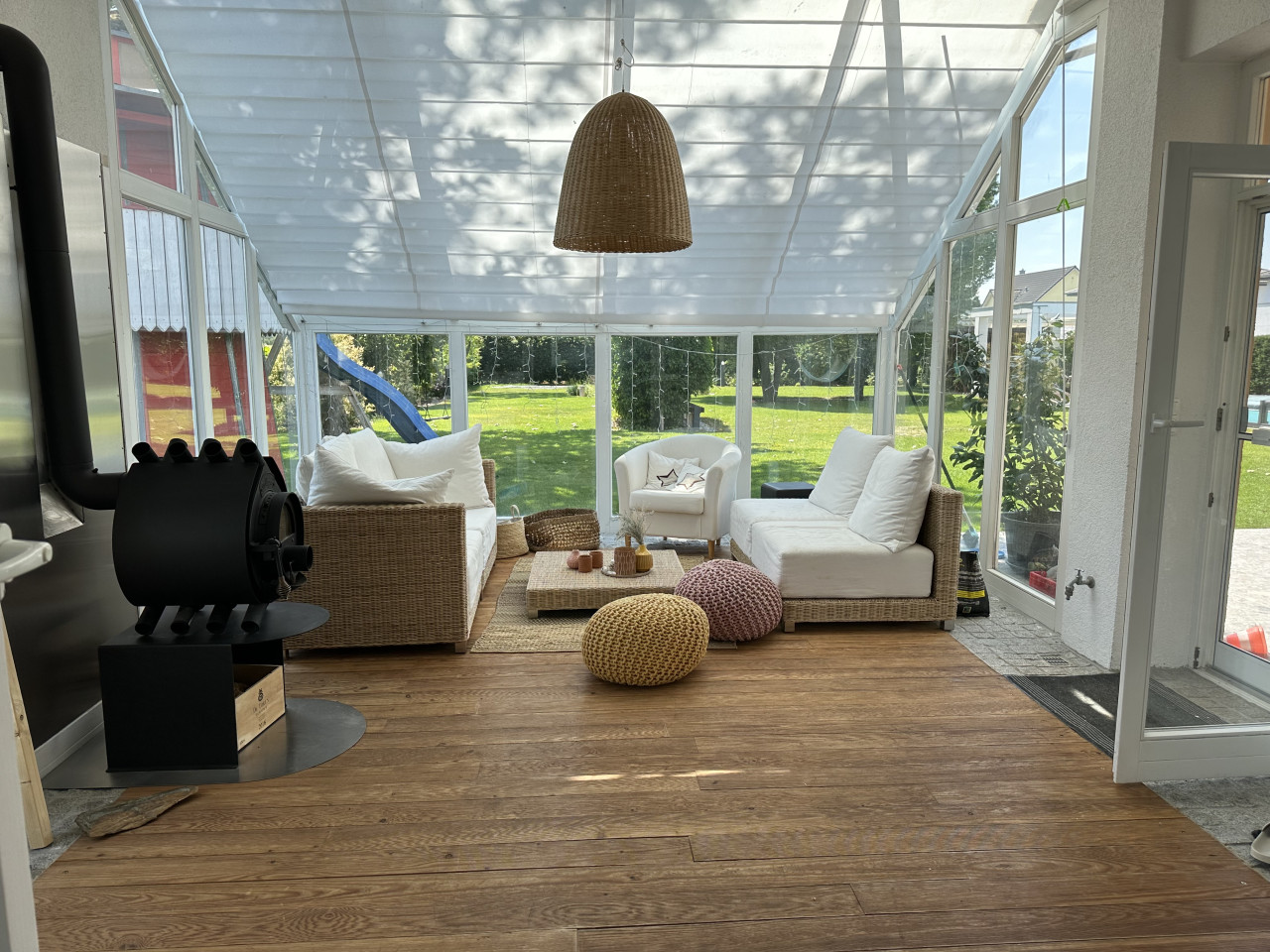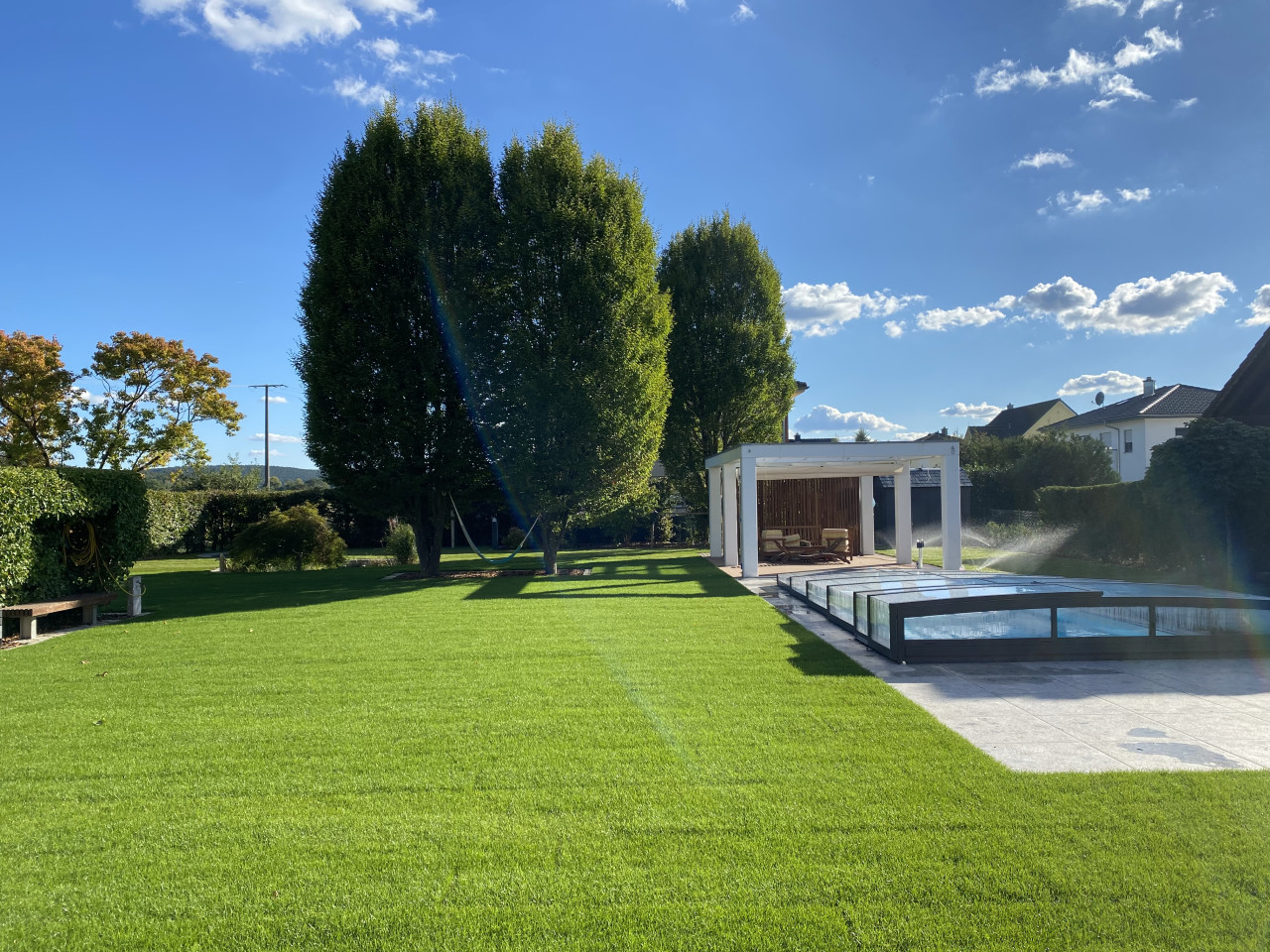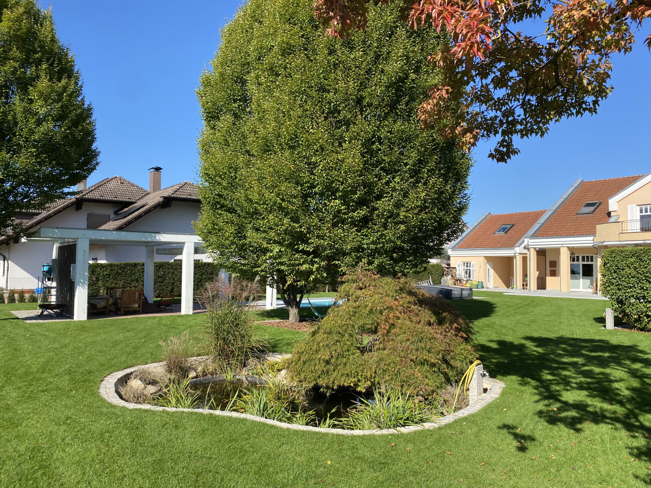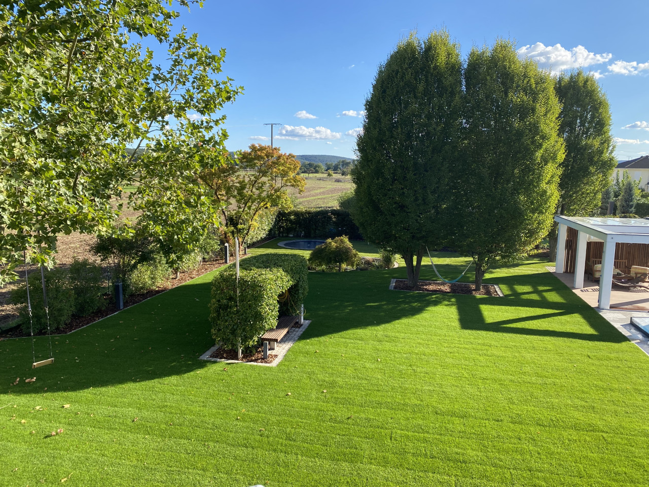 En el exterior, la propiedad incluye un gran jardín paisajista con amplias zonas de césped, árboles maduros y una terraza cubierta adecuada para el estilo de vida y las escenas veraniegas. El entorno es tranquilo, con vistas a los campos y al campo abierto, lo que garantiza una interferencia mínima de ruido para la grabación de audio.
