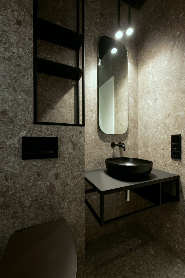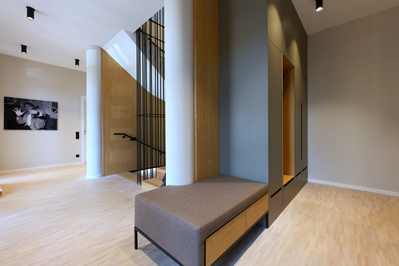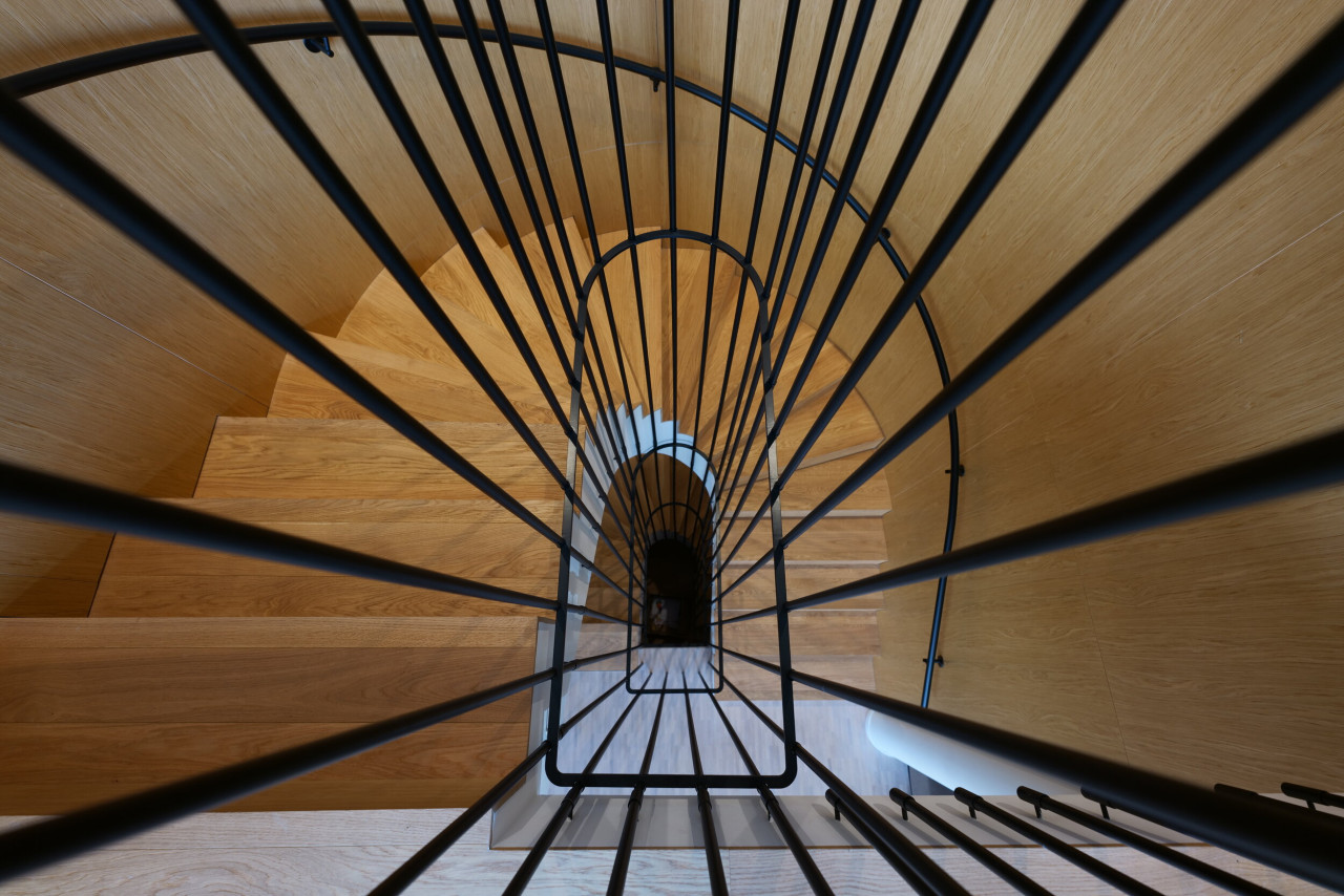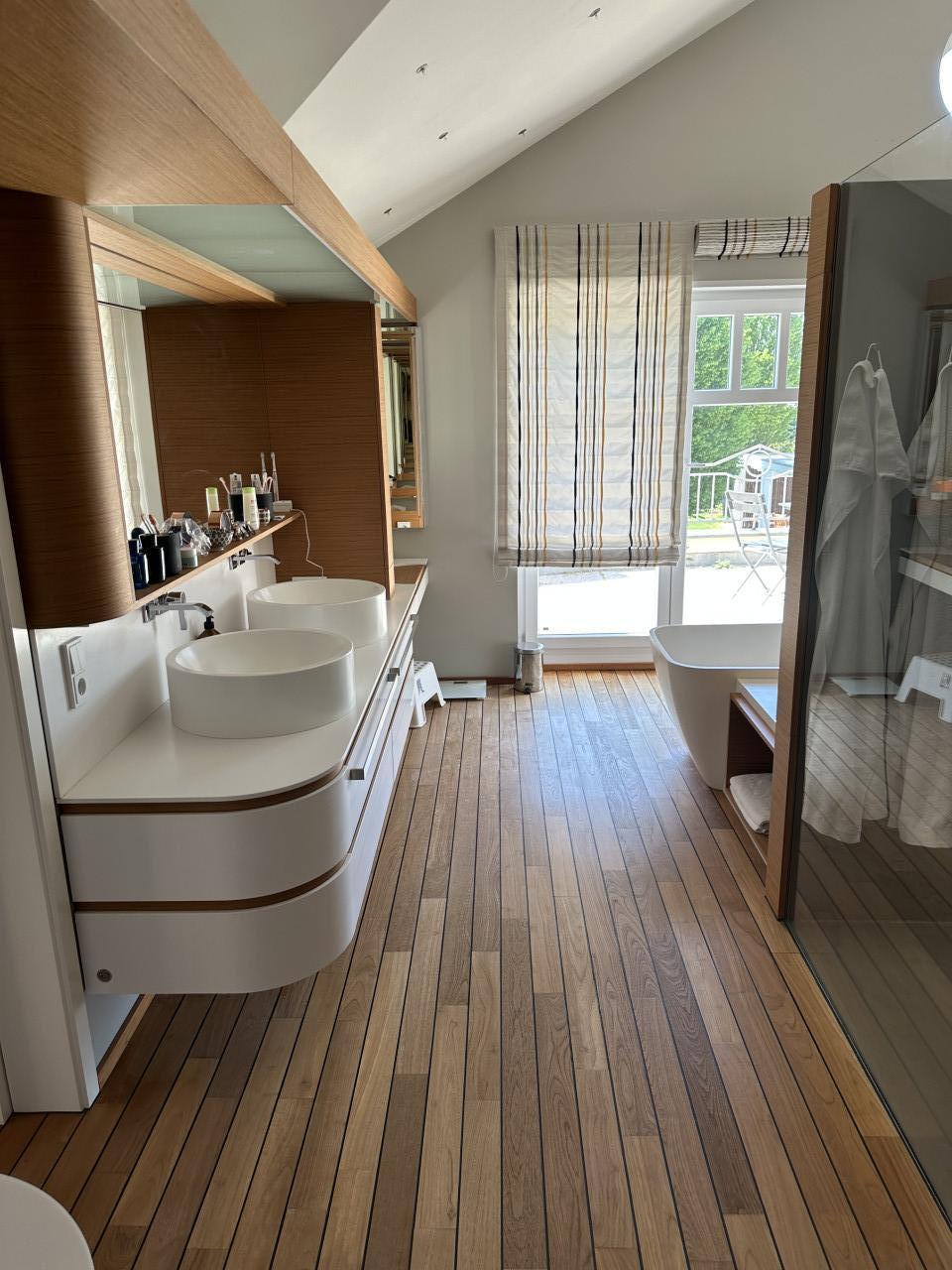 Las habitaciones son luminosas y acogedoras, con modernos suelos de madera, mientras que los cuartos de baño ofrecen un ambiente lujoso, tipo spa, con acabados de piedra natural y una iluminación moderna. Los pasillos y la escalera arquitectónica ofrecen ángulos visualmente interesantes y facilitan la circulación del personal y los equipos.