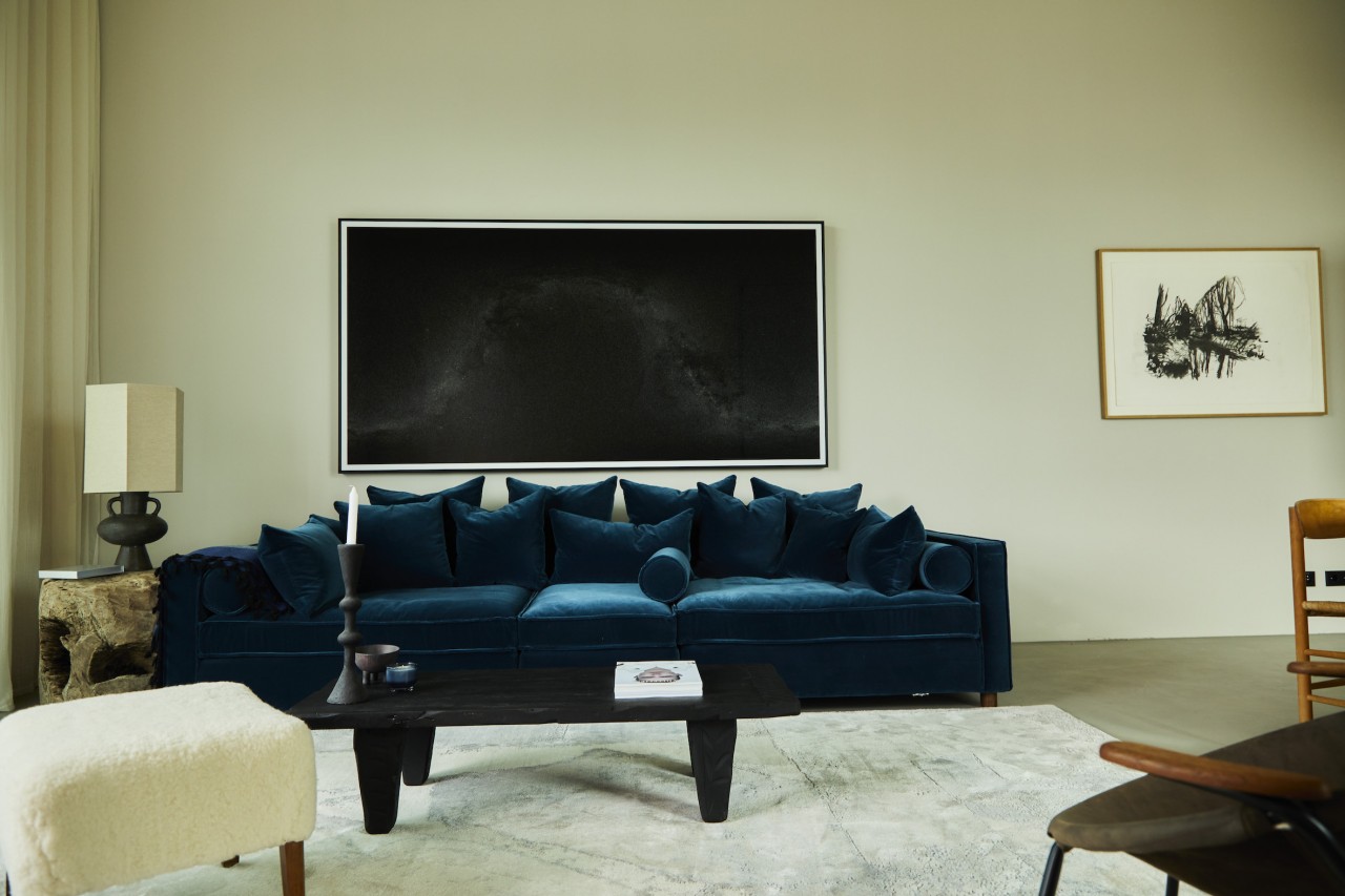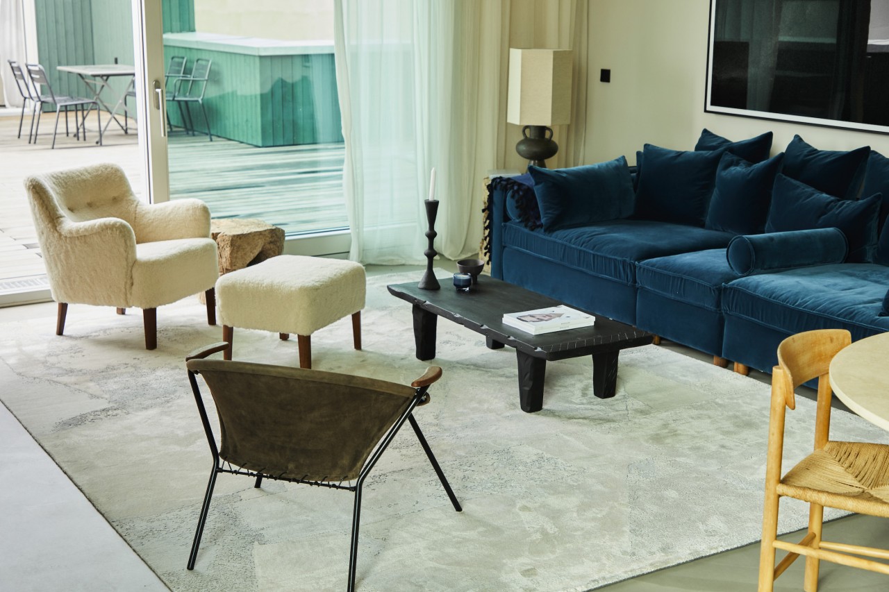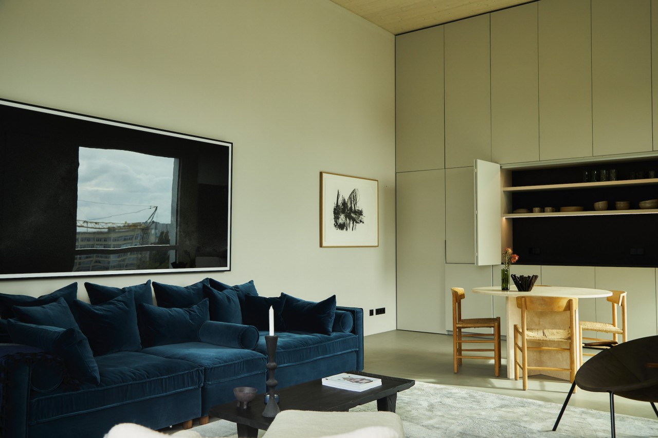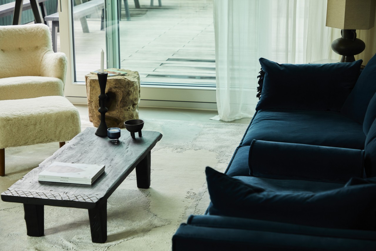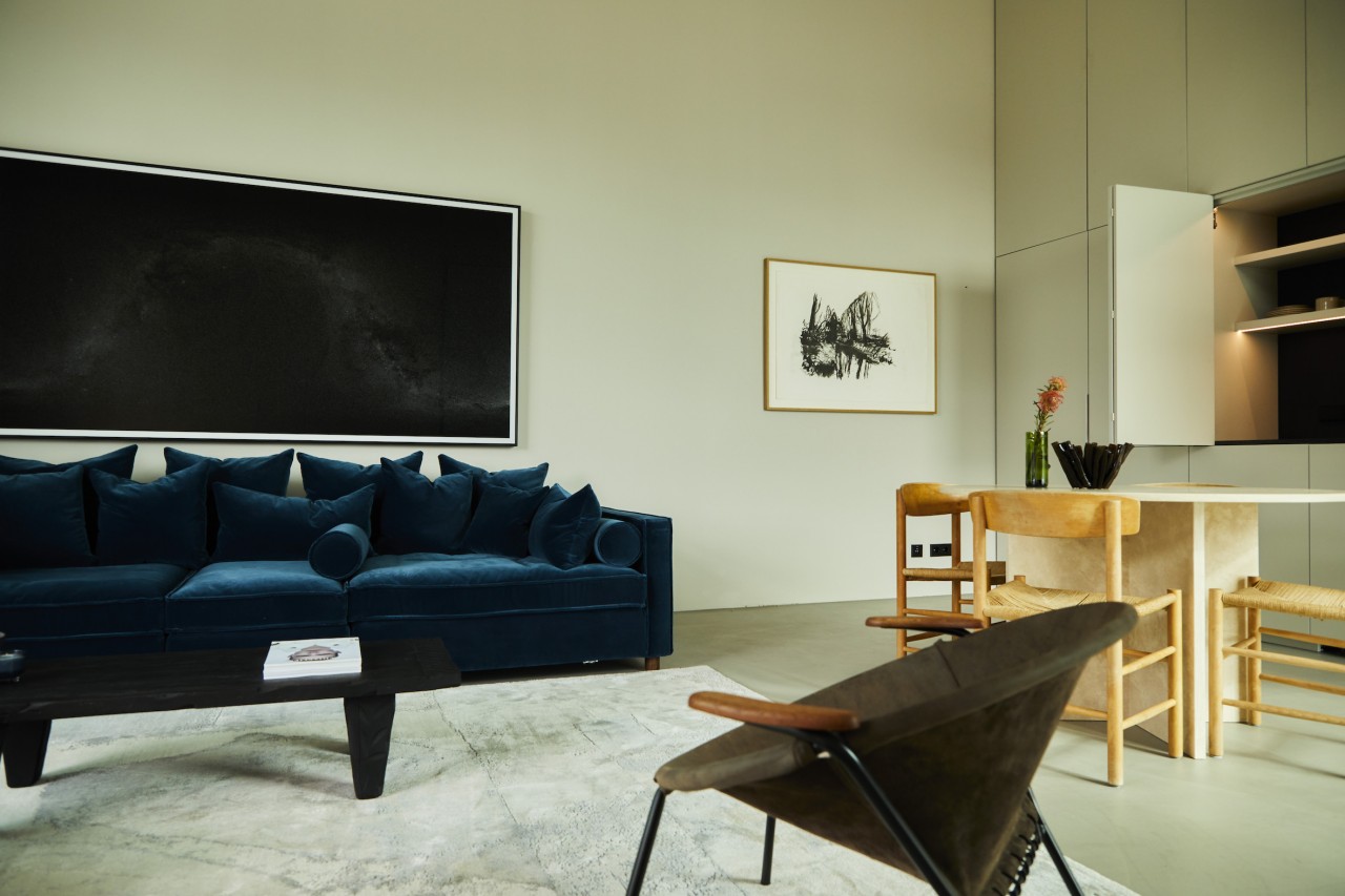 Un sofá de terciopelo azul intenso forma el corazón de este apartamento; el resto del mobiliario es decididamente sobrio, en colores naturales como el crema, el blanco y el gris para subrayar su luminosidad. Un grabado en madera de Markus Lüpertz y una fotografía de Chris Tille completan el diseño único de este apartamento.Los materiales de este apartamento viven de su elegancia minimalista: el travertino, el ratán en forma de corona, la cerámica brillante y el suave algodón combinado con el terciopelo de felpa crean una atmósfera acogedora que resaltan los juguetones rayos de luz de las ventanas del suelo al techo.