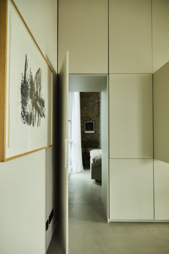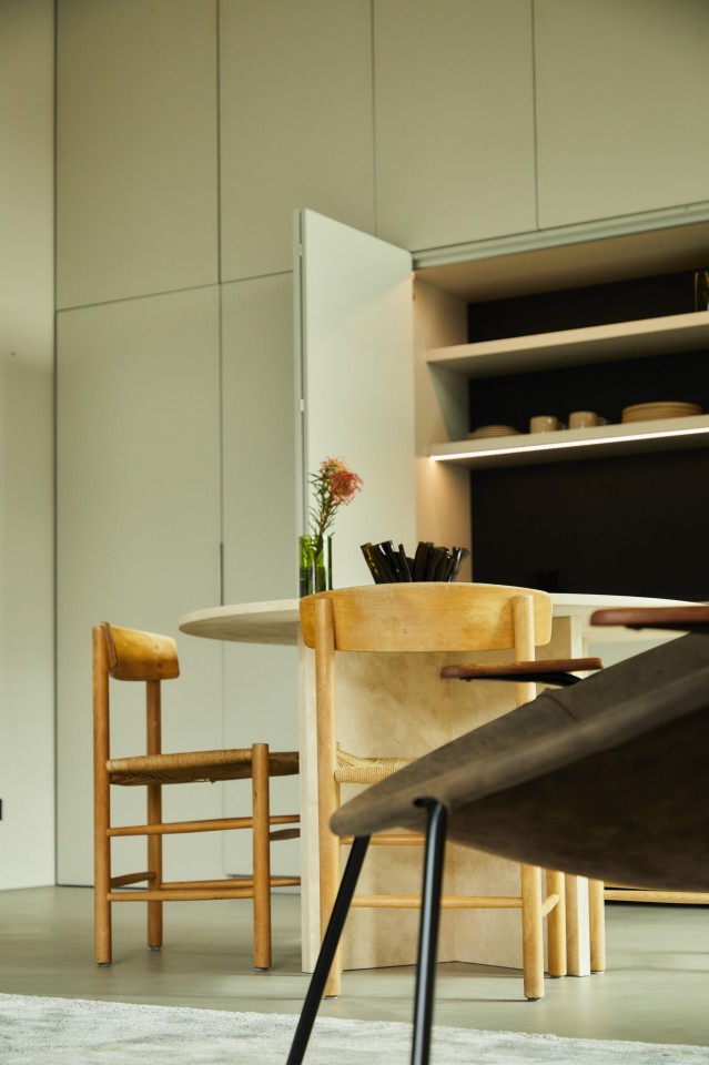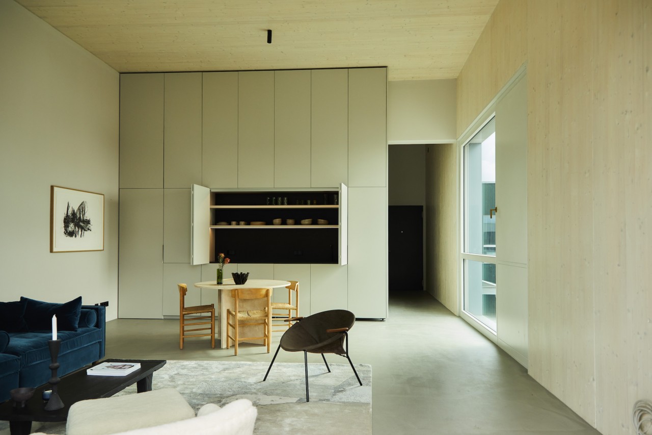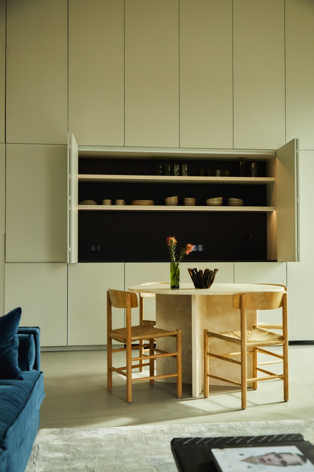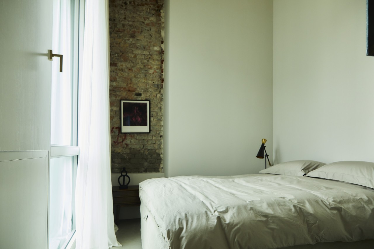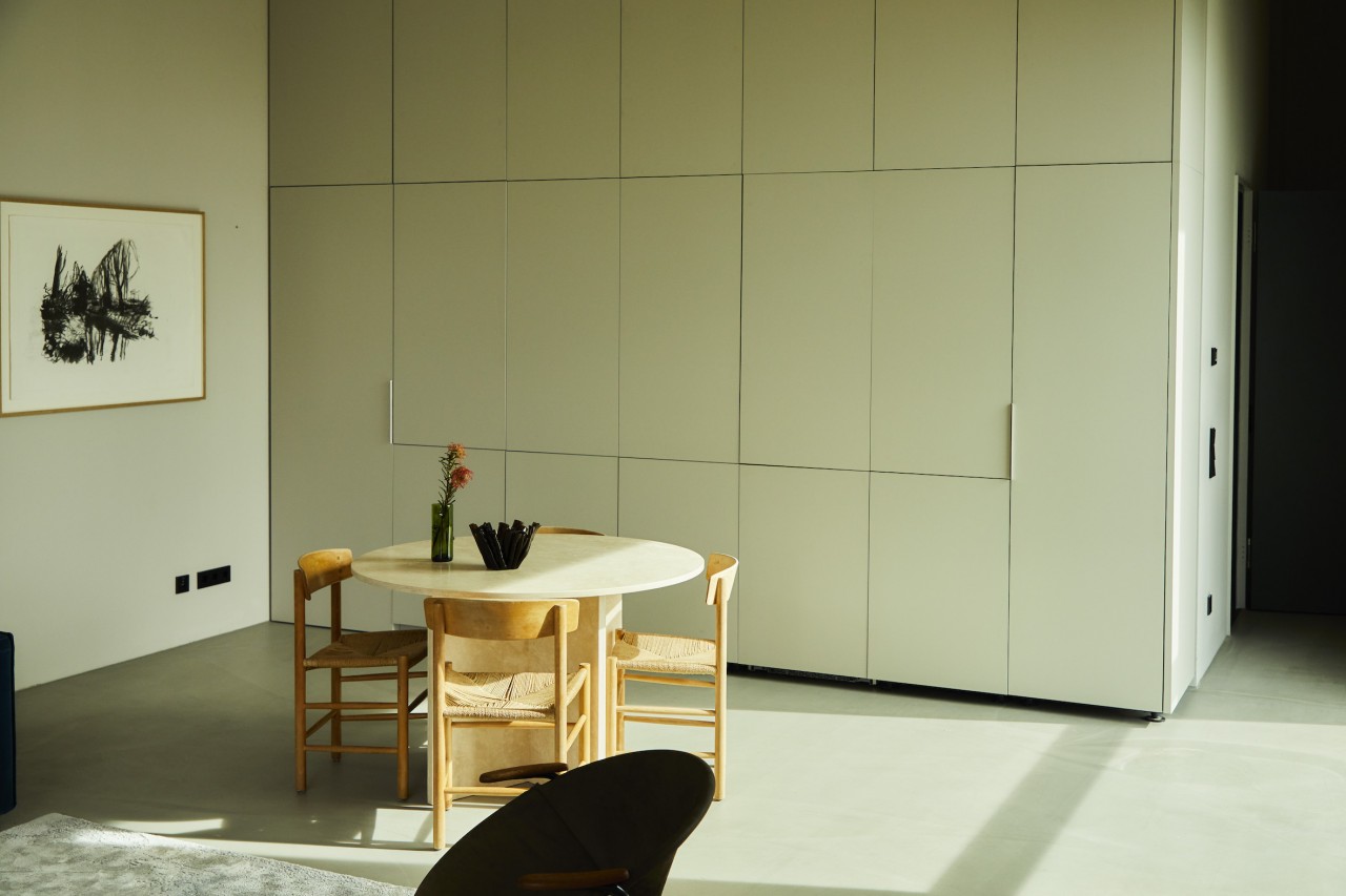 Un sofá de terciopelo azul intenso forma el corazón de este apartamento; el resto del mobiliario es decididamente sobrio, en colores naturales como el crema, el blanco y el gris para subrayar su luminosidad. Un grabado en madera de Markus Lüpertz y una fotografía de Chris Tille completan el diseño único de este apartamento.Los materiales de este apartamento viven de su elegancia minimalista: el travertino, el ratán en forma de corona, la cerámica brillante y el suave algodón combinado con el terciopelo de felpa crean una atmósfera acogedora que resaltan los juguetones rayos de luz de las ventanas del suelo al techo.