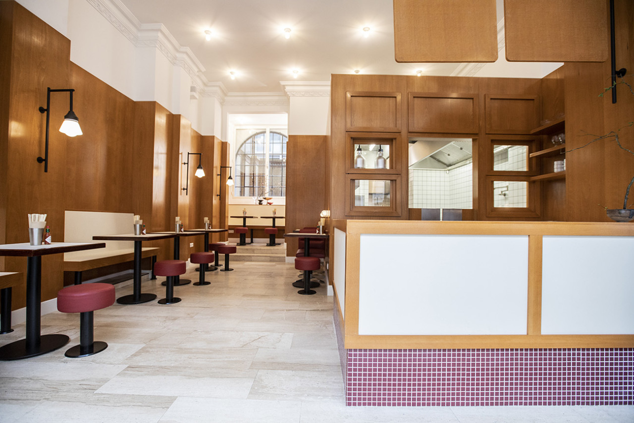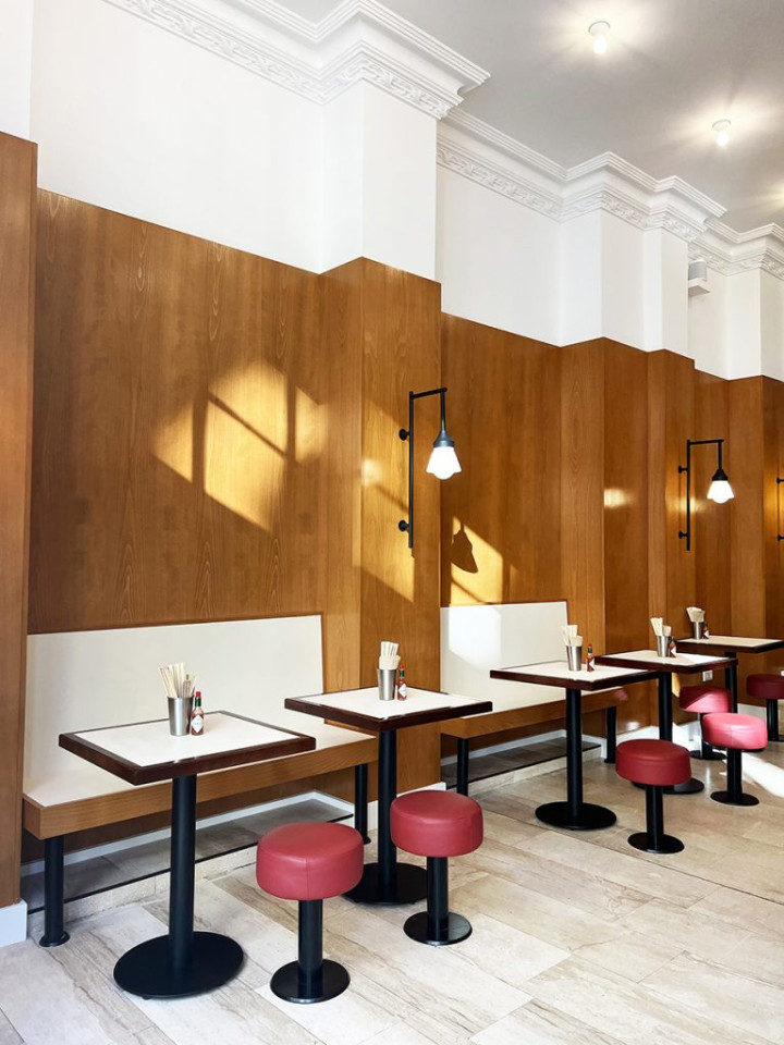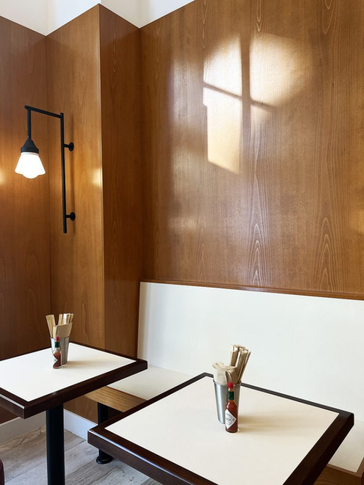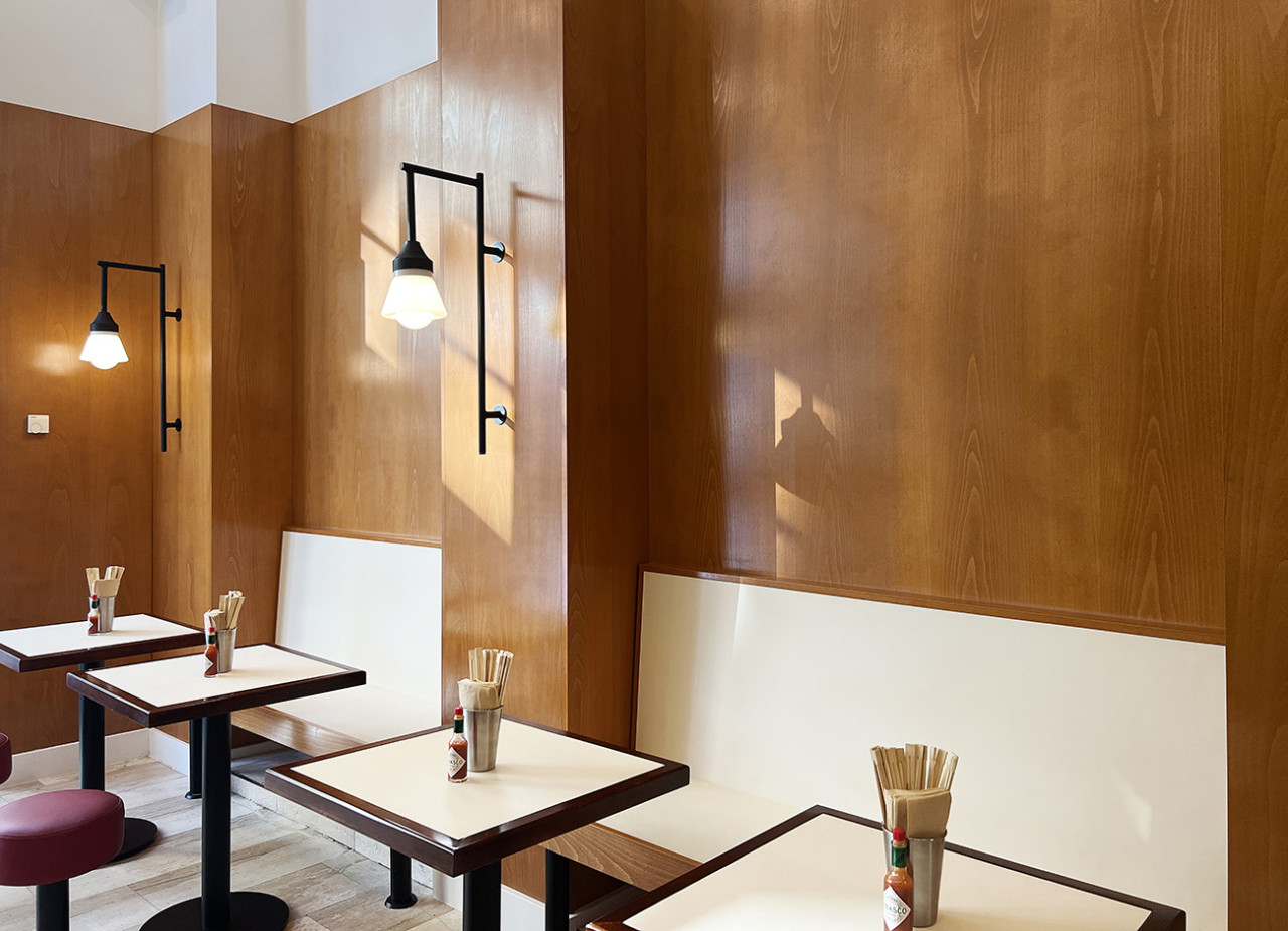 Este espacio íntimo y de diseño vanguardista canaliza un ambiente retrofuturista con precisión lúdica. Las superficies de azulejos brillantes, los detalles cromados curvados y los toques de neón dan un tono vibrante, mientras que la iluminación suave y los elementos minimalistas de madera añaden calidez y equilibrio. La paleta de colores (tonos rubor, verdes apagados y toques de rojo) resulta nostálgica y fresca a la vez. Compacto pero ingeniosamente distribuido, el espacio invita a una dinámica gama de usos, desde estilizadas sesiones fotográficas a acogedores eventos privados. Es un entorno visualmente atractivo que combina la nostalgia de un restaurante con un toque claramente moderno.
