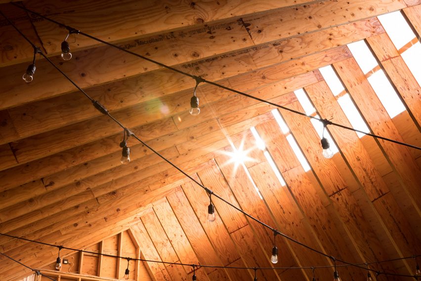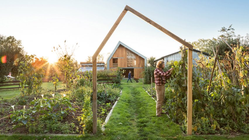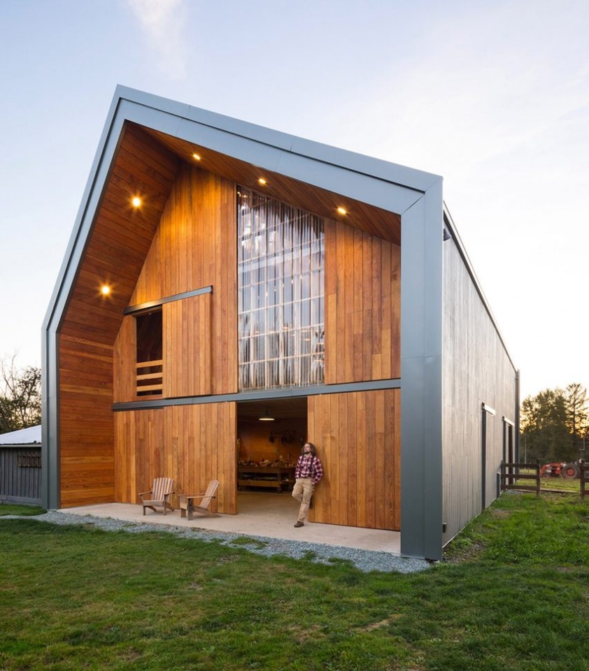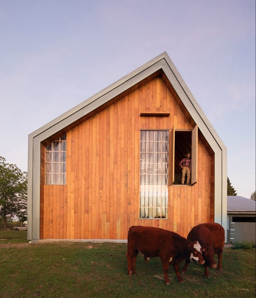 La sencillez de la forma del granero de Swallowfield recuerda intencionadamente a los graneros tradicionales norteamericanos, visibles en los pastos de las granjas vecinas. El llamativo perfil inclinado del tejado del granero crea una entrada cálida y acogedora, visible desde la granja a través de los jardines y huertos.