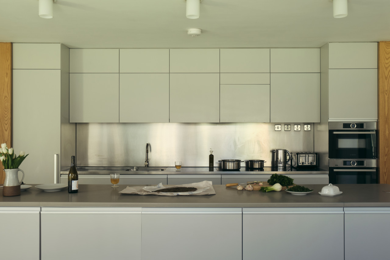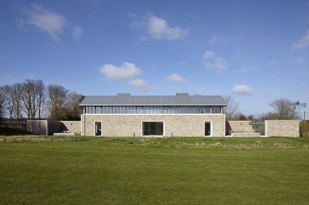 La casa, una respuesta audaz y hermosa a su entorno, cuenta con un monumental muro de sílex hecho a mano, que rinde homenaje a las iglesias y graneros históricos de Anglia Oriental. El diseño fusiona la artesanía tradicional con la arquitectura contemporánea, creando un refugio distintivo y atmosférico.