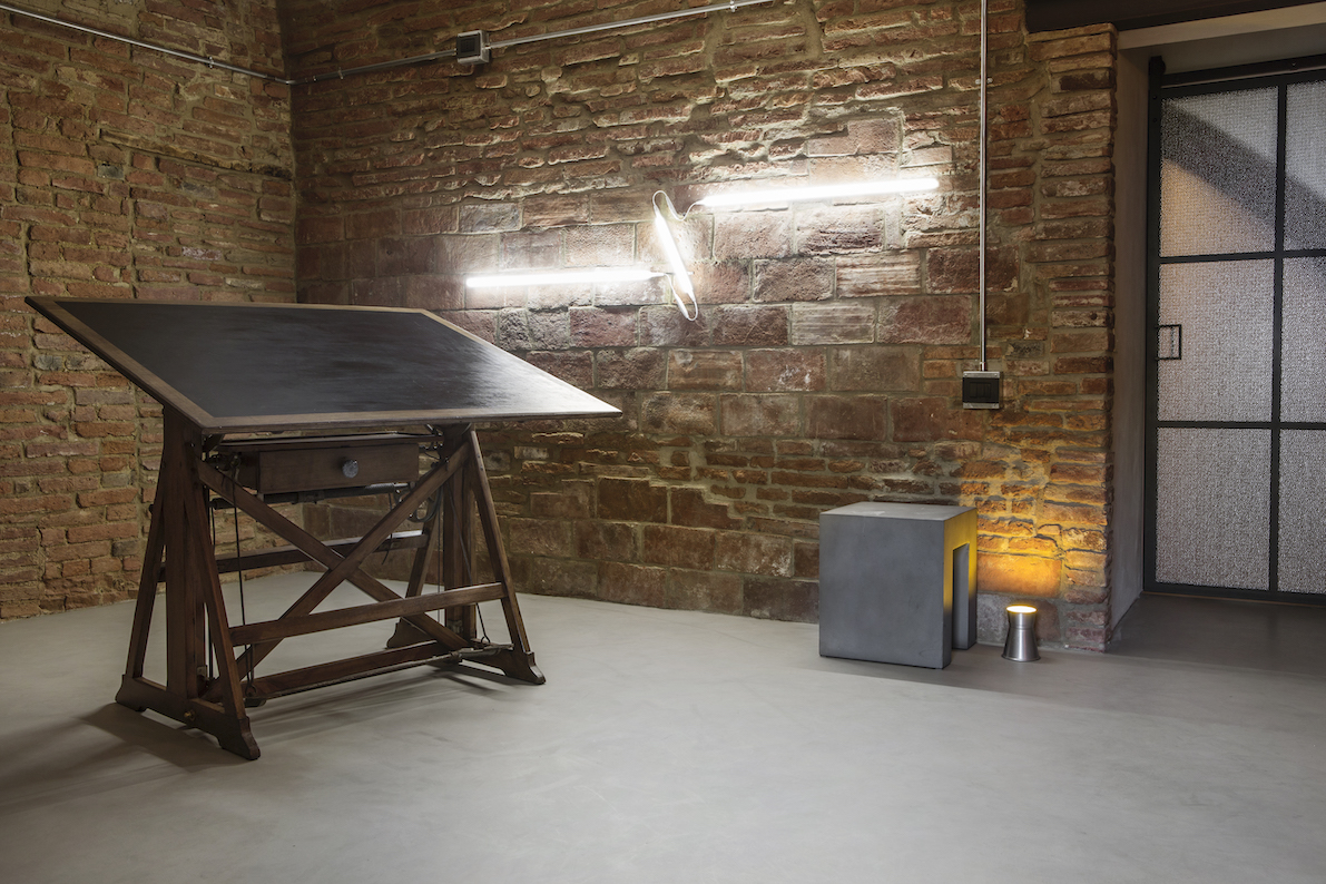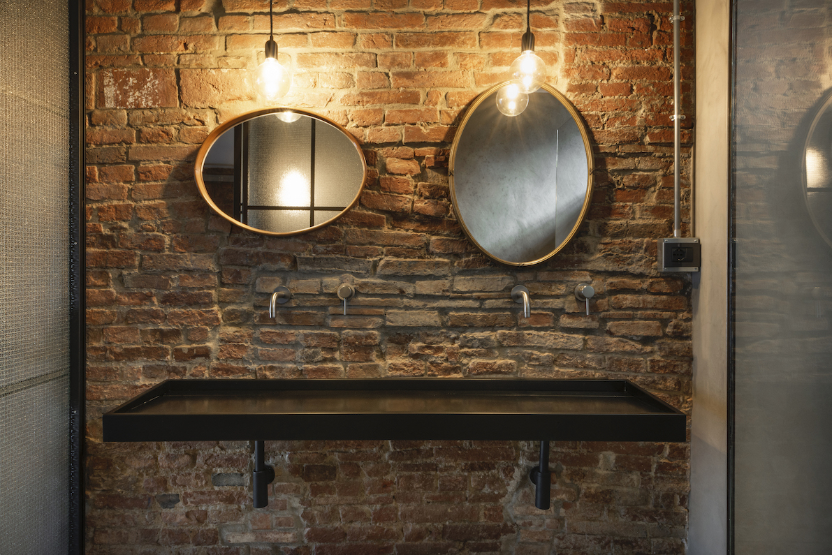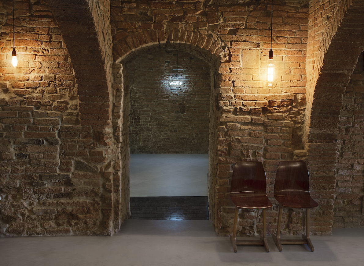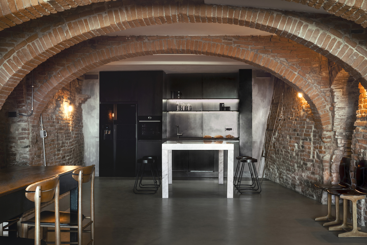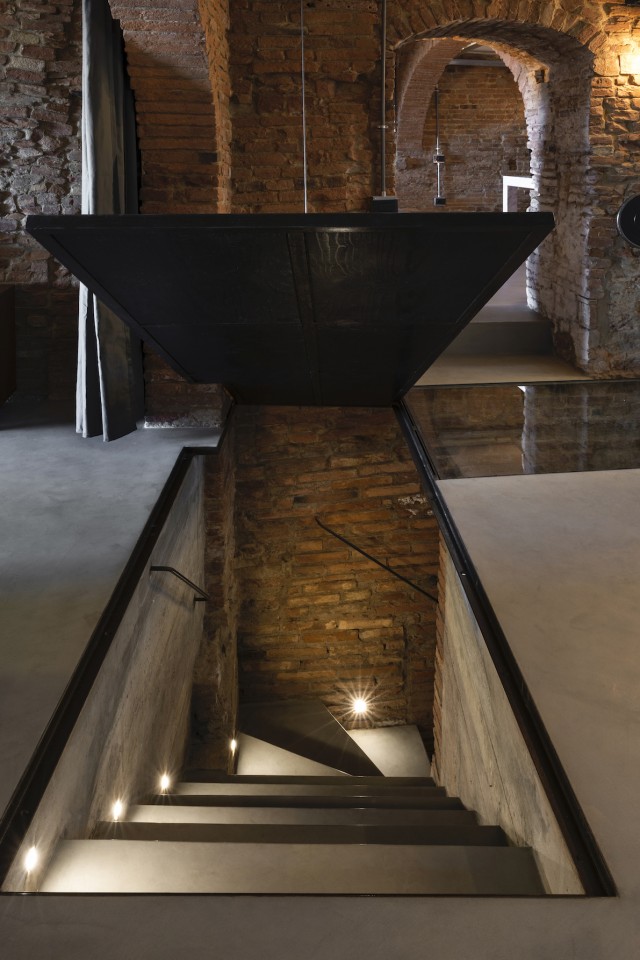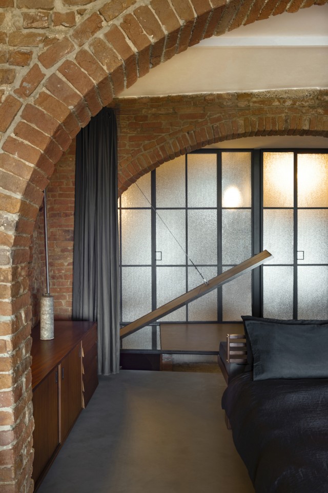 Diseñado para reforzar la sensación de misterio y descubrimiento, así como su privacidad, el nivel subterráneo puede aislarse completamente de las habitaciones de arriba. Un gigantesco sifón retráctil, a ras del suelo del dormitorio principal'puede abrirse a voluntad mediante un sistema mecánico hecho a medida que incorpora a la perfección una estética industrial a la antigua obra de albañilería de ladrillo y mortero. Al tiempo que maximiza la versatilidad de todo el espacio, el sistema cinético también pretende introducir un elemento de juego y sorpresa: el suelo pivota y se inclina repentinamente hacia arriba mediante una manivela manual conectada al suelo a través de un conjunto de engranajes personalizados, tan suave y ligero que hasta un niño podría manejarlo con facilidad.