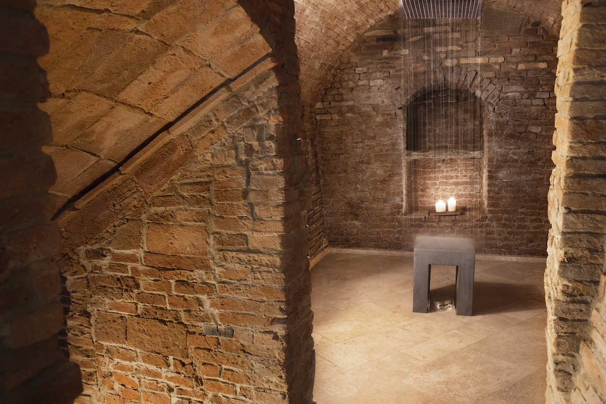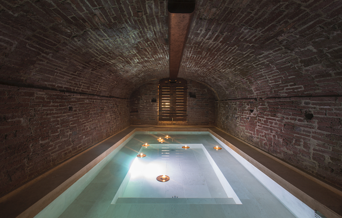 Entre las dos alas, una escalera oculta conduce sorprendentemente a la parte más antigua del edificio: un spa privado con una piscina subterránea y una sala de duchas de lluvia bajo techos abovedados de mampostería.