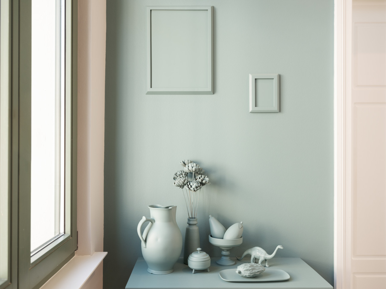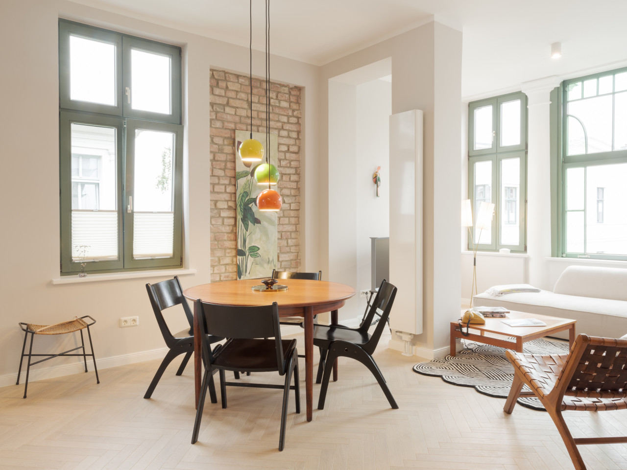 La casa colpisce per gli ambienti spaziosi, i soffitti alti e i pavimenti in vero legno. Le stanze offrono ampi assi visivi e un ambiente elegante, con i colori grigi delle pareti che forniscono sfondi ideali per i servizi fotografici. All'interno, i mobili di metà secolo scelti a mano creano una miscela armoniosa di design e storia.