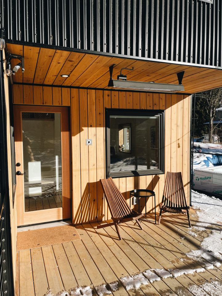 -La terrazza anteriore è dotata di luci per il patio e di una stufa sospesa per le giornate più fresche.