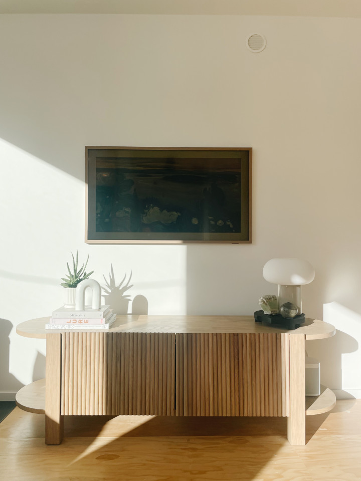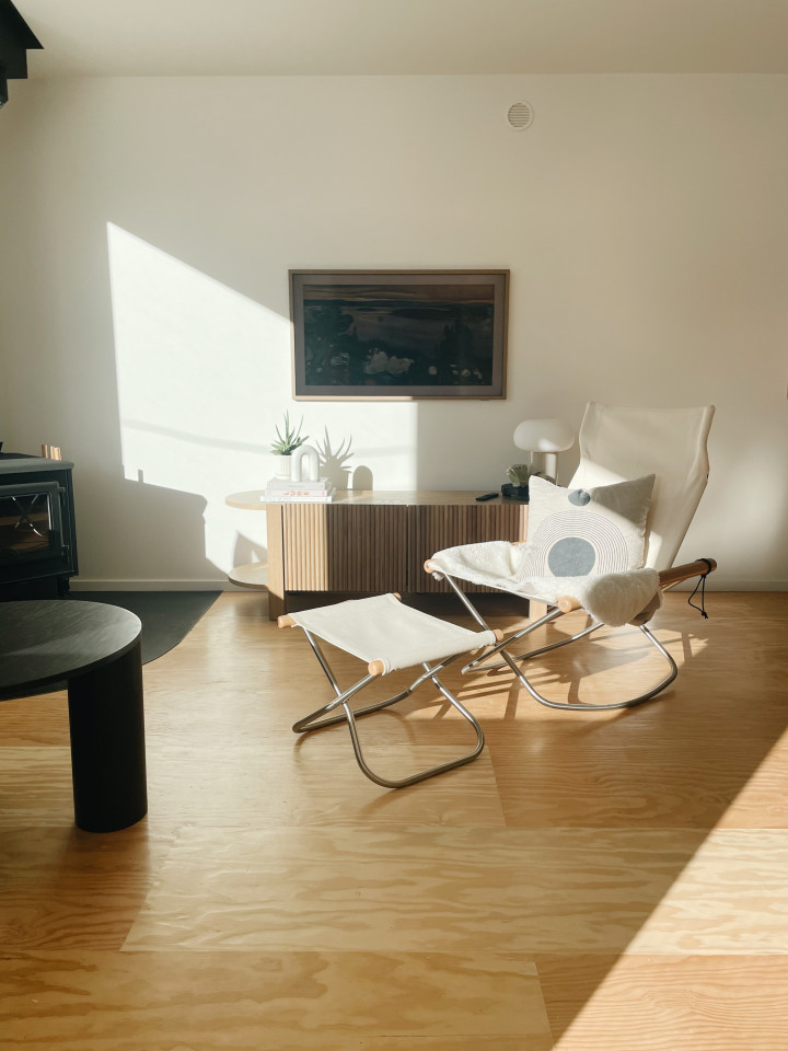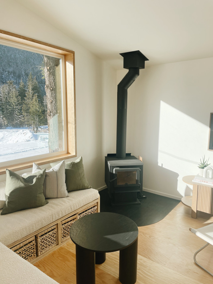 -Il soggiorno è caratterizzato da finestre panoramiche oversize, stufa a legna e TV Samsung Frame.