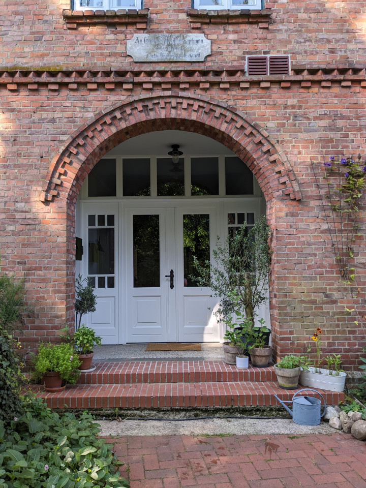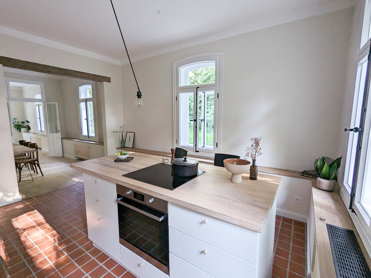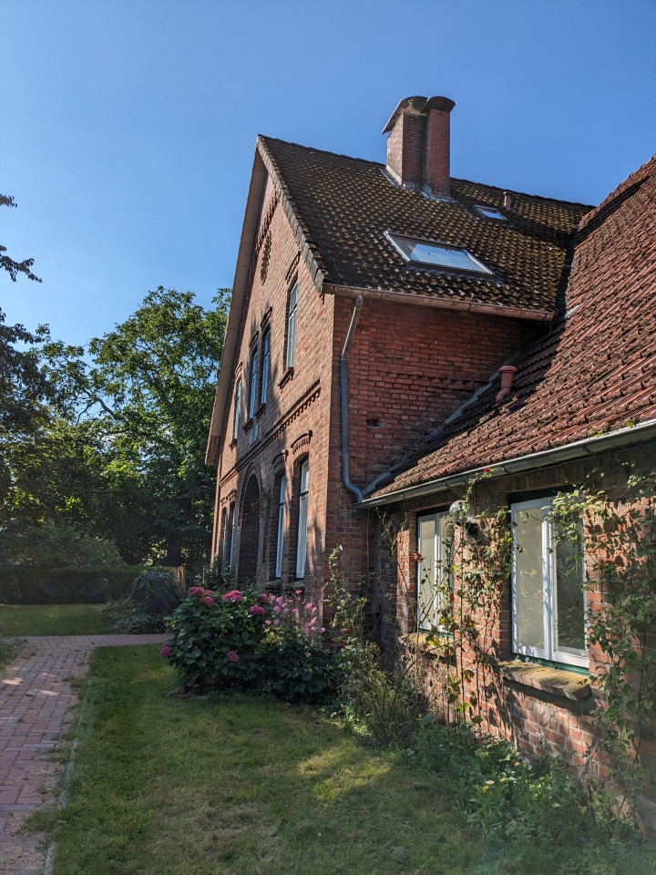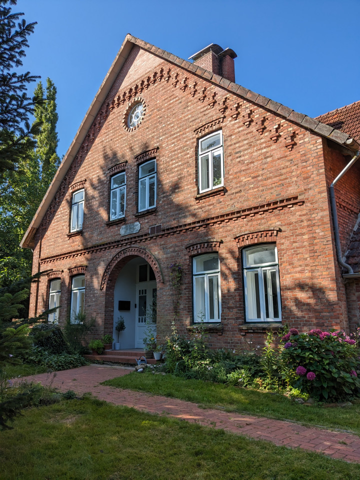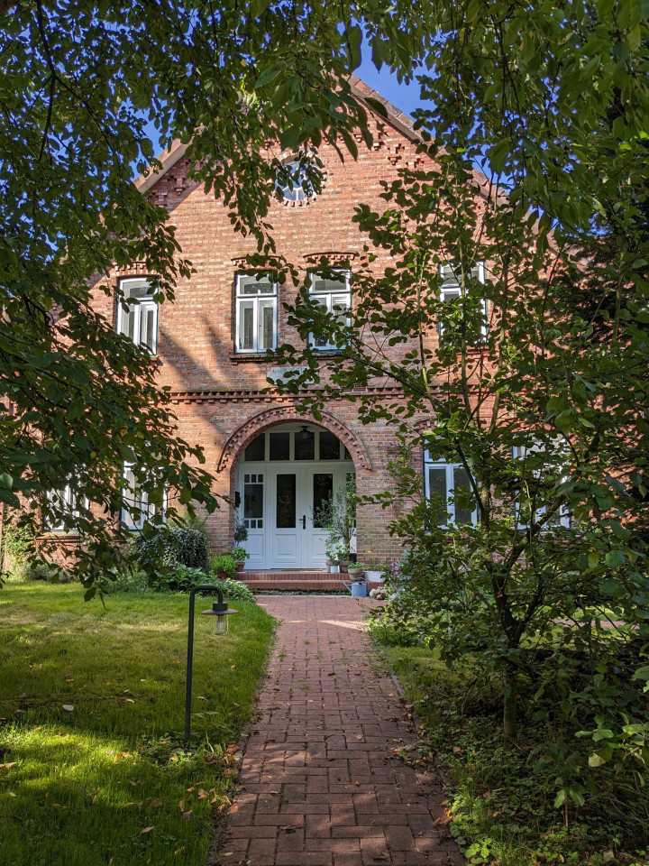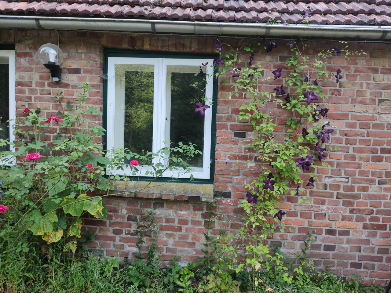 A refined convergence of historic brickwork and curated modernity, this evocative house presents a cinematic canvas for creative projects. The exterior—classic red and white brick, climbing florals, and an arched entry framed by lush gardens and sunlit pathways—offers timeless, editorial backdrops with a subtle rural nostalgia, inviting striking transitions from verdant serenity to contemporary interiors. Mature trees and sculpted greenery envelop the distinct facade, while terracotta roof tiles and original architectural contours lend a narrative richness and sense of place rarely encountered.