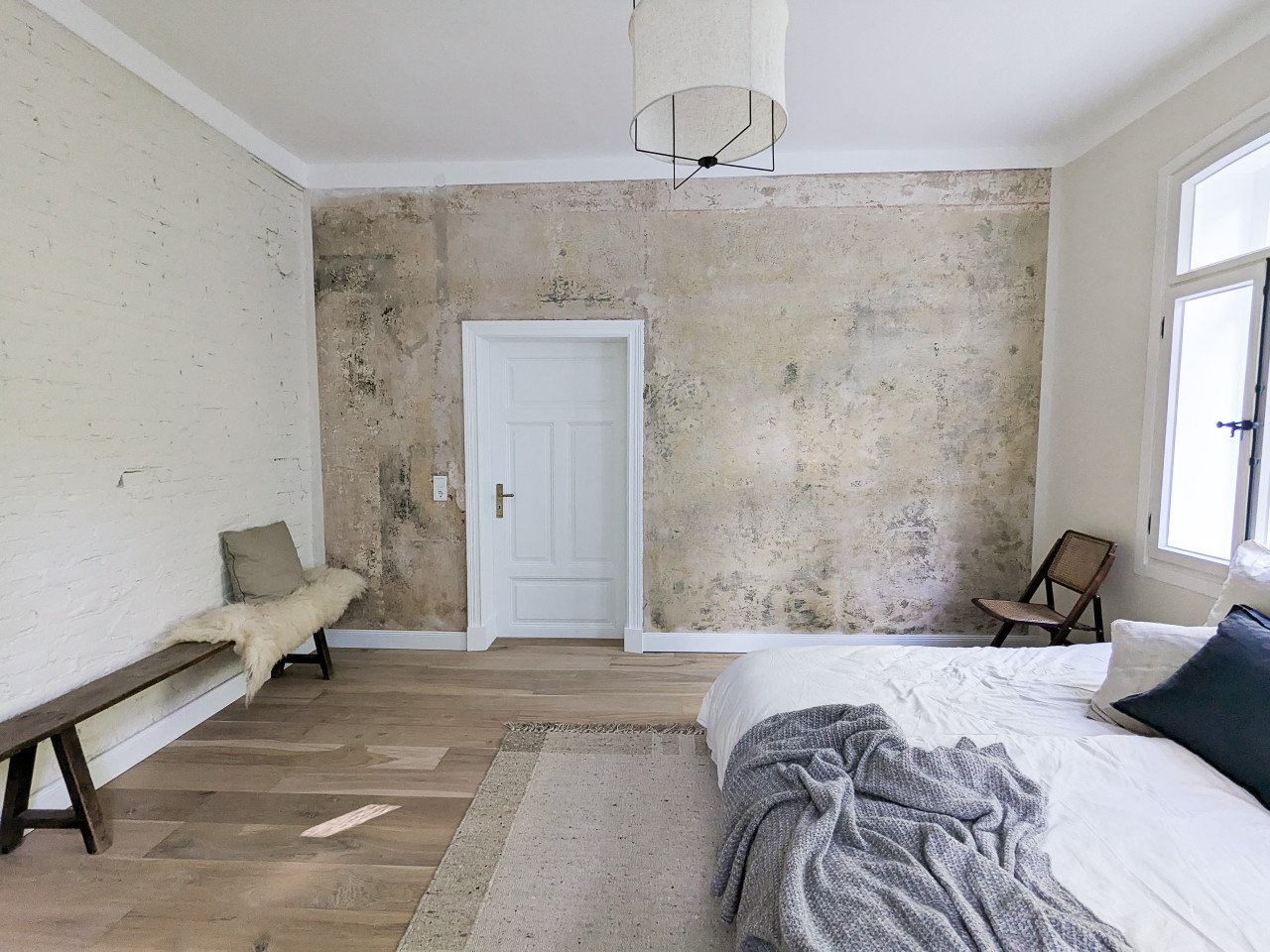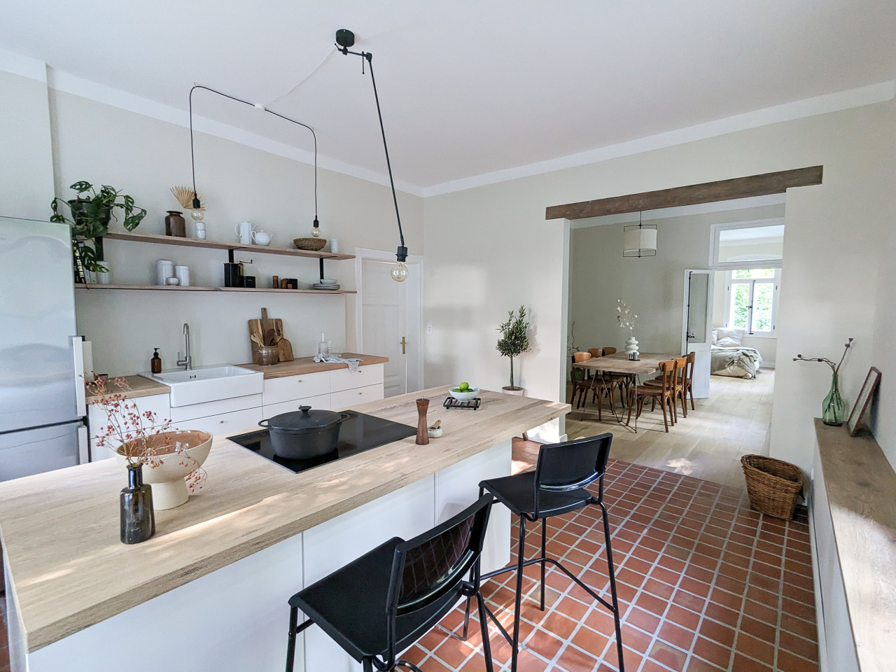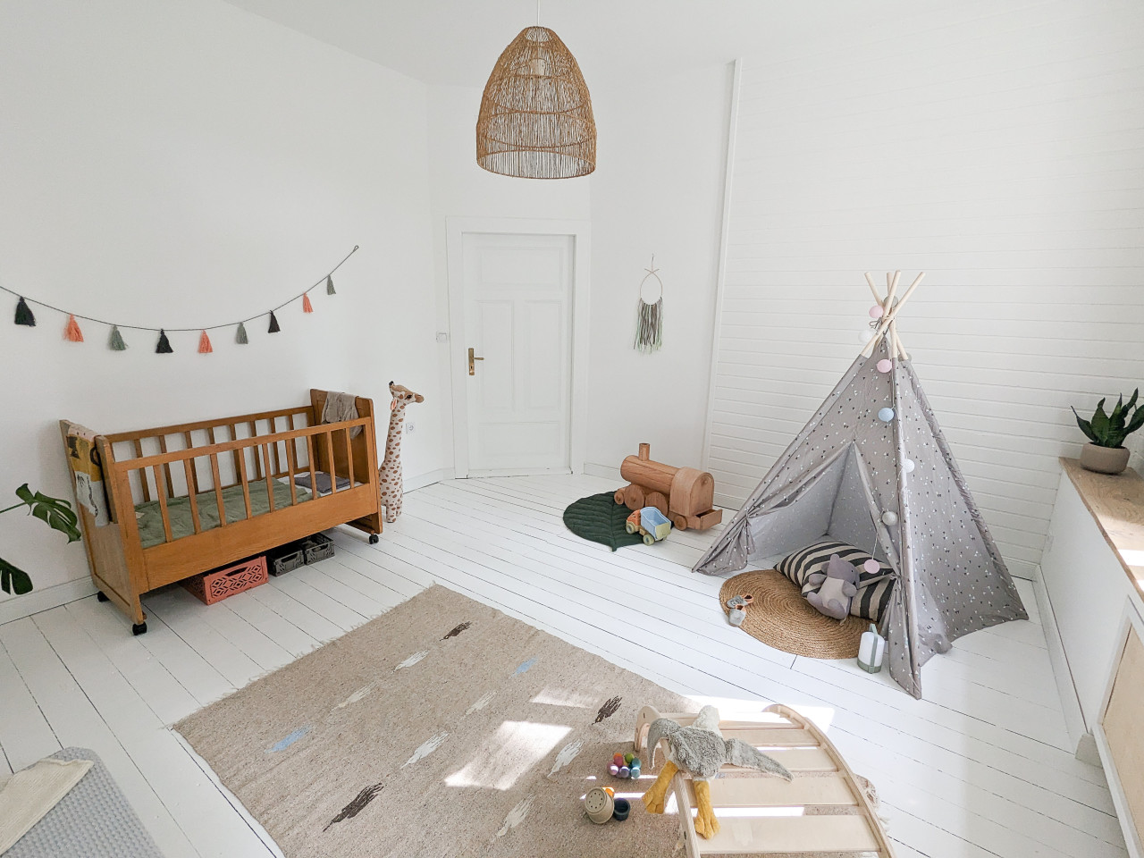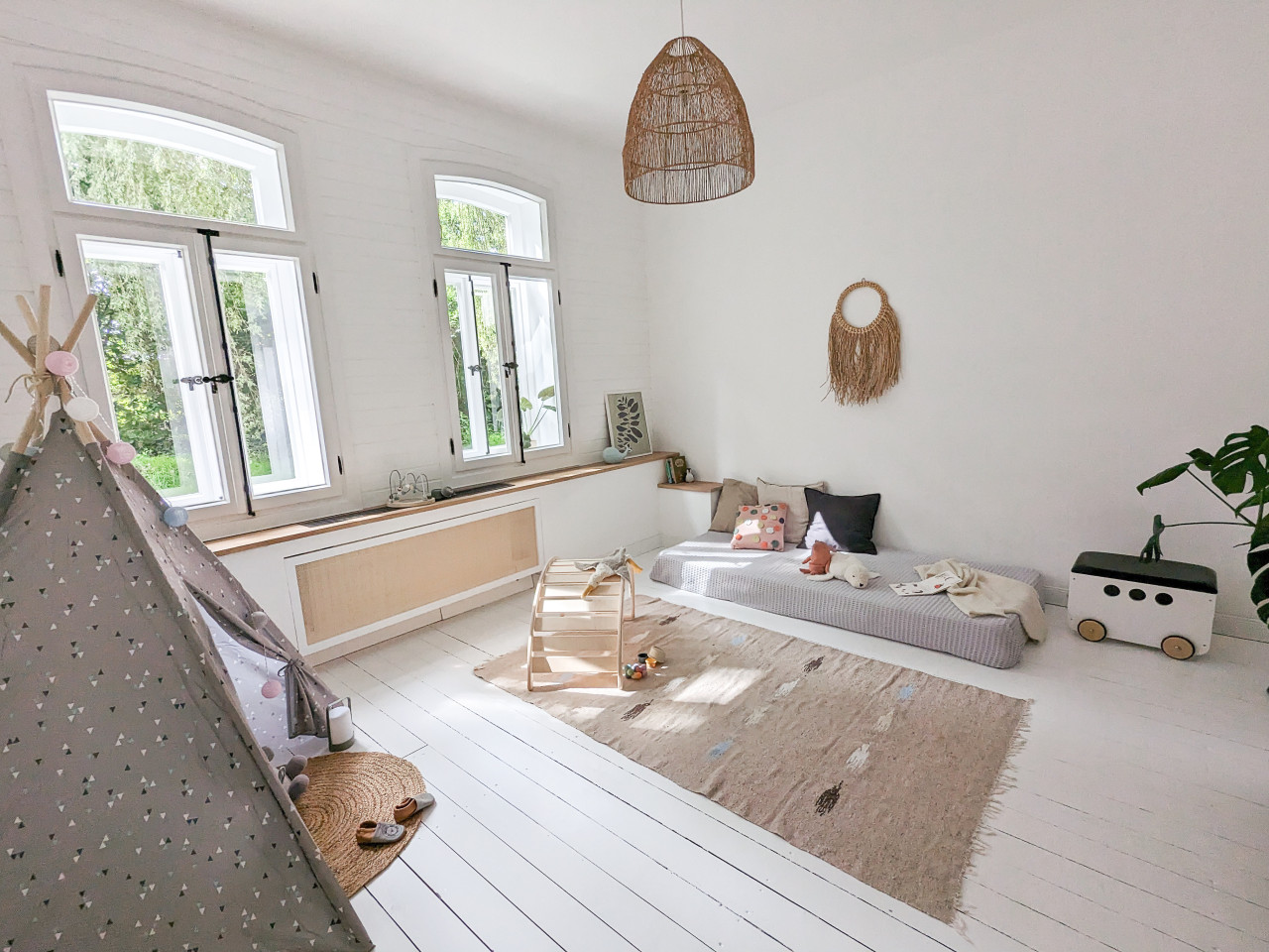 Inside, natural light floods minimalist, airy rooms through oversized windows and sheer curtains, accentuating textured white brick walls, smooth plaster, and a palette of white, greys, and soft earth tones. Open-plan living, dining, and kitchen spaces reveal a masterful interplay of materials: terrazzo and terracotta tiles, wooden beams, brushed metal, and sleek cabinetry. Thoughtfully staged vignettes—plush green sofas, woven chairs, sculptural vases, leafy plants, and curated wall art—evoke both drama and tranquility. The composition of contemporary furnishings, rustic layering, and playful children's spaces shapes an environment that is both welcoming and visually arresting—ideal for high-end editorial shoots, film sets, or immersive brand experiences.