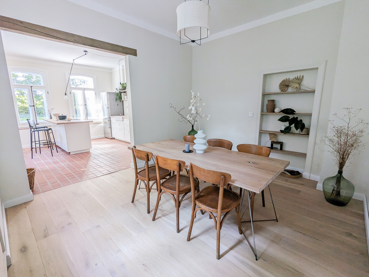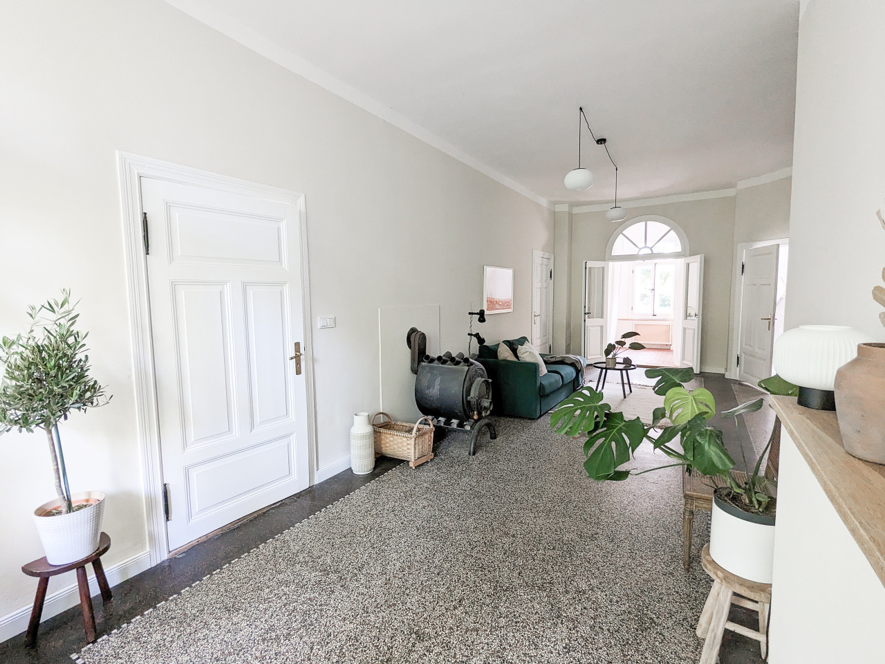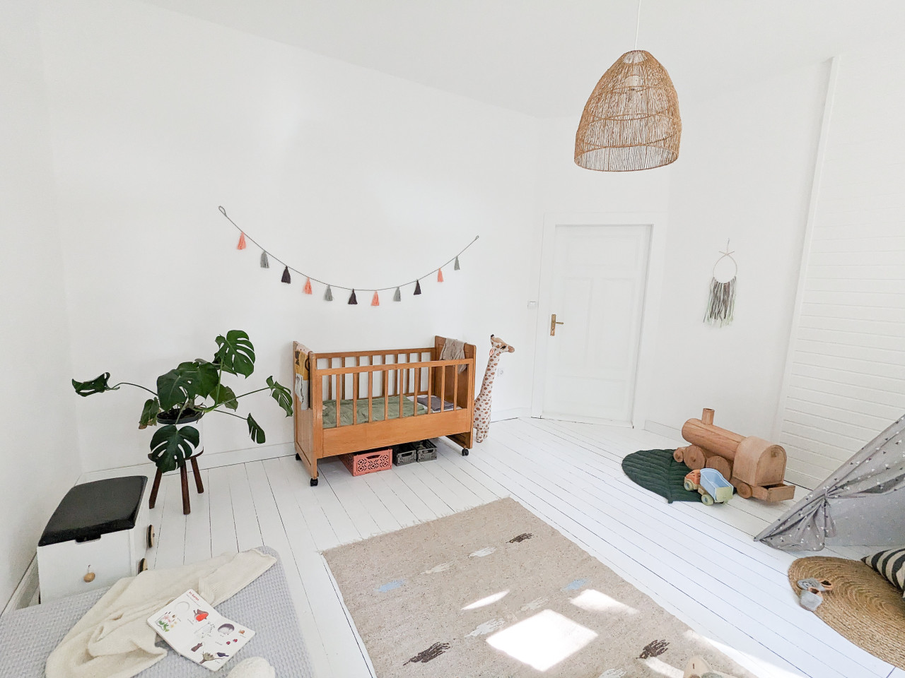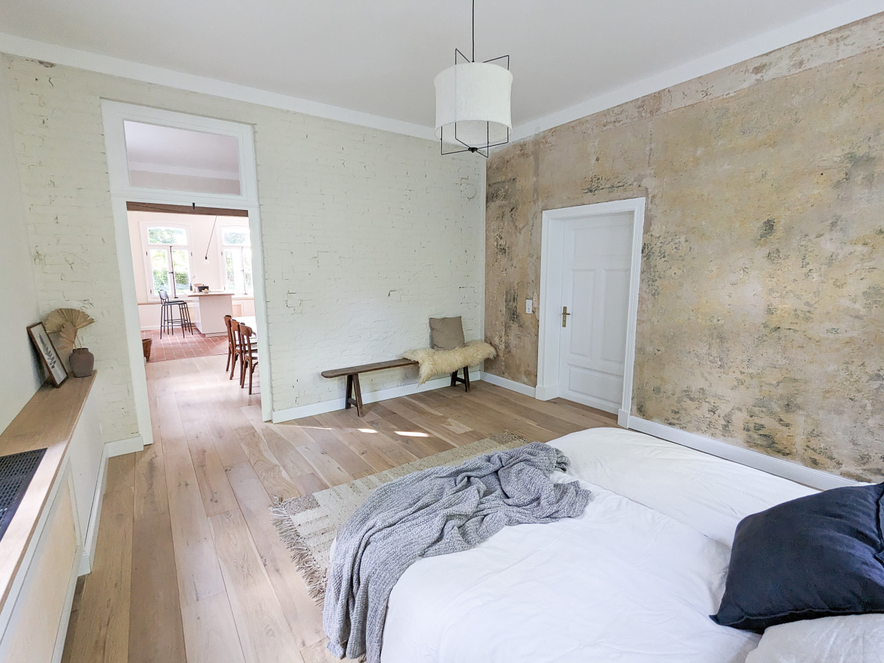 Inside, natural light floods minimalist, airy rooms through oversized windows and sheer curtains, accentuating textured white brick walls, smooth plaster, and a palette of white, greys, and soft earth tones. Open-plan living, dining, and kitchen spaces reveal a masterful interplay of materials: terrazzo and terracotta tiles, wooden beams, brushed metal, and sleek cabinetry. Thoughtfully staged vignettes—plush green sofas, woven chairs, sculptural vases, leafy plants, and curated wall art—evoke both drama and tranquility. The composition of contemporary furnishings, rustic layering, and playful children's spaces shapes an environment that is both welcoming and visually arresting—ideal for high-end editorial shoots, film sets, or immersive brand experiences.