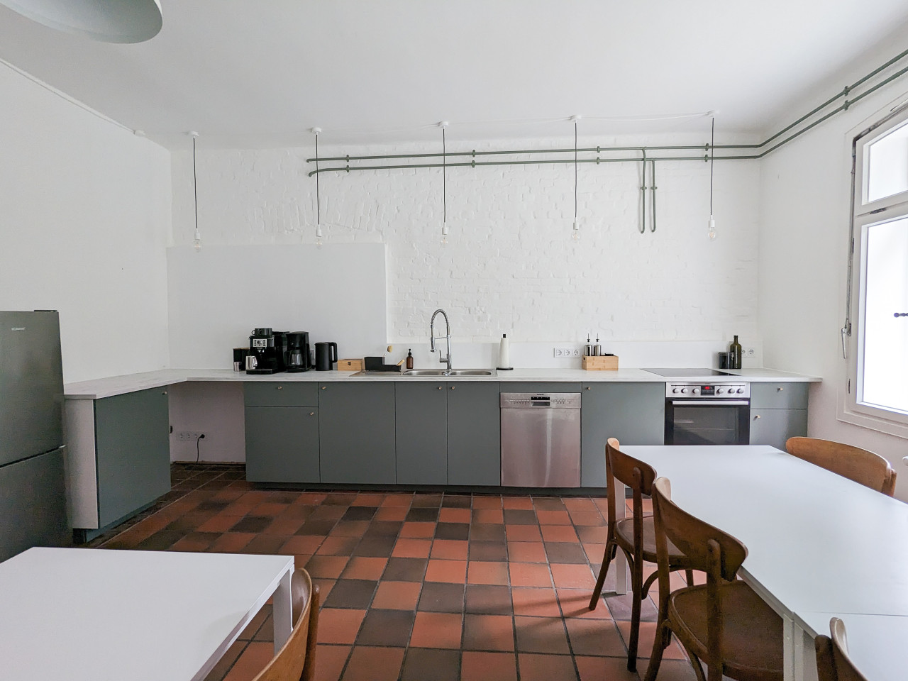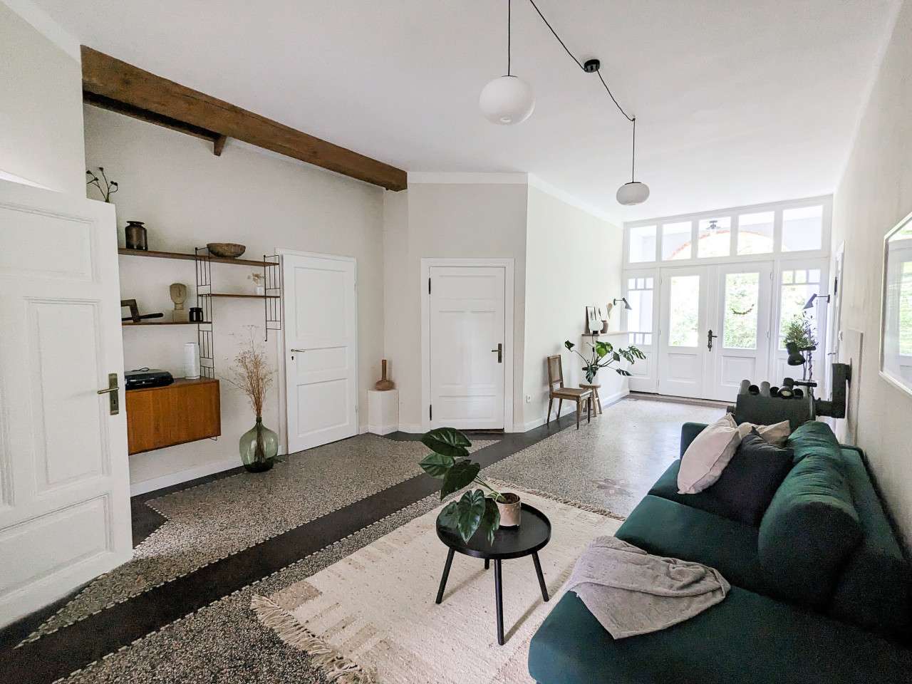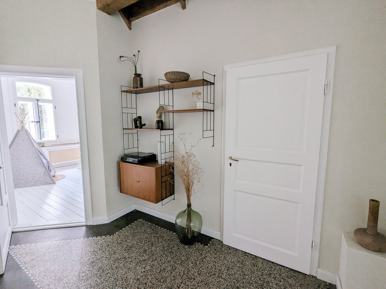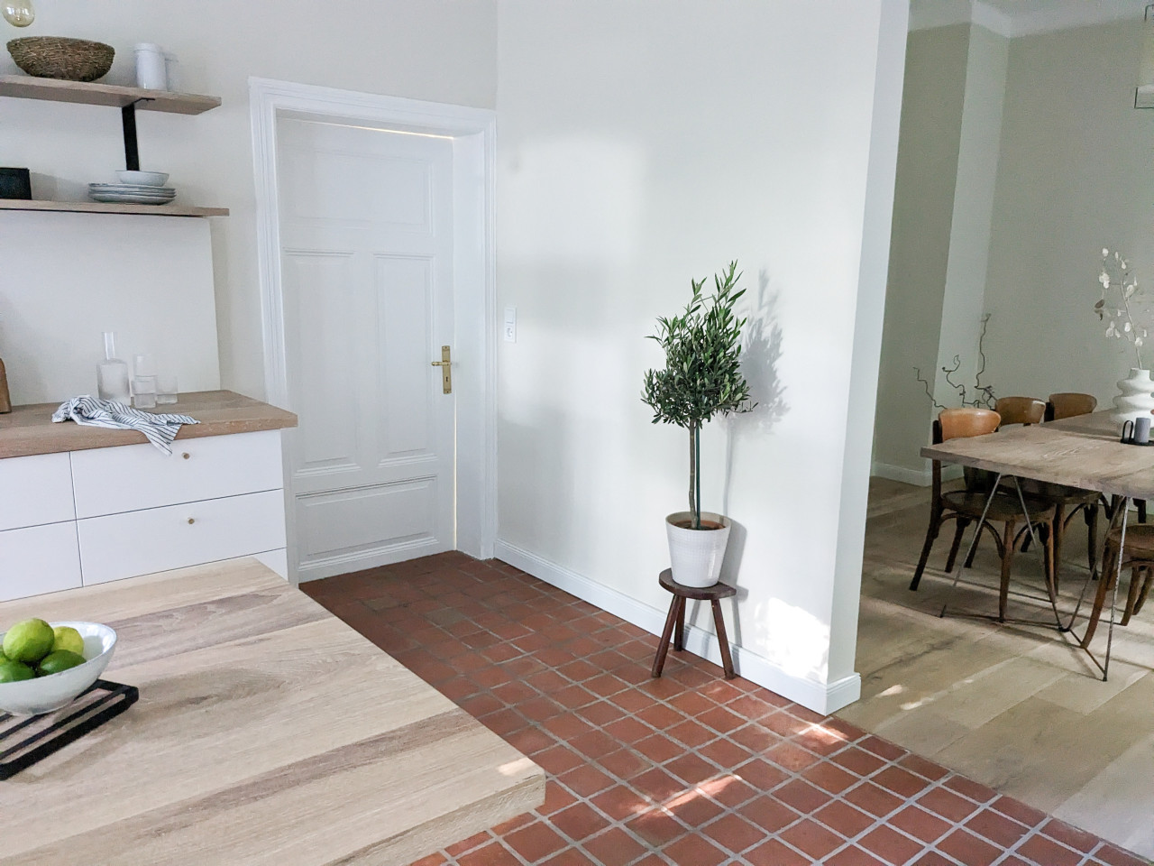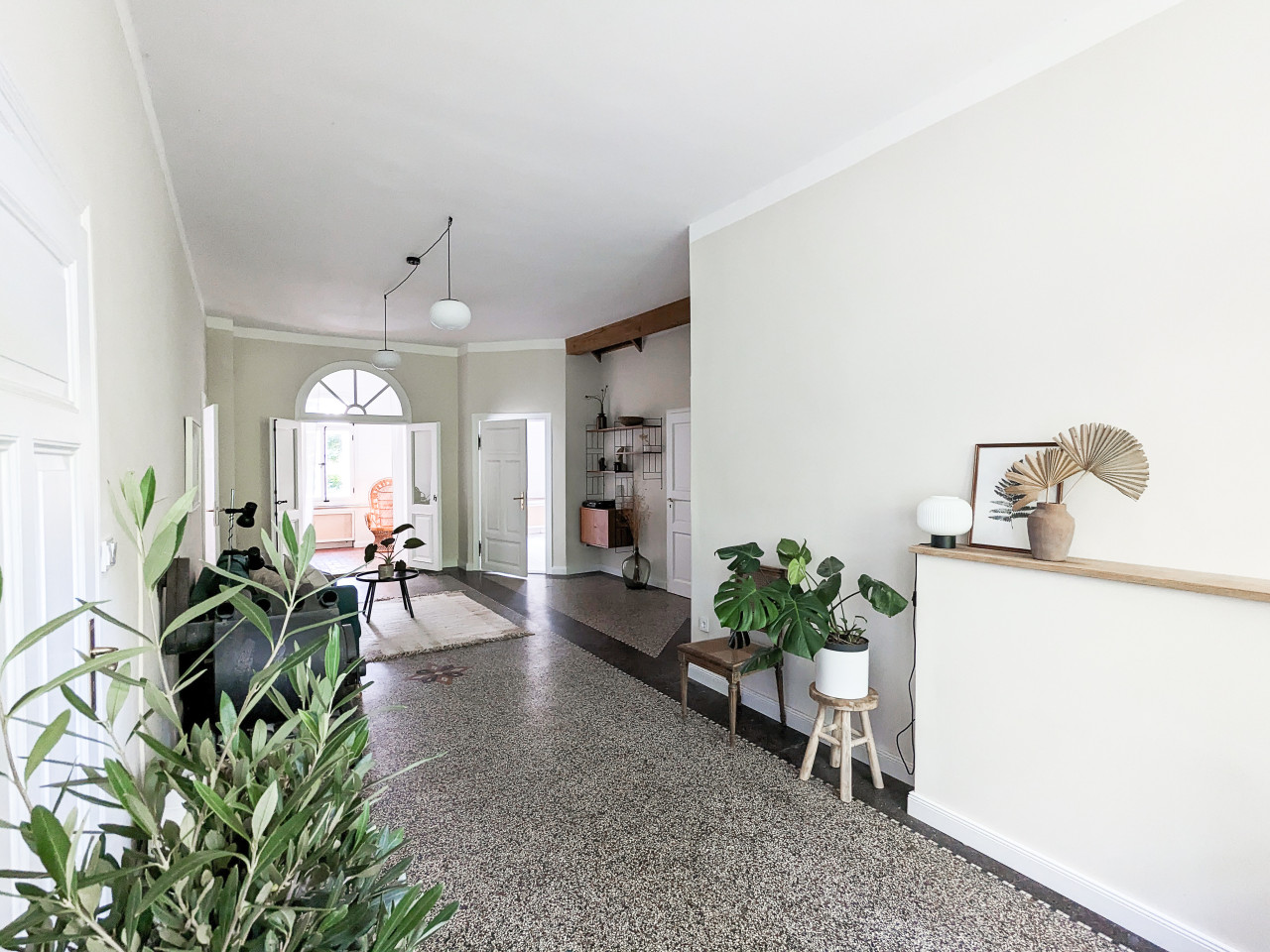 Inside, natural light floods minimalist, airy rooms through oversized windows and sheer curtains, accentuating textured white brick walls, smooth plaster, and a palette of white, greys, and soft earth tones. Open-plan living, dining, and kitchen spaces reveal a masterful interplay of materials: terrazzo and terracotta tiles, wooden beams, brushed metal, and sleek cabinetry. Thoughtfully staged vignettes—plush green sofas, woven chairs, sculptural vases, leafy plants, and curated wall art—evoke both drama and tranquility. The composition of contemporary furnishings, rustic layering, and playful children's spaces shapes an environment that is both welcoming and visually arresting—ideal for high-end editorial shoots, film sets, or immersive brand experiences.