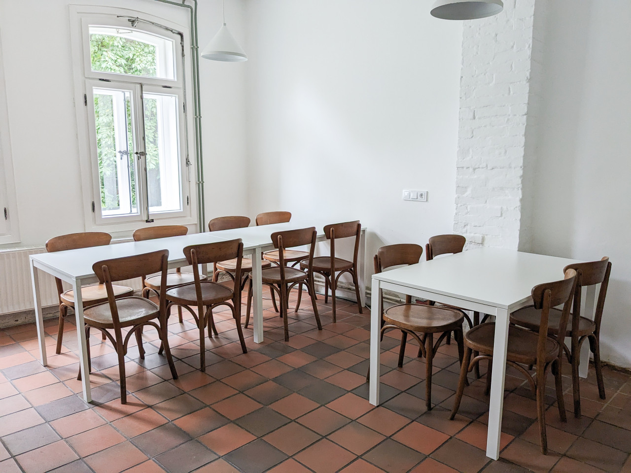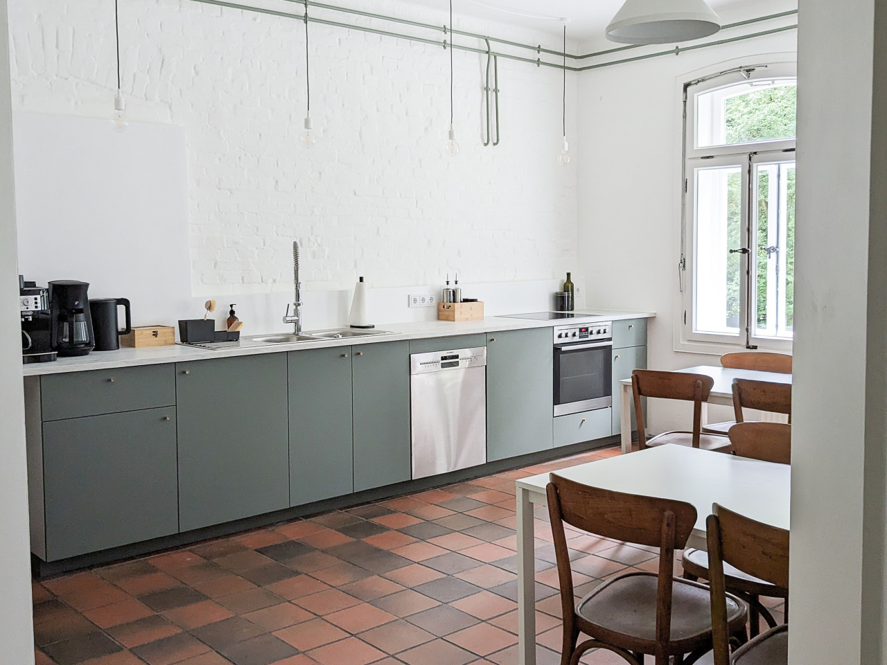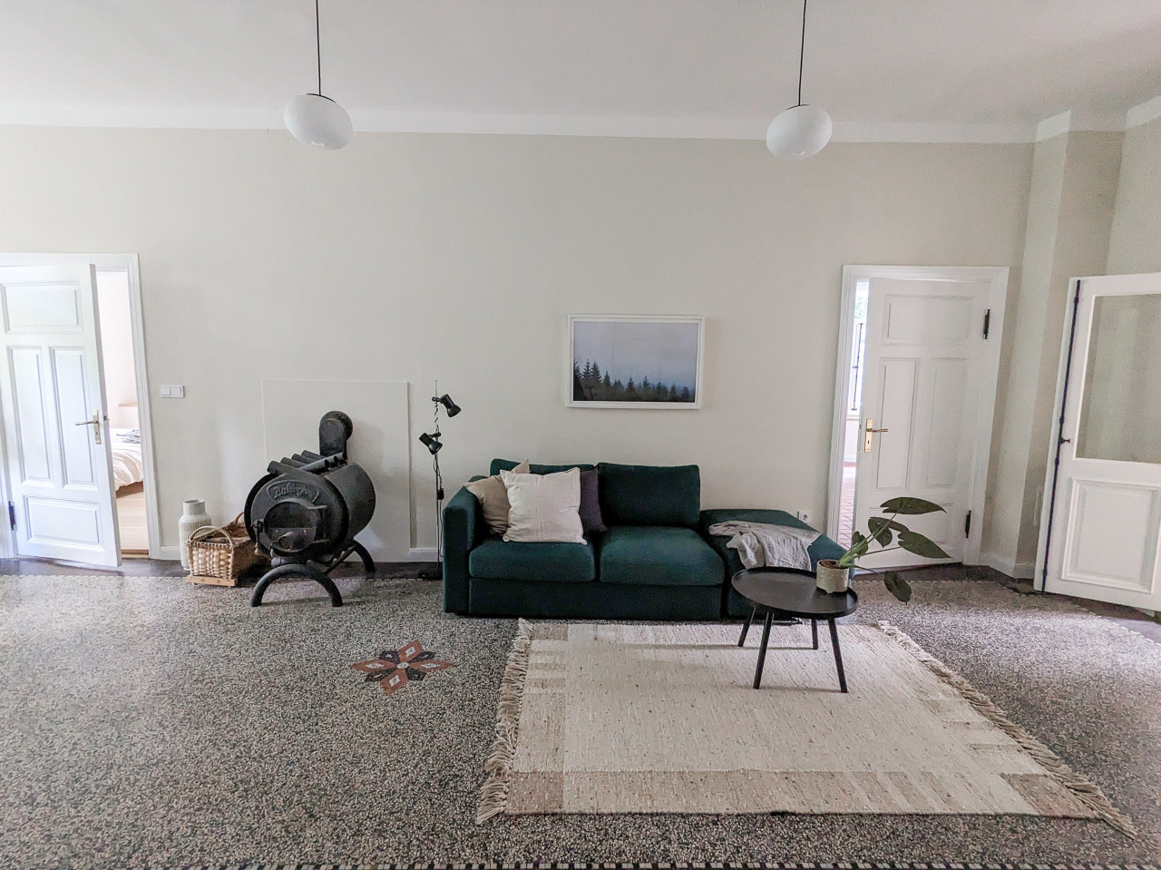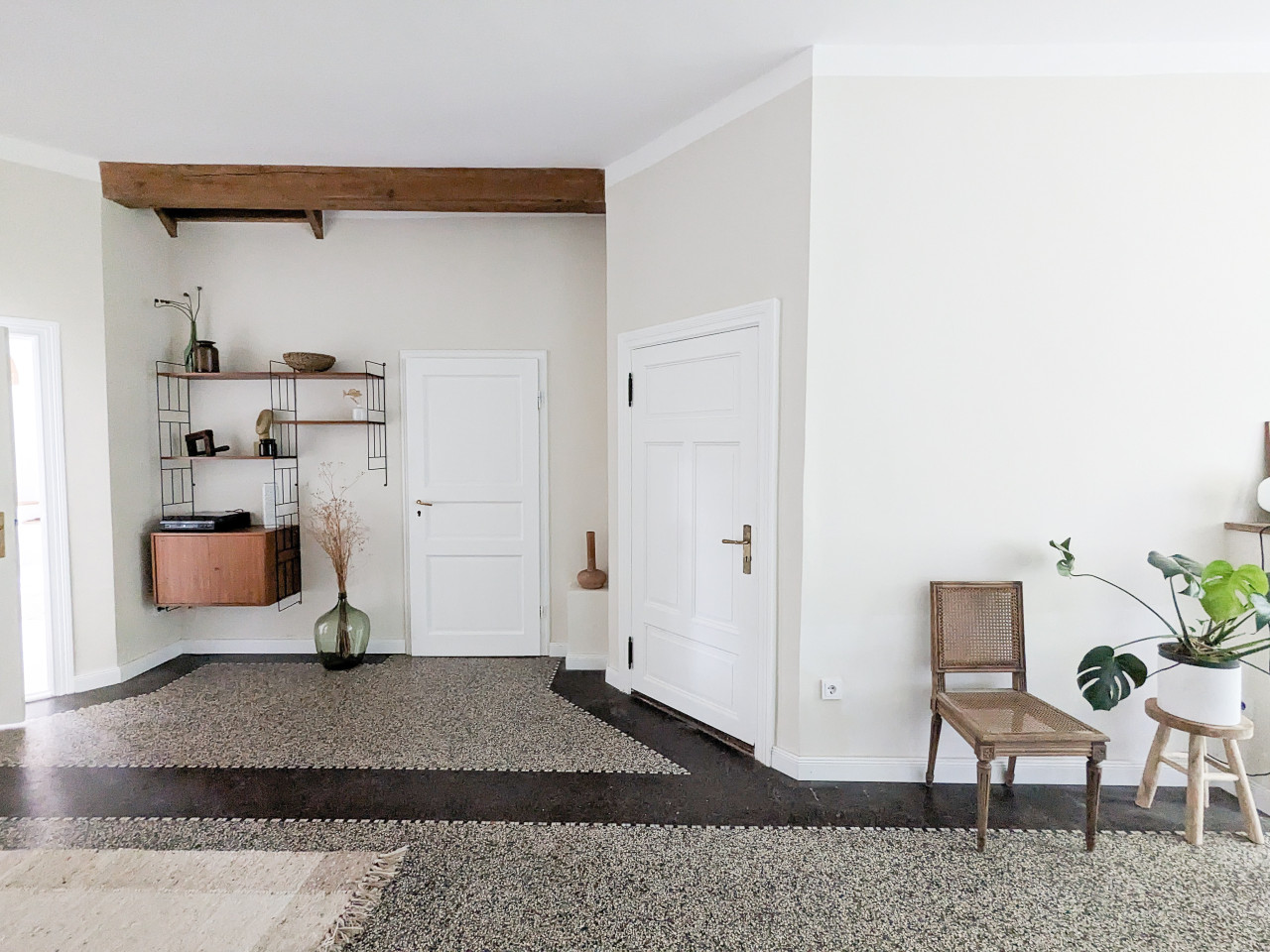 Inside, natural light floods minimalist, airy rooms through oversized windows and sheer curtains, accentuating textured white brick walls, smooth plaster, and a palette of white, greys, and soft earth tones. Open-plan living, dining, and kitchen spaces reveal a masterful interplay of materials: terrazzo and terracotta tiles, wooden beams, brushed metal, and sleek cabinetry. Thoughtfully staged vignettes—plush green sofas, woven chairs, sculptural vases, leafy plants, and curated wall art—evoke both drama and tranquility. The composition of contemporary furnishings, rustic layering, and playful children's spaces shapes an environment that is both welcoming and visually arresting—ideal for high-end editorial shoots, film sets, or immersive brand experiences.