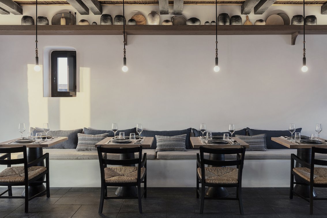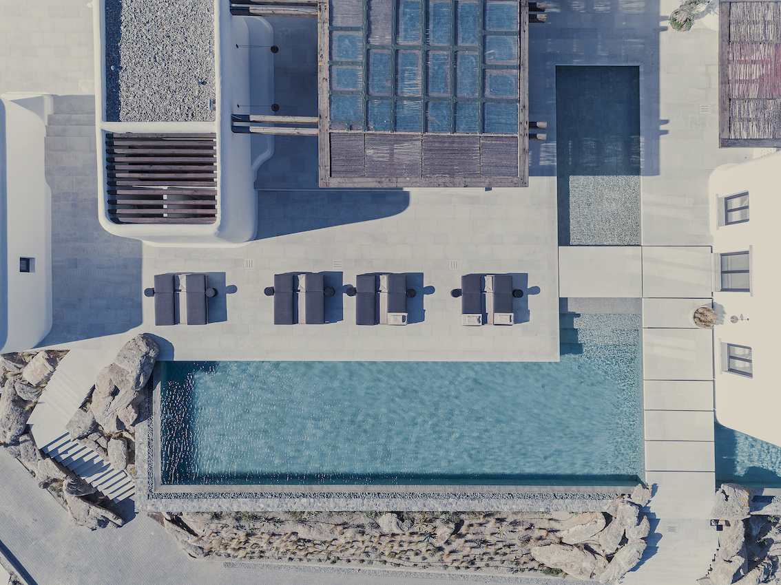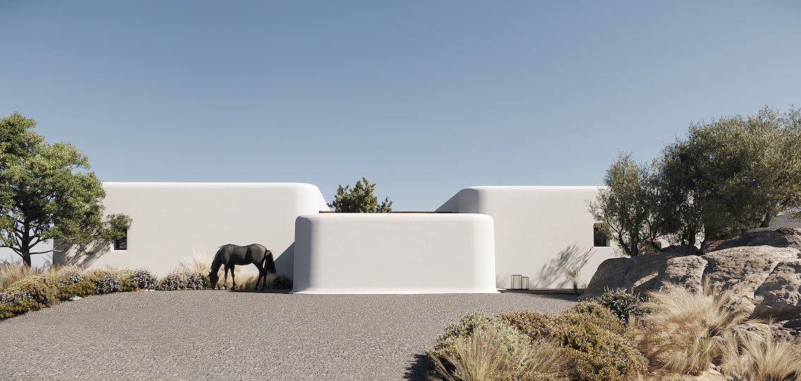 Abbracciando la bellezza grezza dell'arido paesaggio roccioso e del mare blu scuro, e ispirandoci alla semplice onestà del vernacolo dell'isola, abbiamo progettato un "villaggio" di monolocali e ville imbiancate a calce e sparse, come pixel nel paesaggio, intorno a una "plateia" centrale o spazio comune. Situato sulla spina dorsale di una collina nella parte nord-occidentale dell'isola, gode di una posizione unica per godere della vista sia dell'alba a est che del tramonto a ovest. Le aree sociali comuni, l'area benessere e la boutique sono situate nella parte più alta del sito, per garantire che questi panorami possano essere apprezzati da ogni ospite mentre si rilassa, nuota in piscina o cena sulla terrazza. Nelle vicinanze, un tradizionale "Aloni" in pietra, una struttura circolare utilizzata per la macinazione del grano in farina, è stato conservato e riutilizzato come piattaforma meditativa da cui ammirare il tramonto.