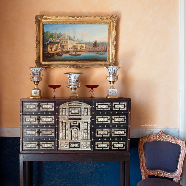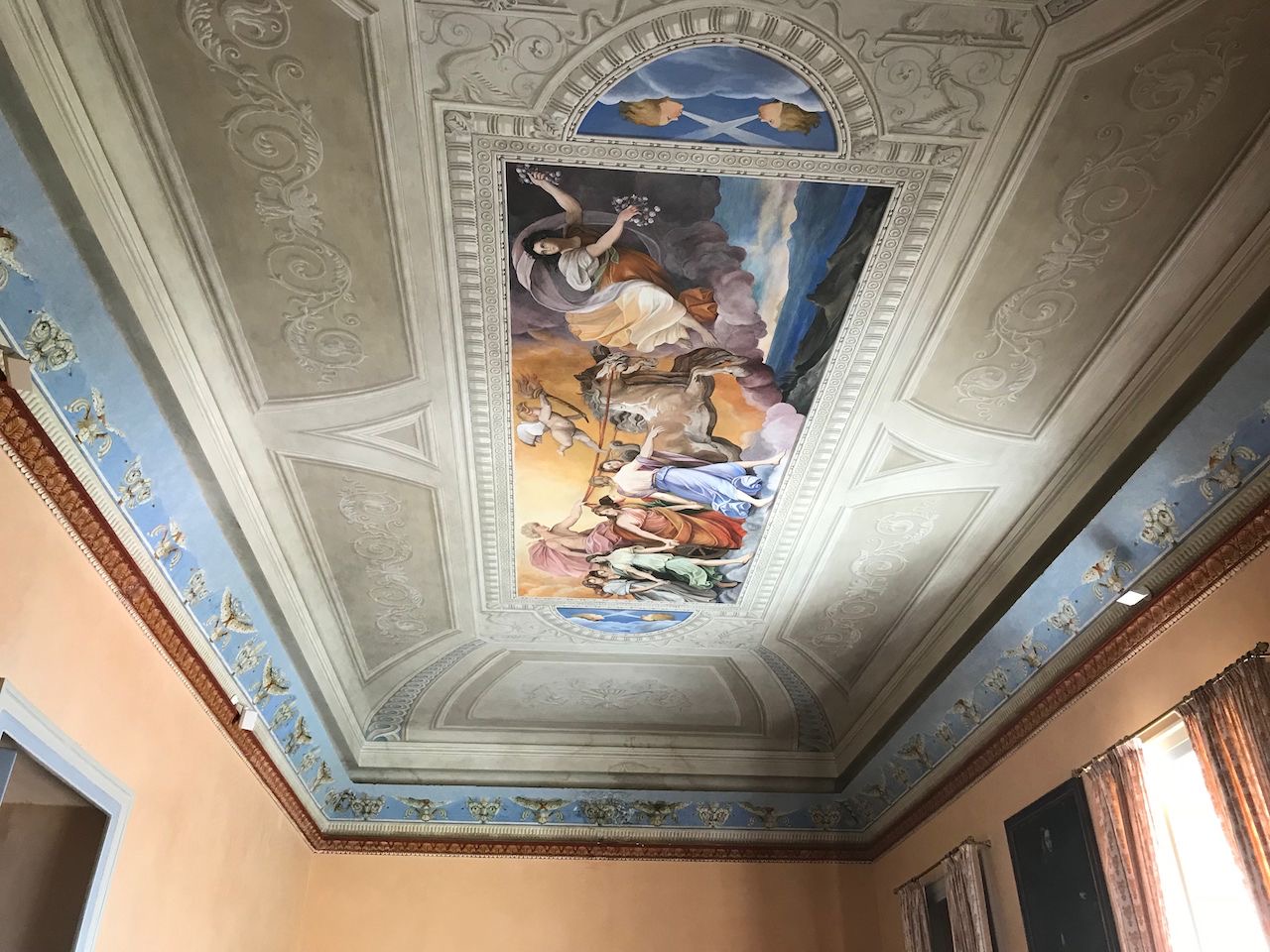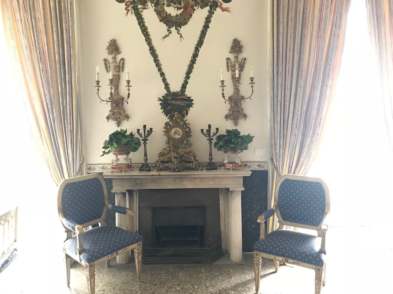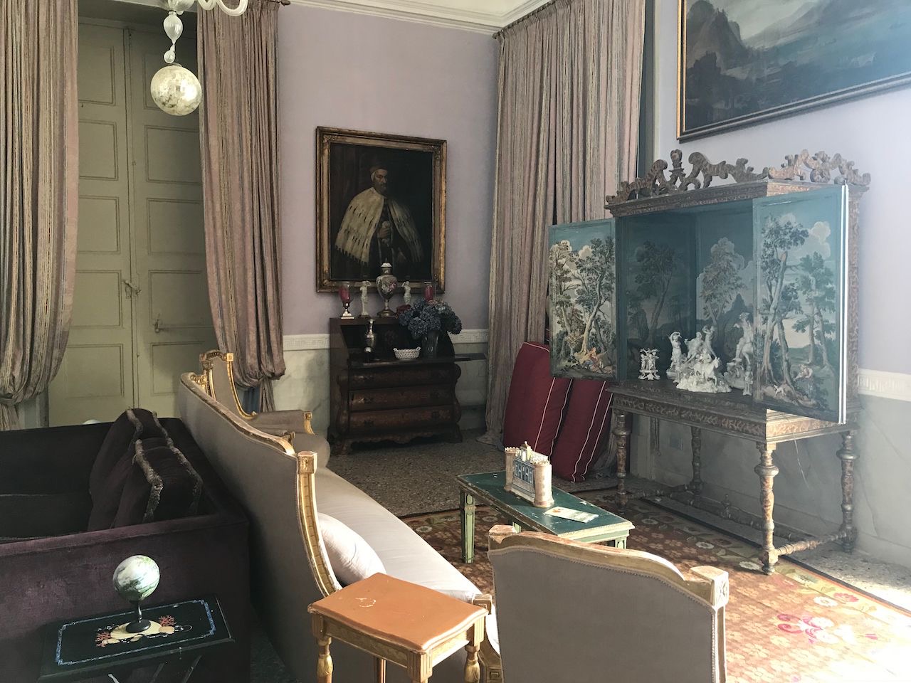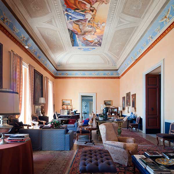 Gli interni sono una masterclass di eleganza classica italiana, con soffitti affrescati, lampadari antichi, specchi dorati e mobili d'epoca. Molteplici stanze includono divani riccamente imbottiti, dettagli in legno intagliato e pareti in stile galleria foderate di quadri e cornici, ideali per scene di dialogo, ritratti editoriali o composizioni di moda stilizzate. L'atmosfera è nobile, calda e ricca di texture stratificate.