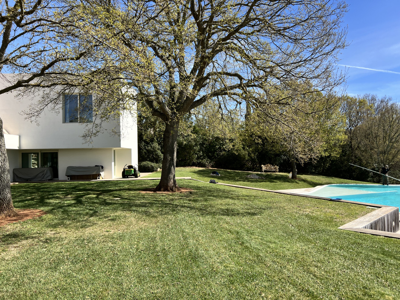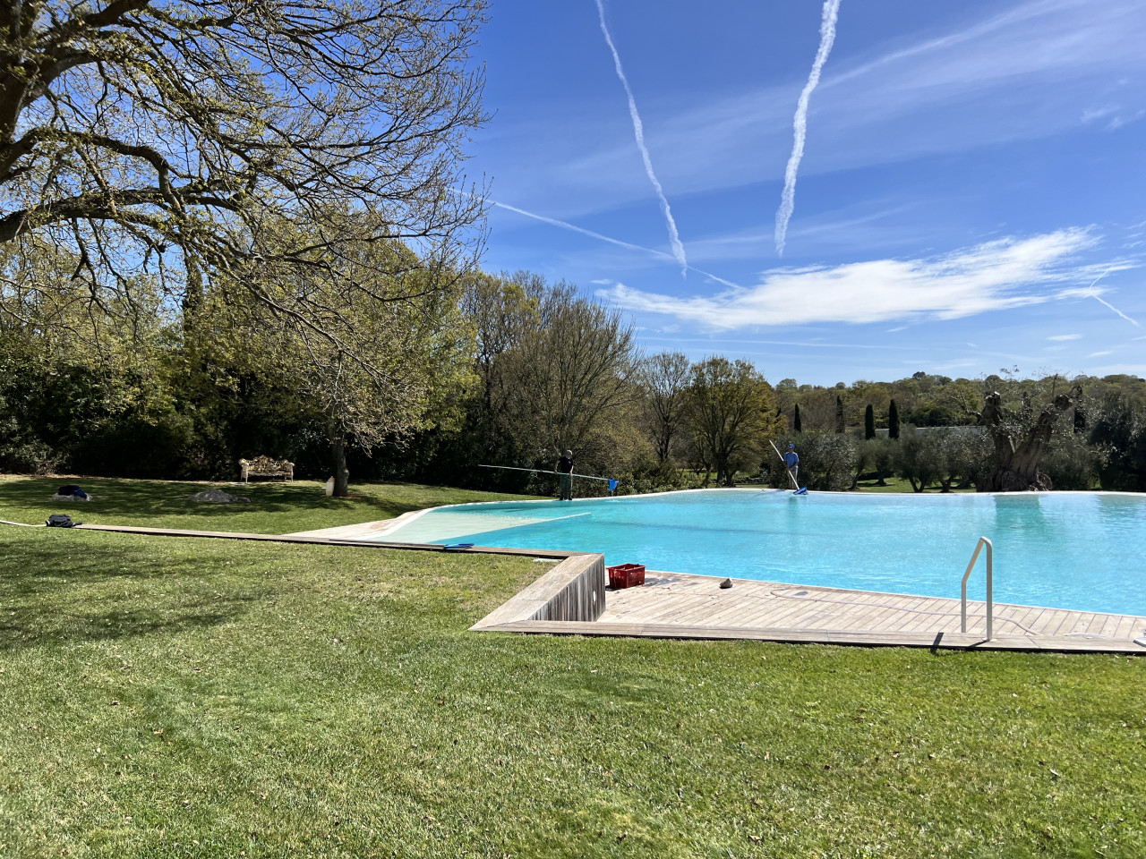 L'area della piscina all'aperto, incorniciata da alberi maturi e prati rigogliosi, esalta l'atmosfera rilassata e lussuosa della tenuta, perfetta per le riprese estive, i video musicali o gli eleganti incontri privati.