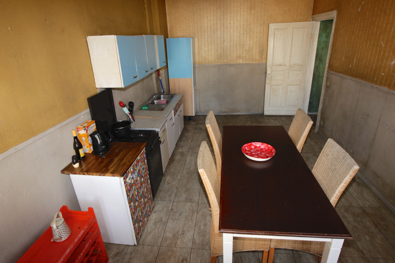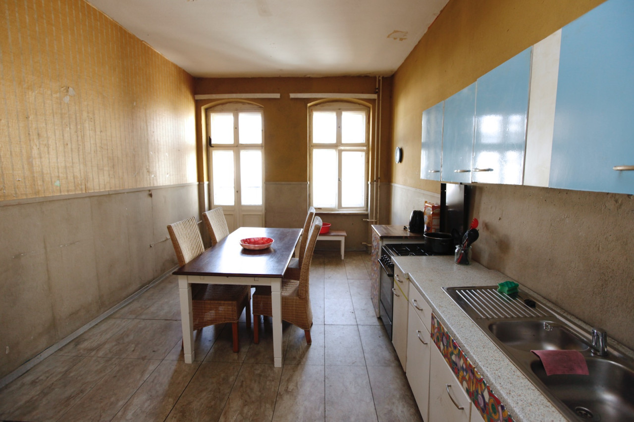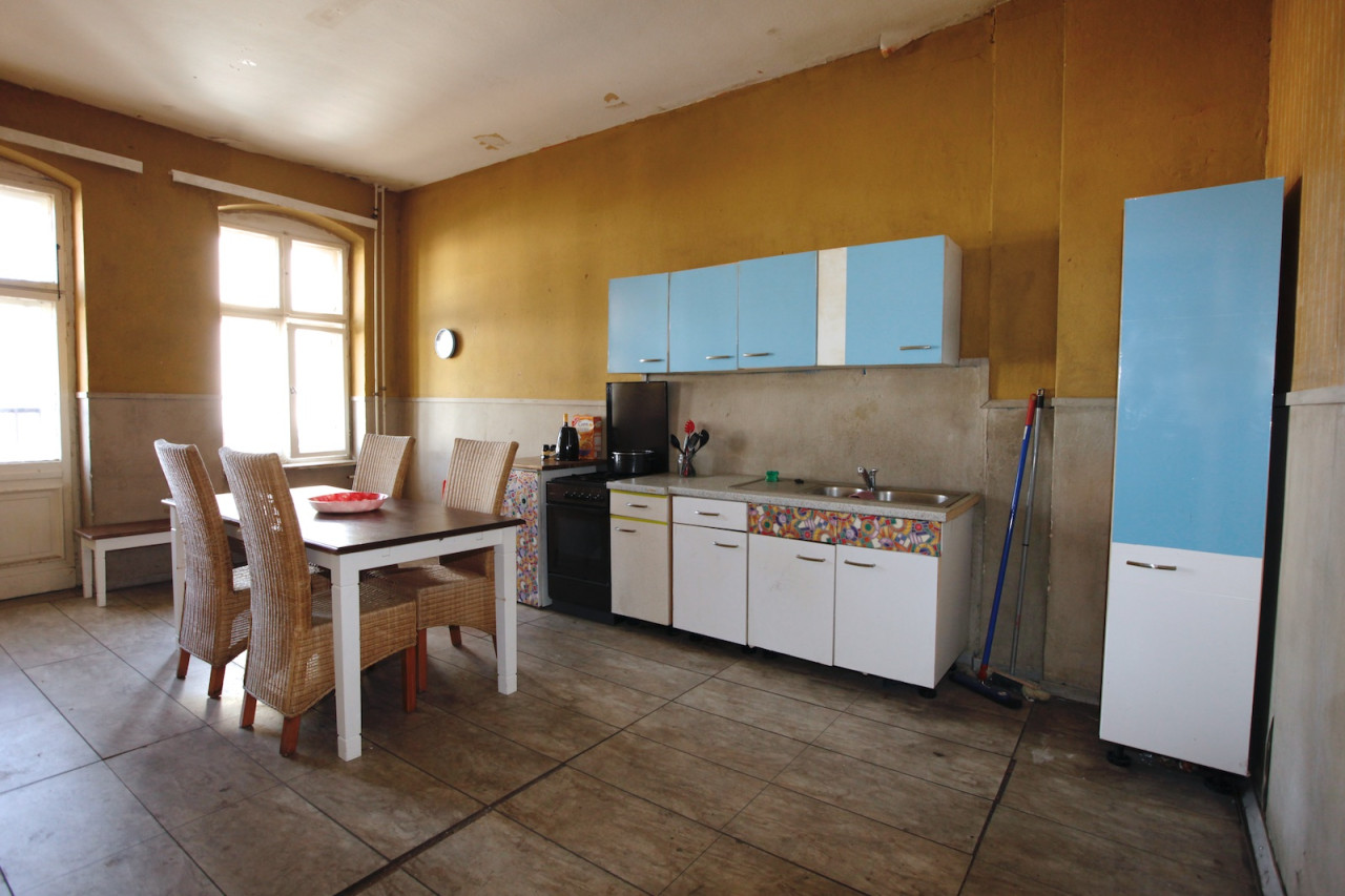 Questa grande cucina offre molto spazio per ogni tipo di produzione. Le pareti sono dipinte e tappezzate in blu notte e in una calda tonalità arancione, con un aspetto caratteristico e una storia tutta sua.